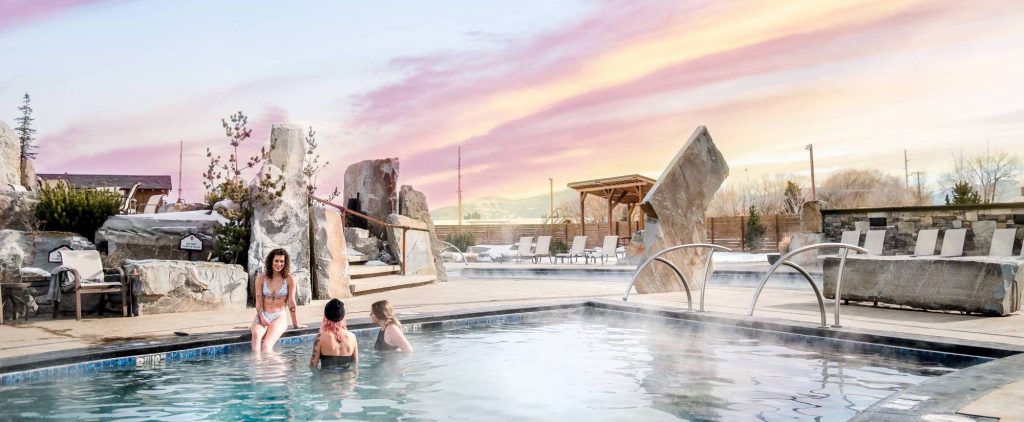 Nestled on the banks of the Yellowstone River in the Paradise Valley, Yellowstone Hot Springs is one of the most scenic places to soak near Big Sky with three mineral rich pools to experience the full benefits of the therapeutic waters – a cold plunge pool in the 60s, a main pool in the high 90s, and a hot soaking pool at 103-105 degrees.