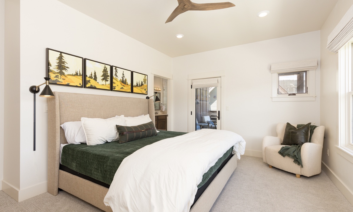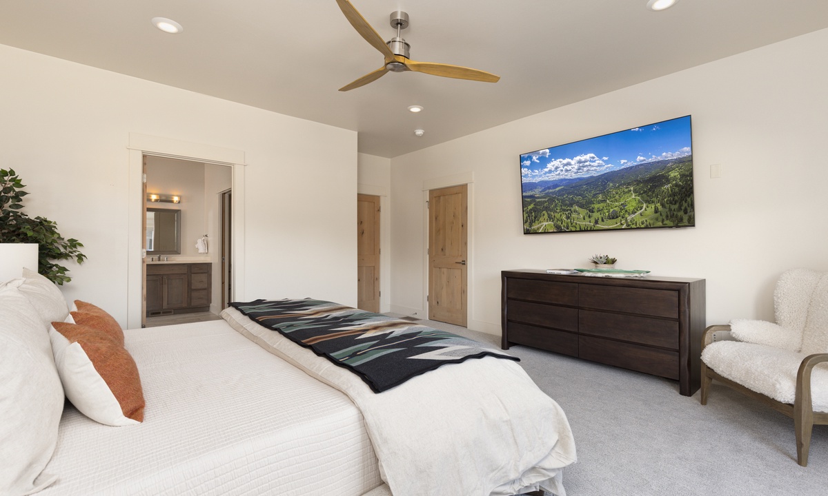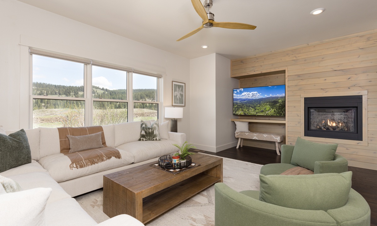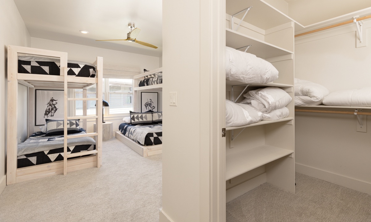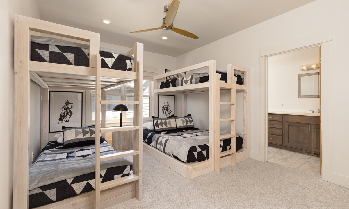 Upstairs, the Primary King Suite includes plush bedding, a flat screen TV, an oversized walk-in closet, and an ensuite bathroom with dual vanities, a soaking tub, and a stand-up shower, plus the private deck off this suite provides an amazing view of Lone Peak. The Second King Suite features plush bedding, a walk-in closet, and mountain views, with an ensuite bathroom showcasing dual vanities and a stand-up shower. This suite boasts a private deck with outdoor seating and a propane fire pit. The Bunk Suite is designed for younger guests, furnished with a Twin/Twin bunk bed and a Twin/Queen bunk bed. Its ensuite bathroom includes dual vanities and a shower/tub combo. A dedicated reading nook with luxe leather bean bag chairs adds a cozy touch.
