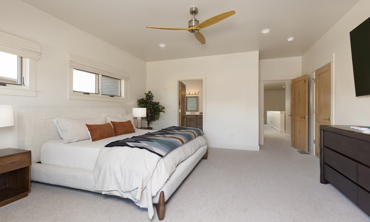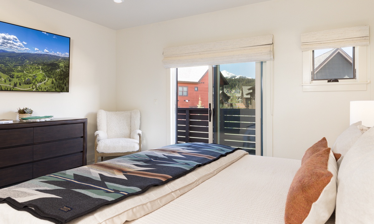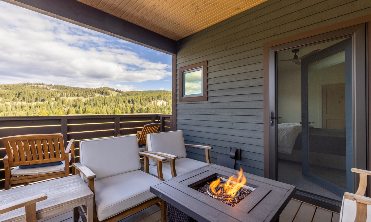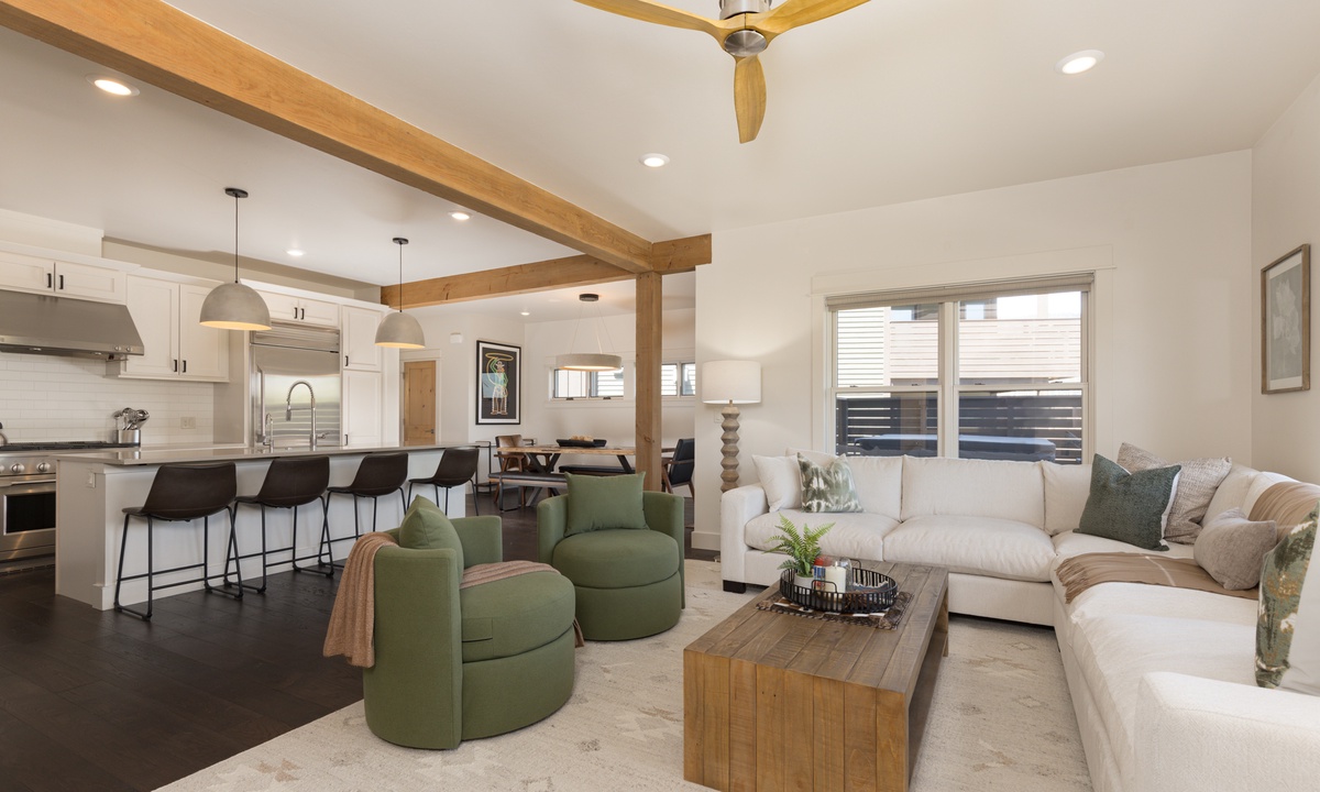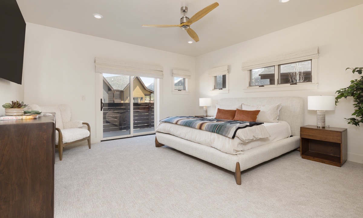 Upstairs, the Primary King Suite includes plush bedding, a flat screen TV, an oversized walk-in closet, and an ensuite bathroom with dual vanities, a soaking tub, and a stand-up shower, plus the private deck off this suite provides an amazing view of Lone Peak. The Second King Suite features plush bedding, a walk-in closet, and mountain views, with an ensuite bathroom showcasing dual vanities and a stand-up shower. This suite boasts a private deck with outdoor seating and a propane fire pit. The Bunk Suite is designed for younger guests, furnished with a Twin/Twin bunk bed and a Twin/Queen bunk bed. Its ensuite bathroom includes dual vanities and a shower/tub combo. A dedicated reading nook with luxe leather bean bag chairs adds a cozy touch.