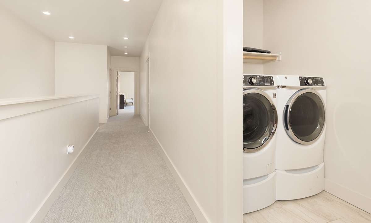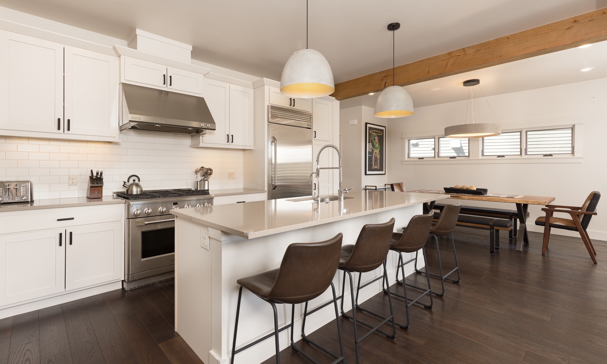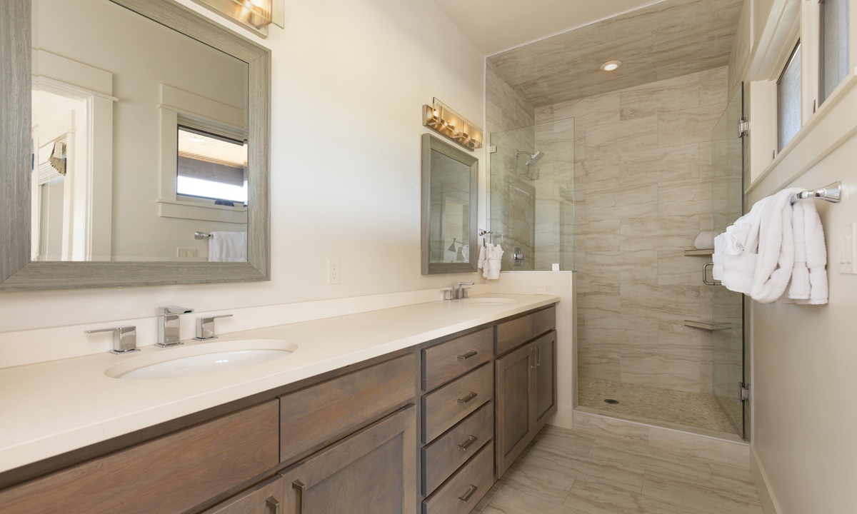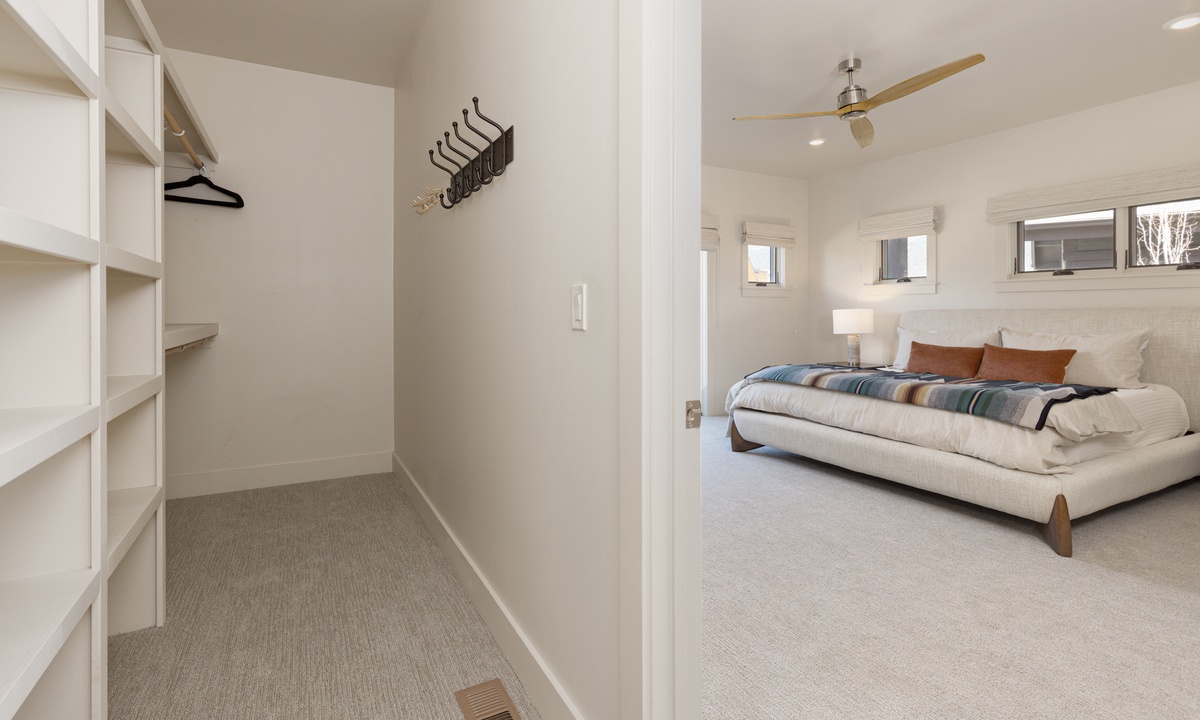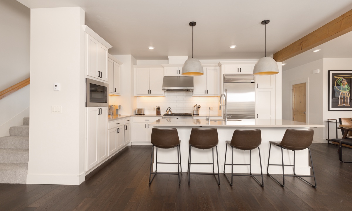 Upstairs, the Primary King Suite includes plush bedding, a flat screen TV, an oversized walk-in closet, and an ensuite bathroom with dual vanities, a soaking tub, and a stand-up shower, plus the private deck off this suite provides an amazing view of Lone Peak. The Second King Suite features plush bedding, a walk-in closet, and mountain views, with an ensuite bathroom showcasing dual vanities and a stand-up shower. This suite boasts a private deck with outdoor seating and a propane fire pit. The Bunk Suite is designed for younger guests, furnished with a Twin/Twin bunk bed and a Twin/Queen bunk bed. Its ensuite bathroom includes dual vanities and a shower/tub combo. A dedicated reading nook with luxe leather bean bag chairs adds a cozy touch.