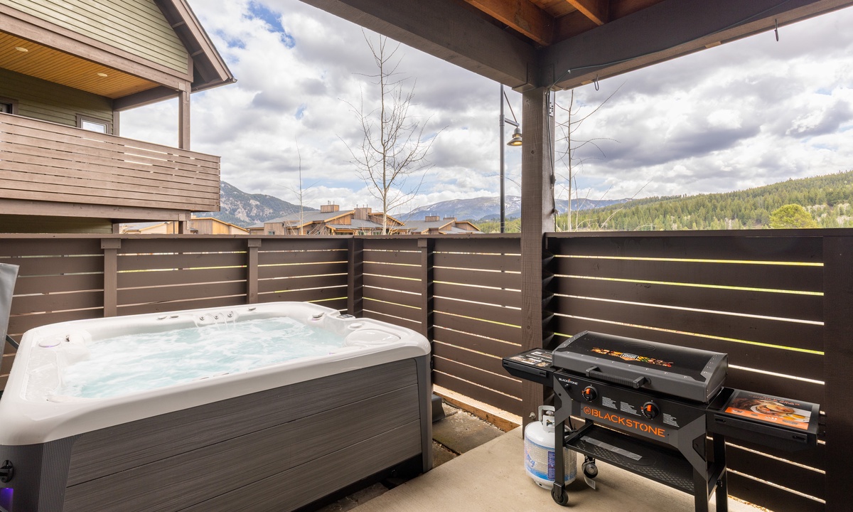 The spacious main level features an open concept living area with a gourmet kitchen equipped with high-end stainless steel appliances and granite countertops. The dining area seats eight, with additional seating for four at the breakfast bar. The adjacent living room boasts a cozy wrap around sectional sofa, a gas fireplace, and a large flat screen TV. Sliding glass doors lead to a deck with a Blackstone grill and a private hot tub, offering expansive mountain views.