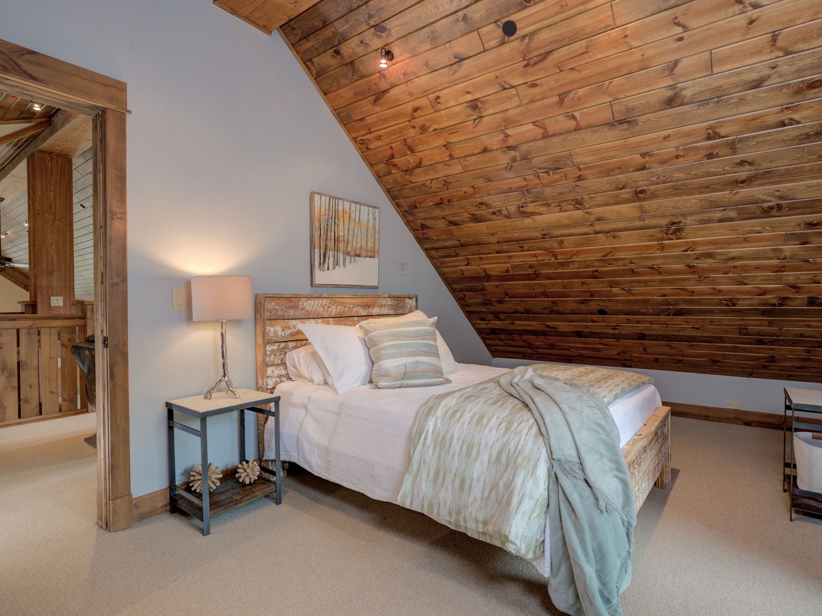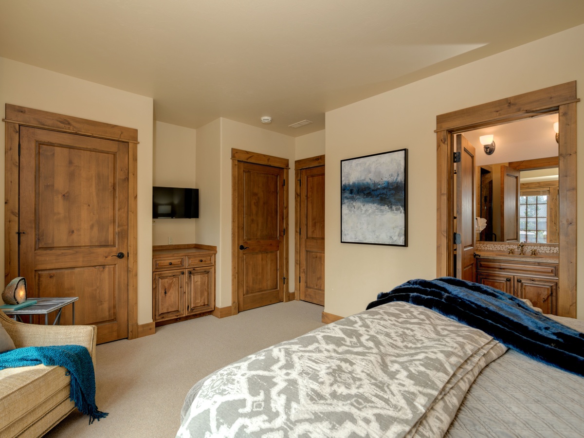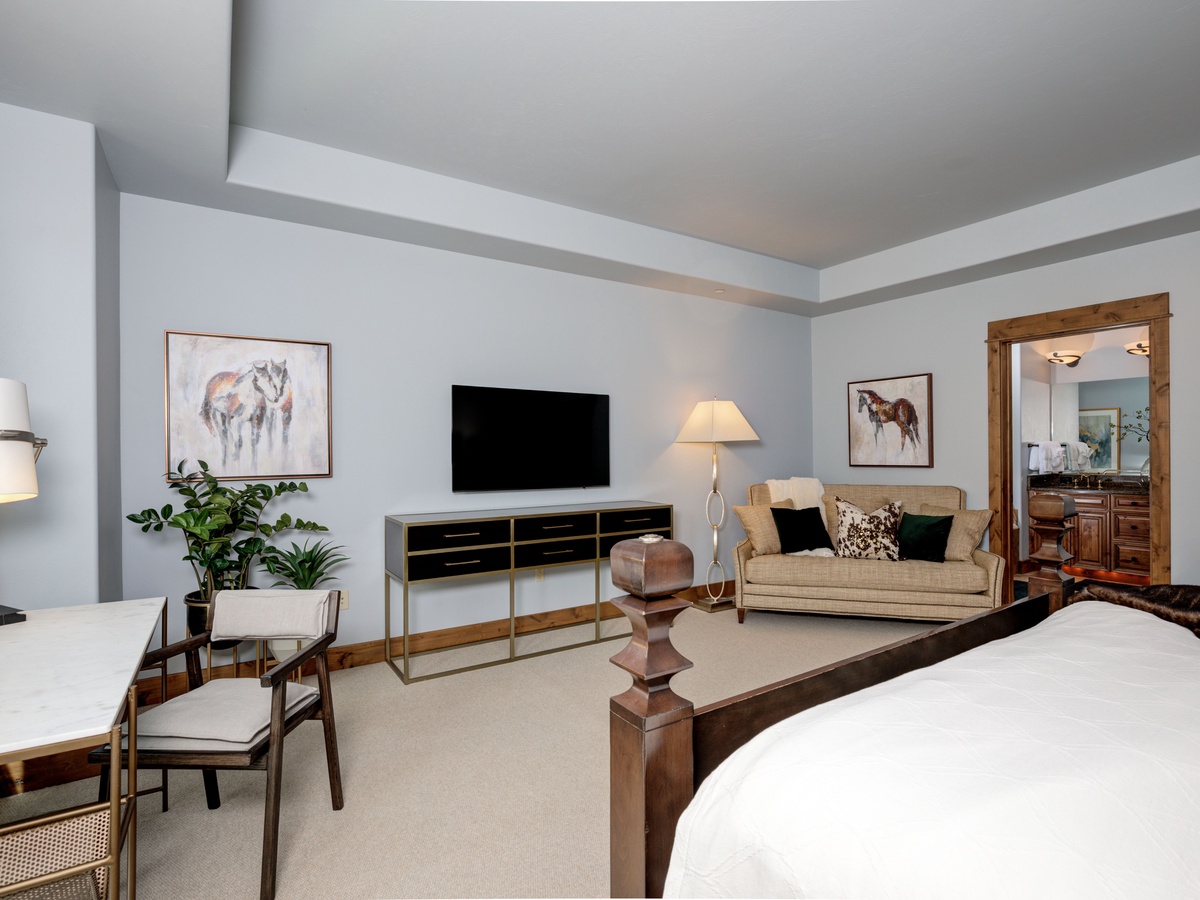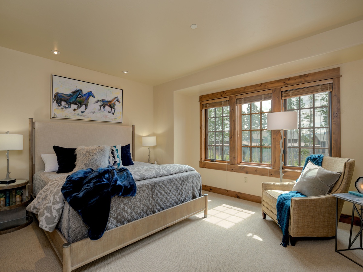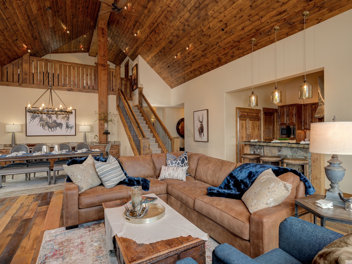 This 3,500 sq ft luxury suite has ample to space to comfortably sleep 15 guests with three en-suite bedrooms on the main level and an upper-level loft room with private balcony and beautifully framed views of Lone Peak.