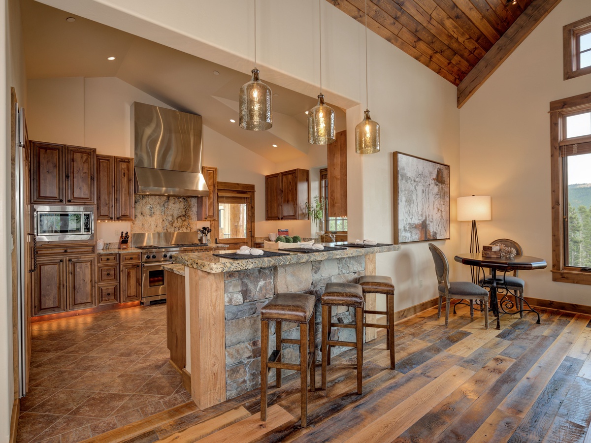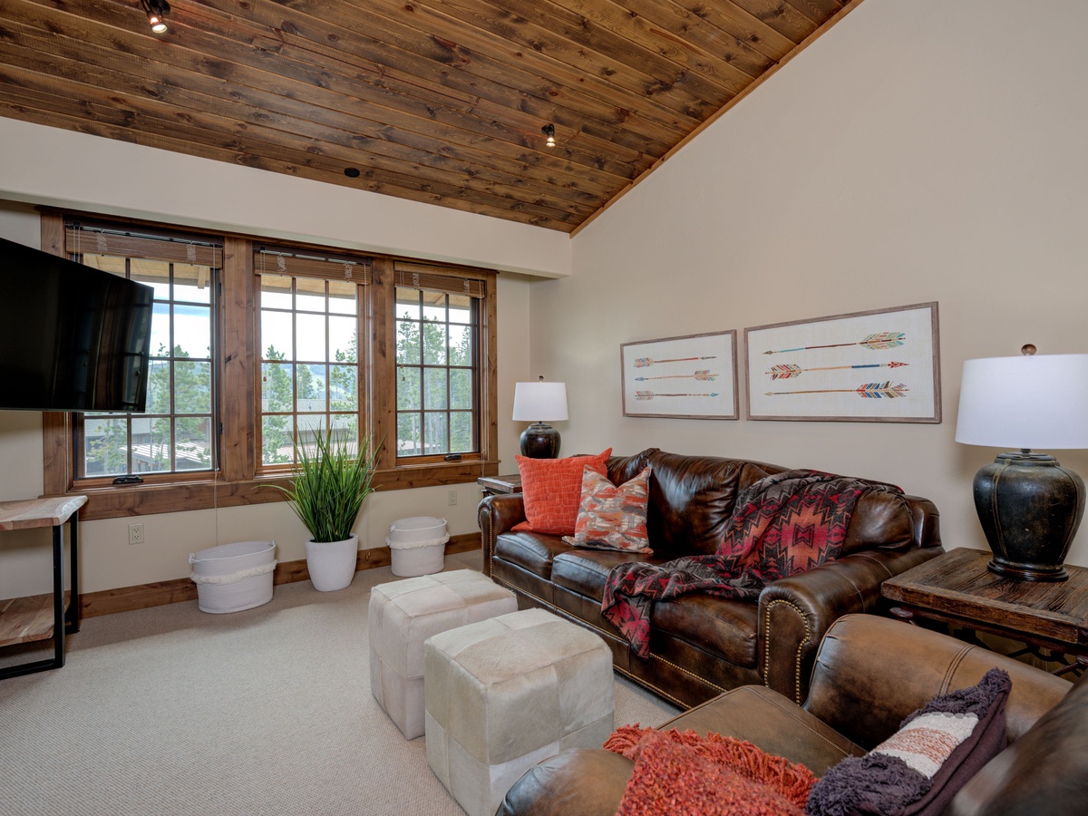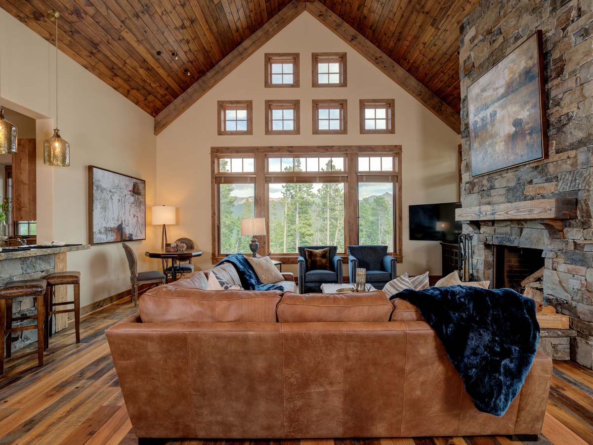Luxury abounds in this top-floor unit with vaulted ceilings, large wooden windows that frame the evergreens and exclusive elegant interiors boasting all the comforts of home and more. The great room and deck offer an amazing space for entertaining with a gourmet kitchen, high-end appliances, and plenty of space to gather for a social meal. Whether you're huddled around the indoor fire, roasting smores at the outdoor fire, or hot tubbing under the stars you'll be happy to apres ski here at home.