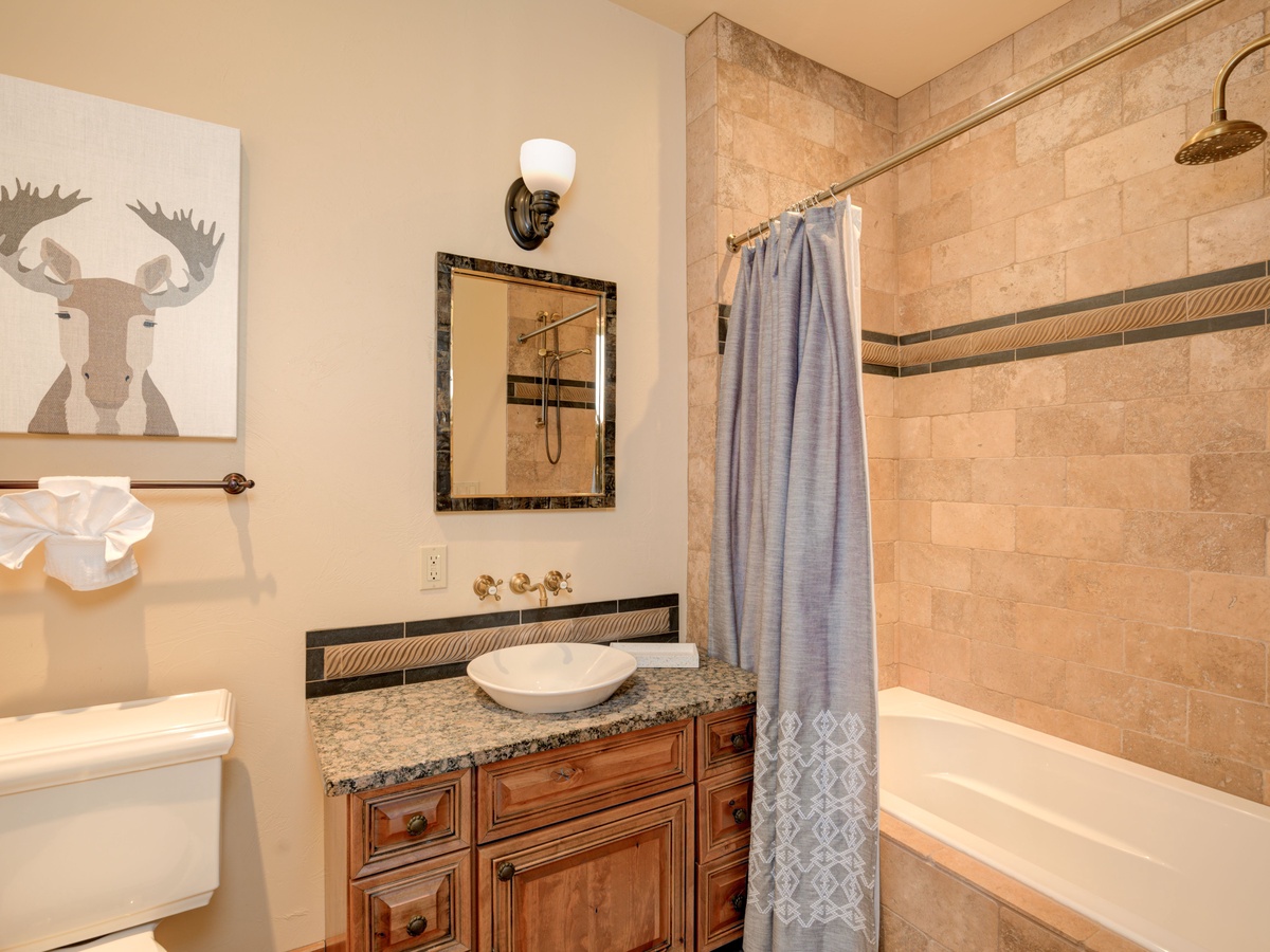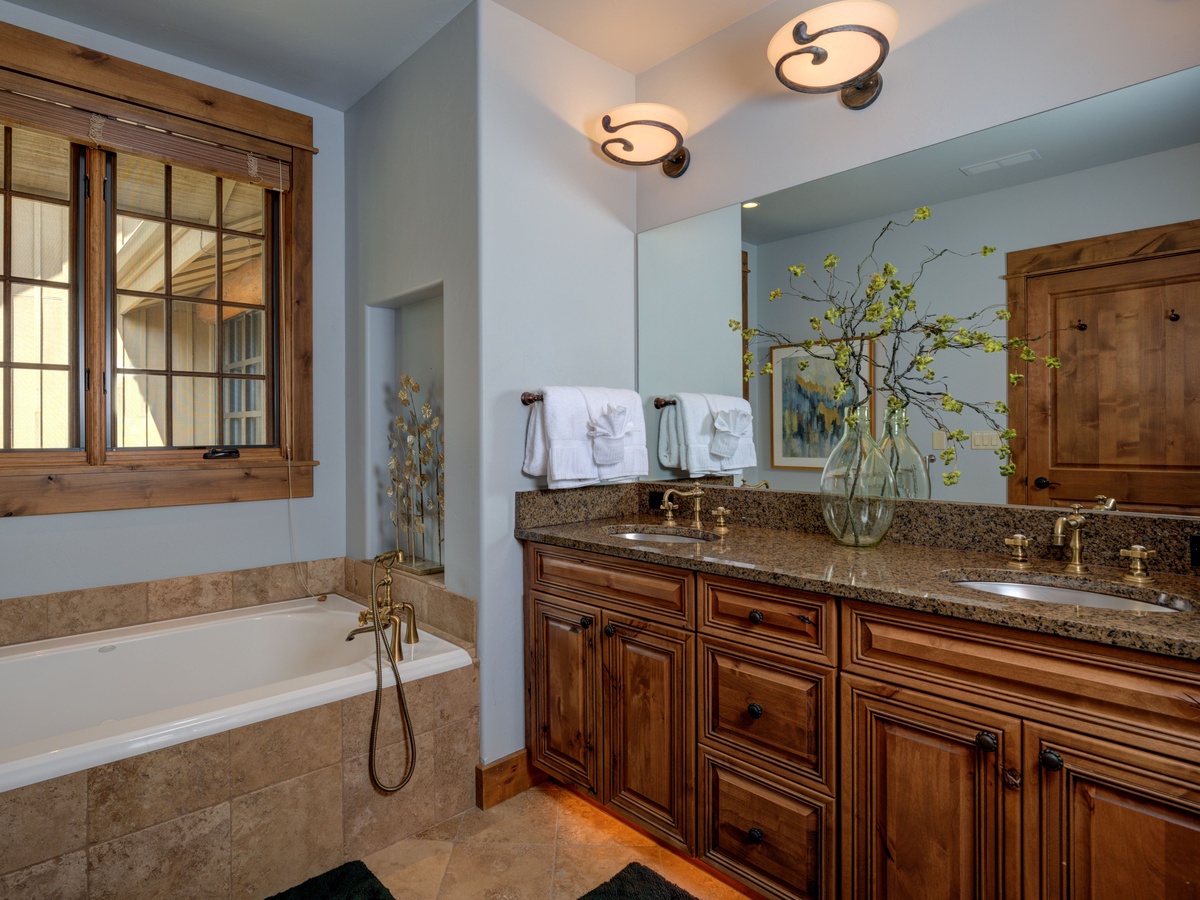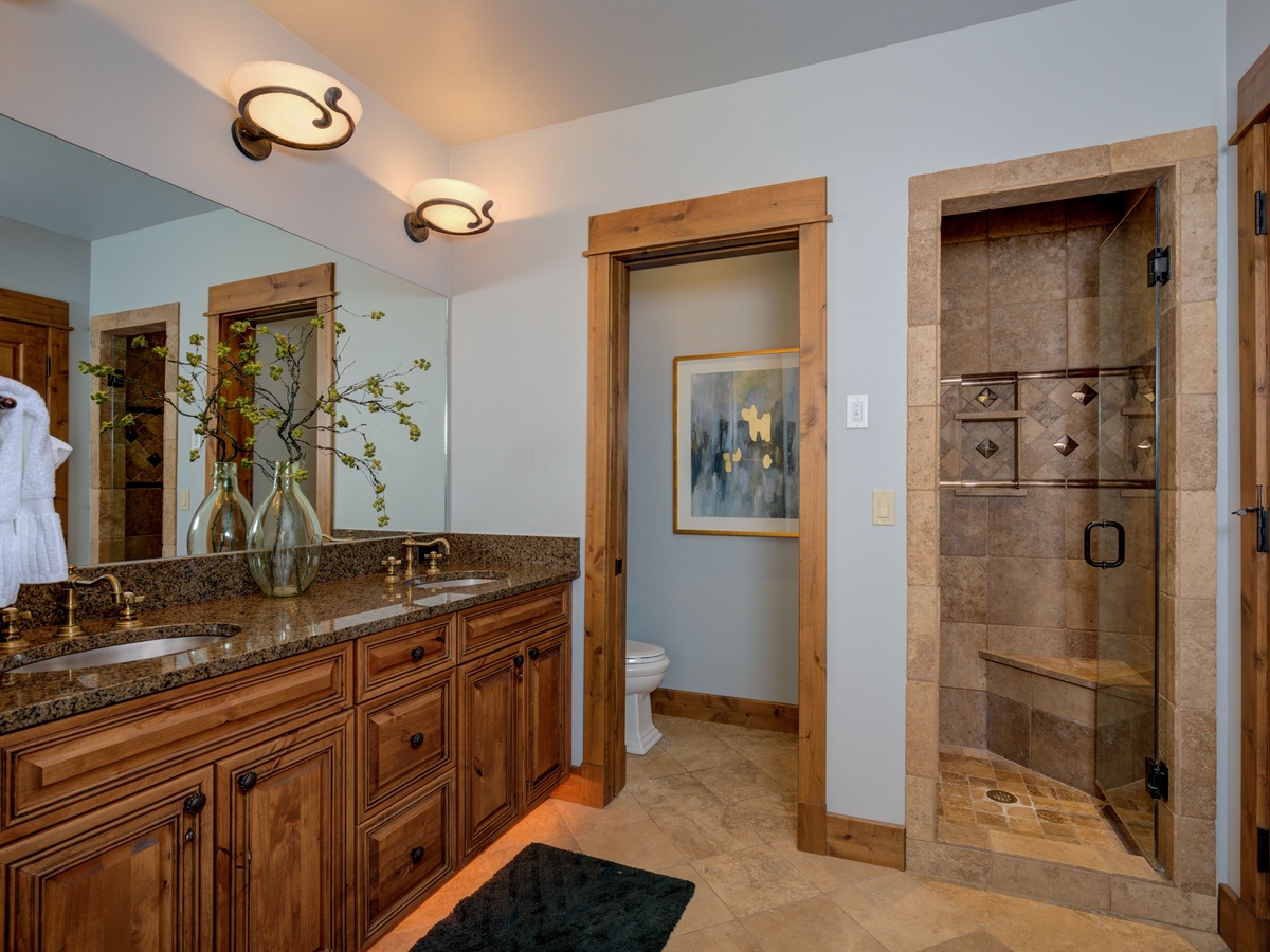 Bedroom 1- King bed | private full bath, walk-in shower and soaking tub, toilet, sink | main level