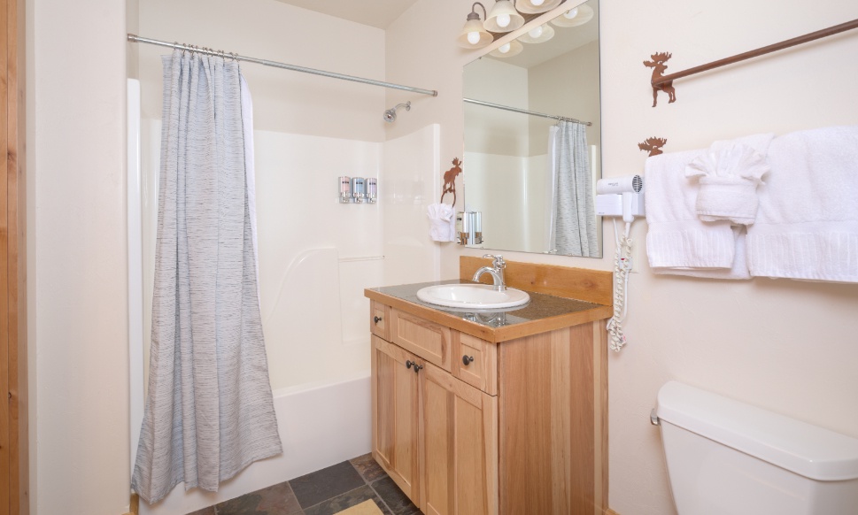 Bedroom 1- Queen bed | shared full bath, shower/tub, toilet, sink | main level