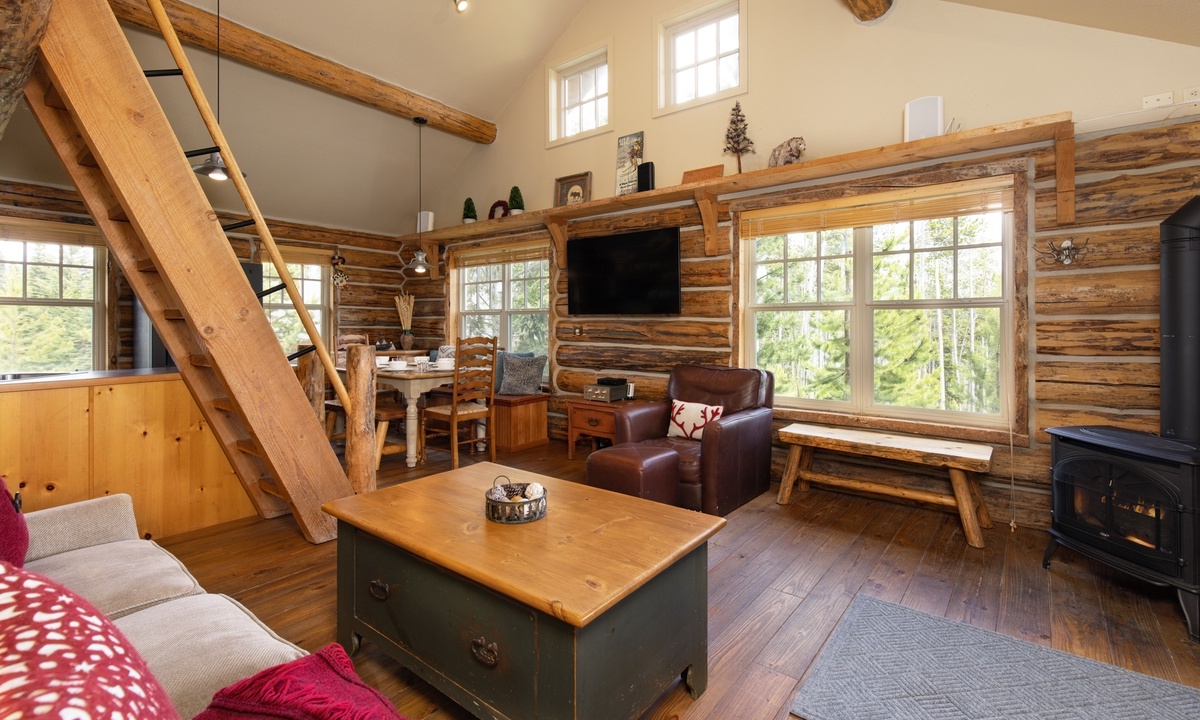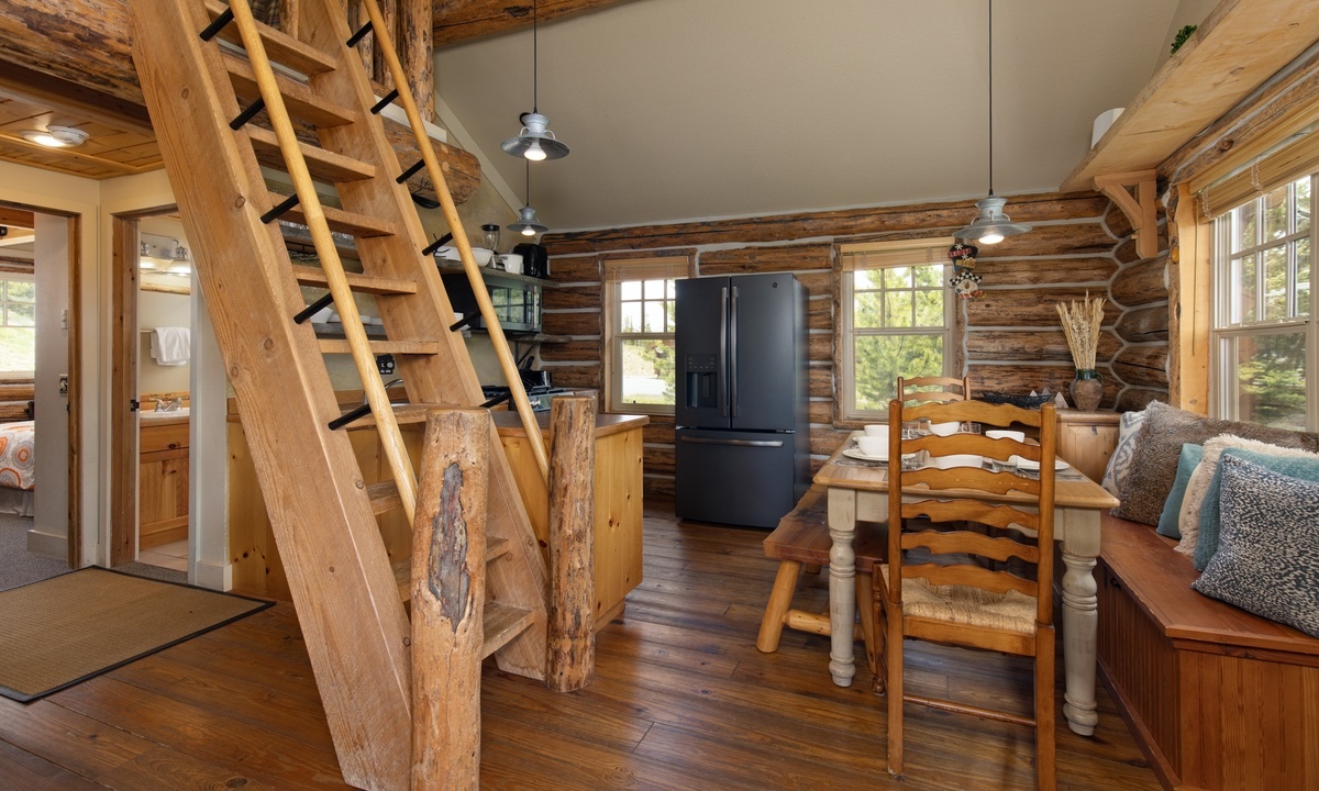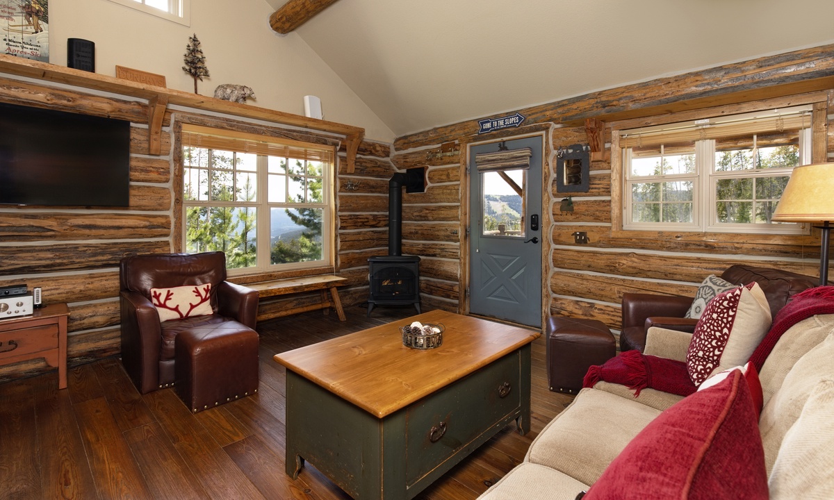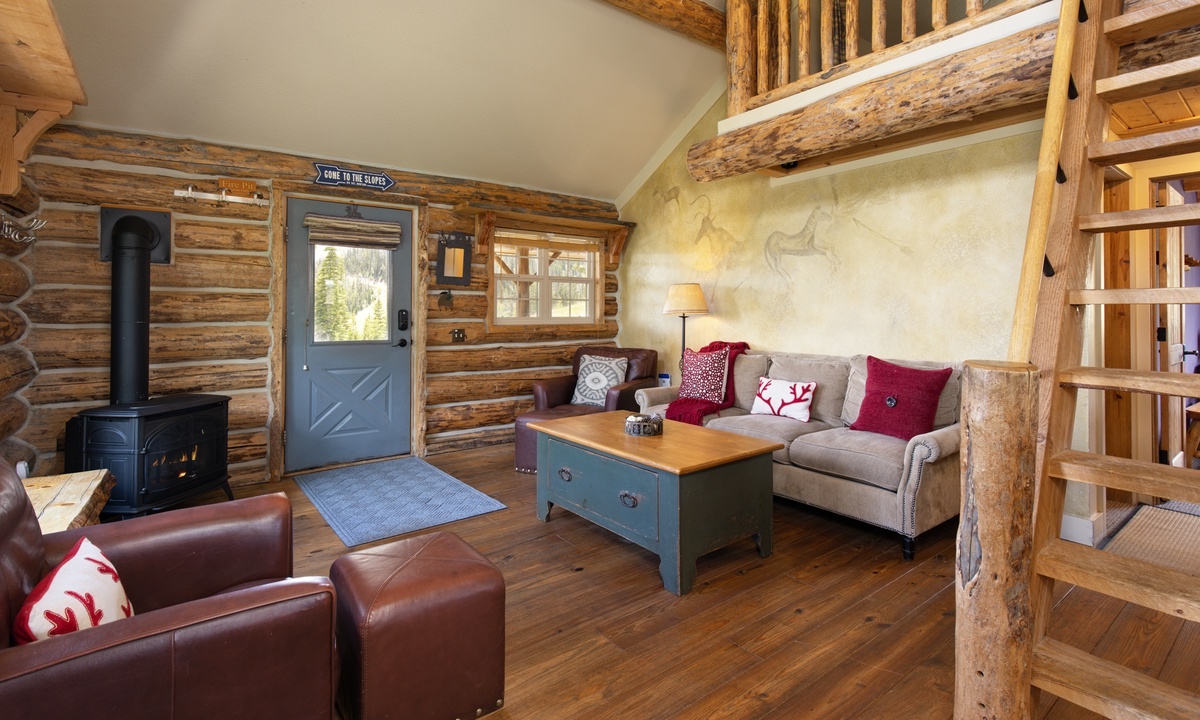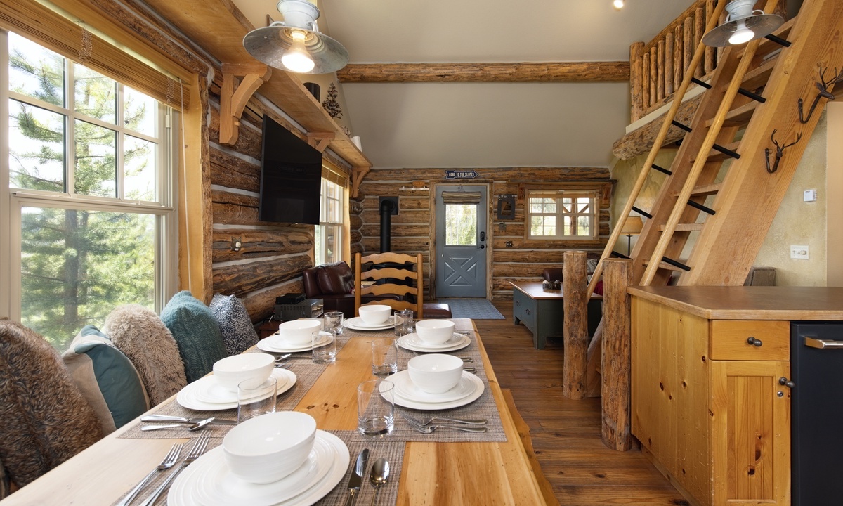 There aren’t many Big Sky ski cabins quite like this! A true ski-in/ski-out and pet-friendly cabin nestled on the slopes of Powder River Run. Simply drop in and go from your porch or take a plunge in your private hot tub and watch the skiers carve up the slopes!>Cabin 15 Rustic is one of the few Cowboy Heaven Rental Cabins to offer a rare loft space and the high ceilings give this cabin a larger sense of space. Larger than the other cabins at 1,000 sq feet, this unit accommodates eight guests in bedrooms and a sleeping loft.The open plan living area offers ample space for your crew. Reconnect by the fire, cook up a family meal for movie night or step outside! The front deck of this cabin is a favorite with a hot tub, BBQ grill and recliners in front of the firepit. Whatever the weather, it's a stunning place to relax, unwind and reconnect with loved ones and nature.