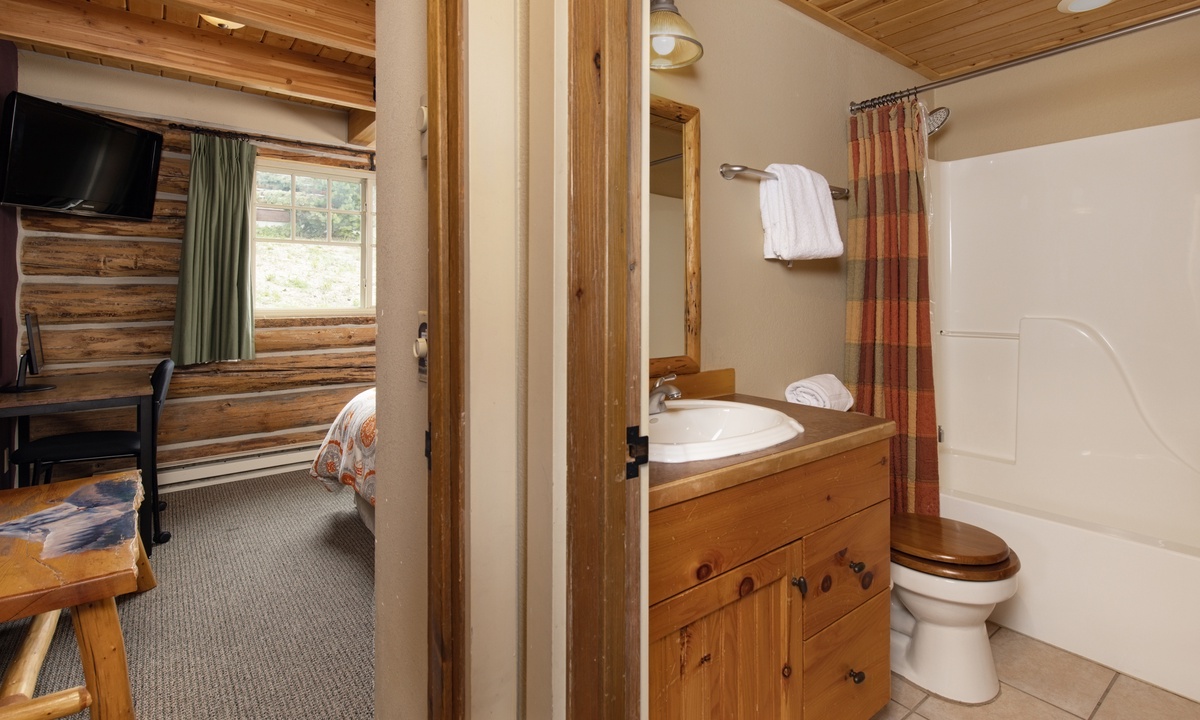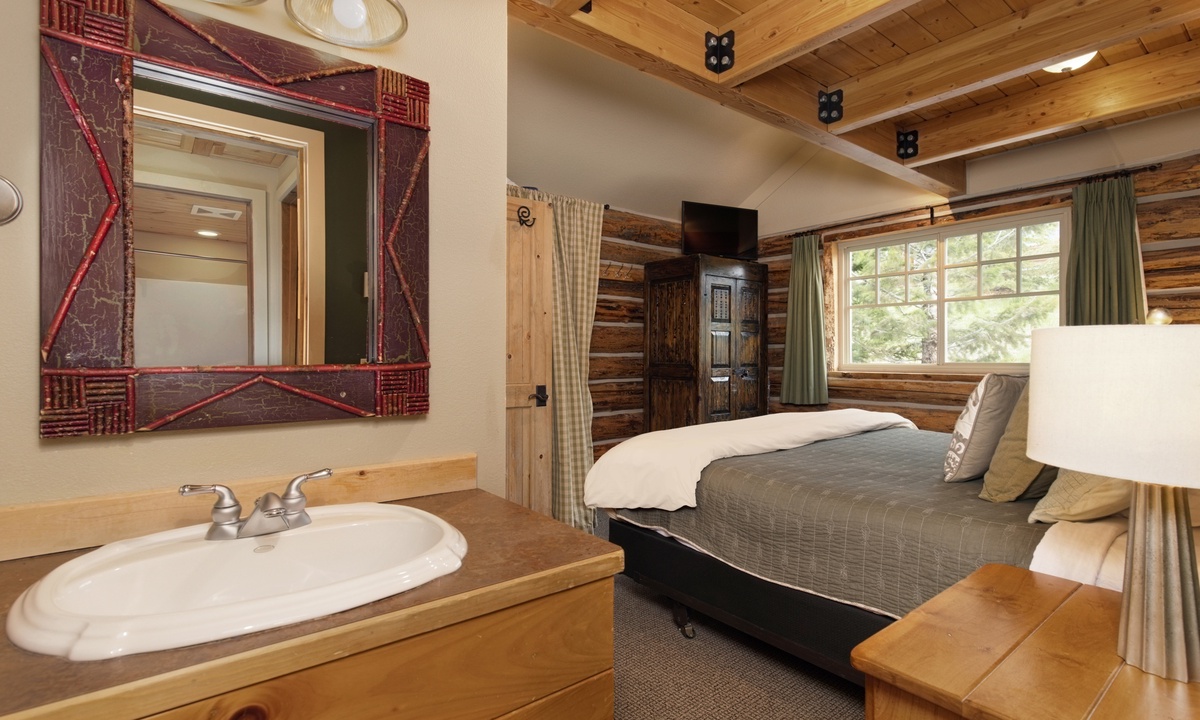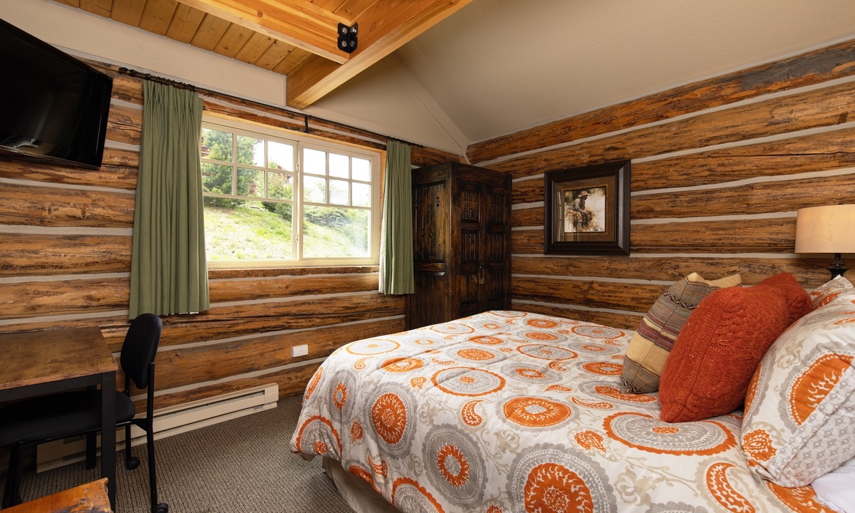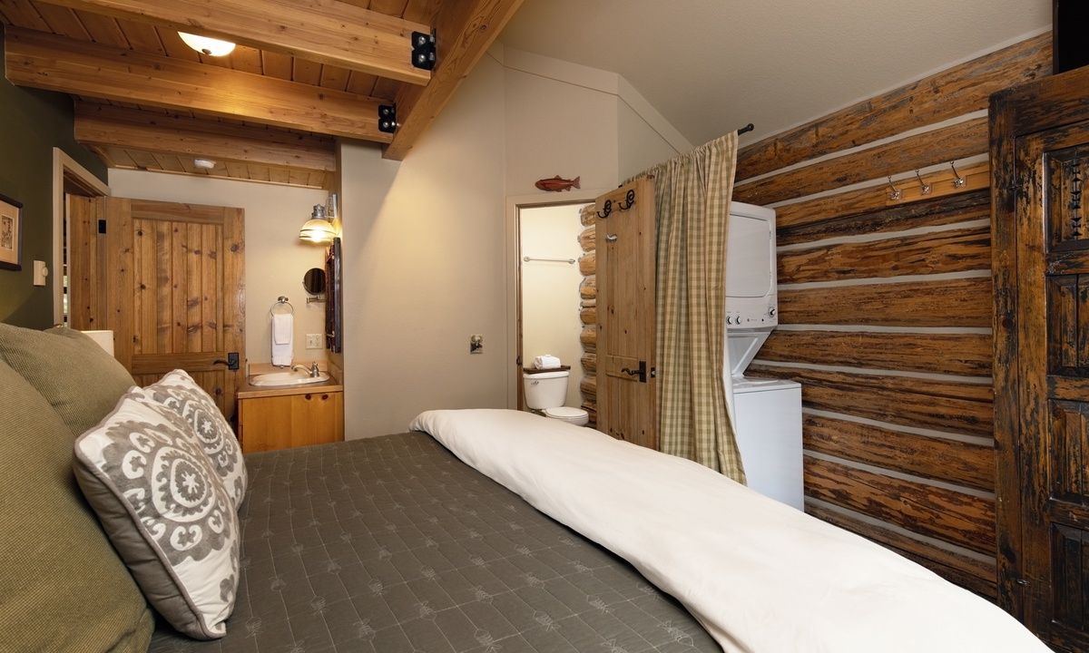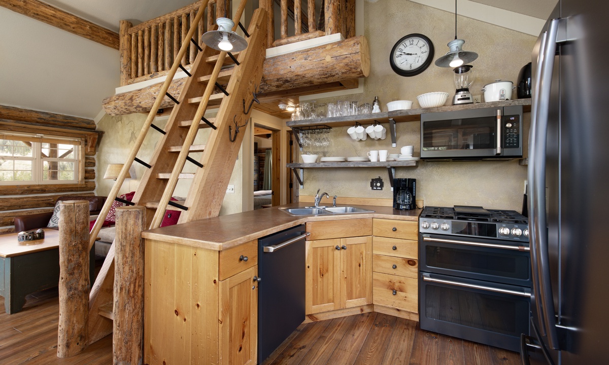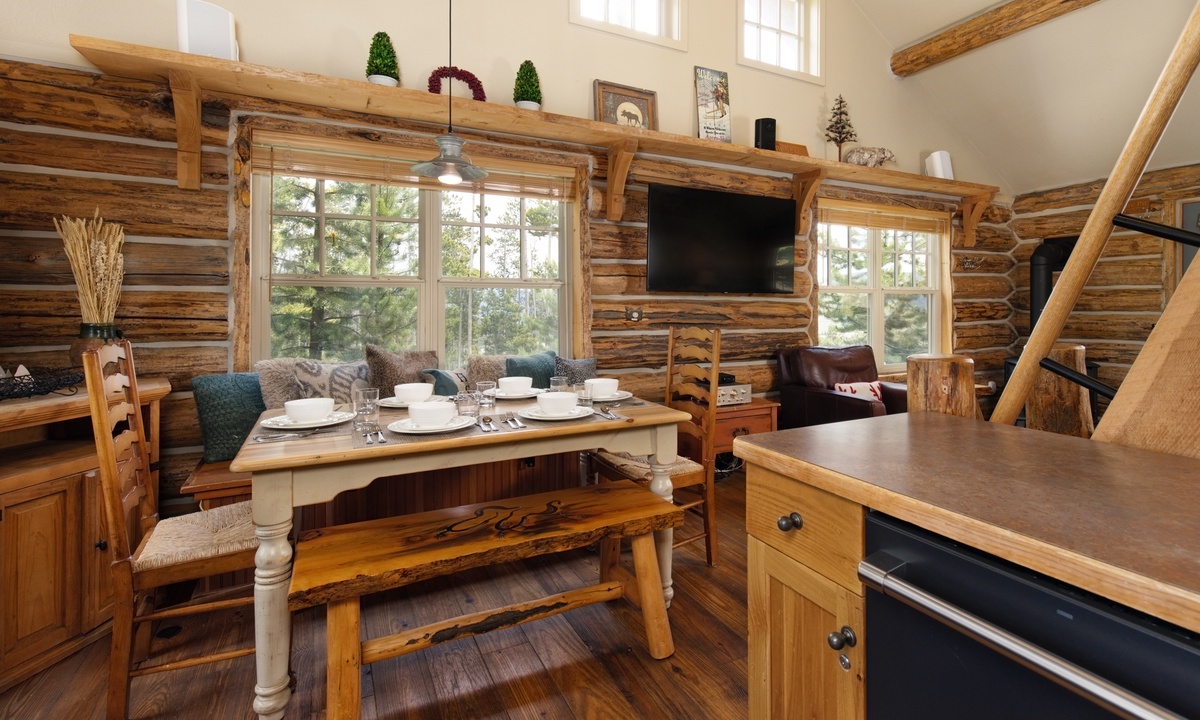 There aren’t many Big Sky ski cabins quite like this! A true ski-in/ski-out and pet-friendly cabin nestled on the slopes of Powder River Run. Simply drop in and go from your porch or take a plunge in your private hot tub and watch the skiers carve up the slopes!>Cabin 15 Rustic is one of the few Cowboy Heaven Rental Cabins to offer a rare loft space and the high ceilings give this cabin a larger sense of space. Larger than the other cabins at 1,000 sq feet, this unit accommodates eight guests in bedrooms and a sleeping loft.The open plan living area offers ample space for your crew. Reconnect by the fire, cook up a family meal for movie night or step outside! The front deck of this cabin is a favorite with a hot tub, BBQ grill and recliners in front of the firepit. Whatever the weather, it's a stunning place to relax, unwind and reconnect with loved ones and nature.