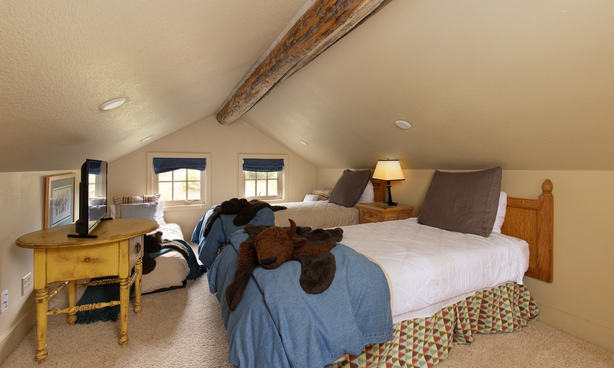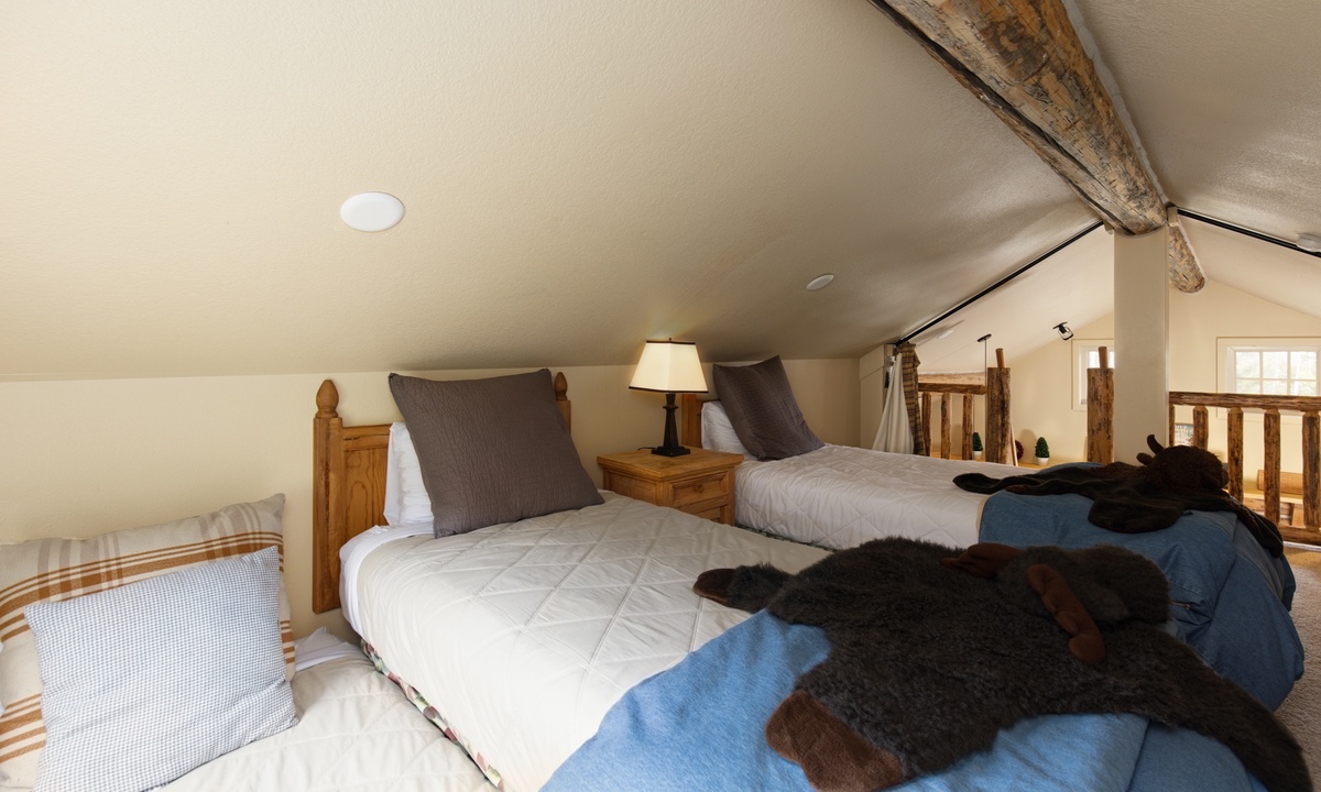 Loft- Two twin beds with twin trundles | shared full bath, shower/tub, toilet, sink | upper level loft