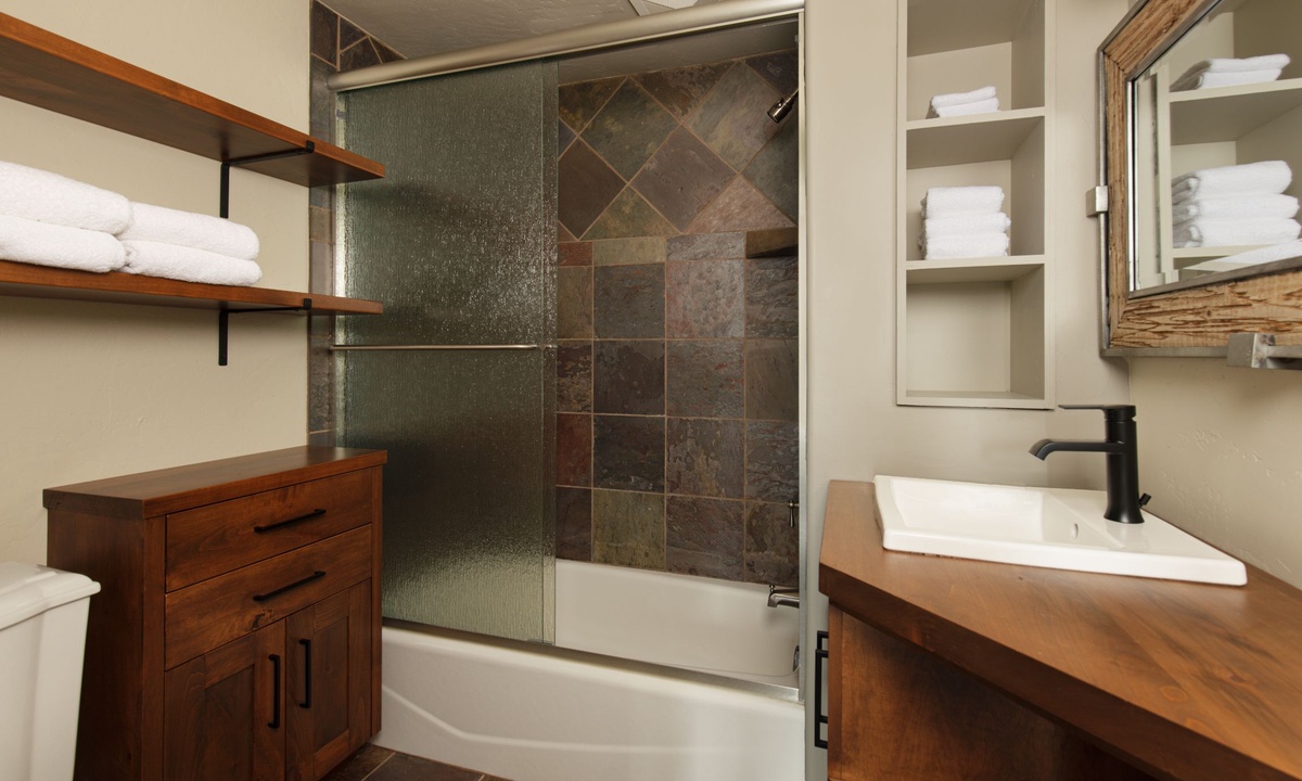 Ready to rest easy? Find the Primary King Suite on the lower level featuring direct access to the patio, high-end linens, elegant finishes, and an attached ensuite bathroom with a soaking tub. On the main level find a Queen Suite with an attached ensuite bathroom. Also find a bunk room and an additional loft bedroom upstairs that offer extra space for the kiddos or overflow sleeping.