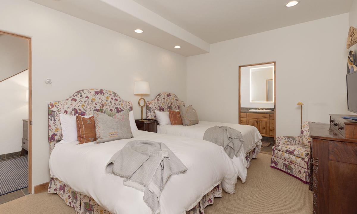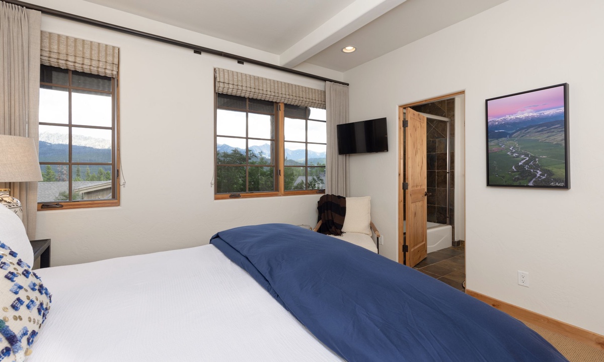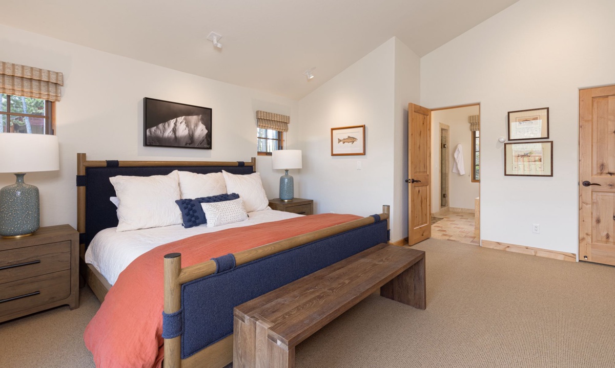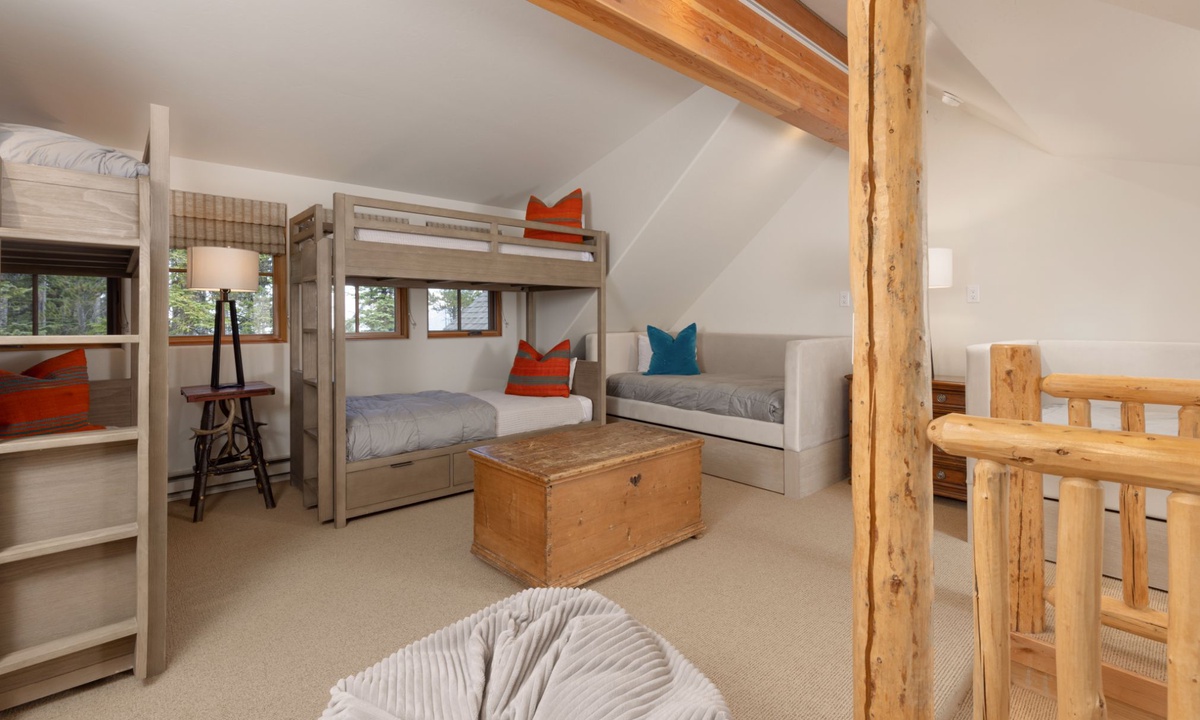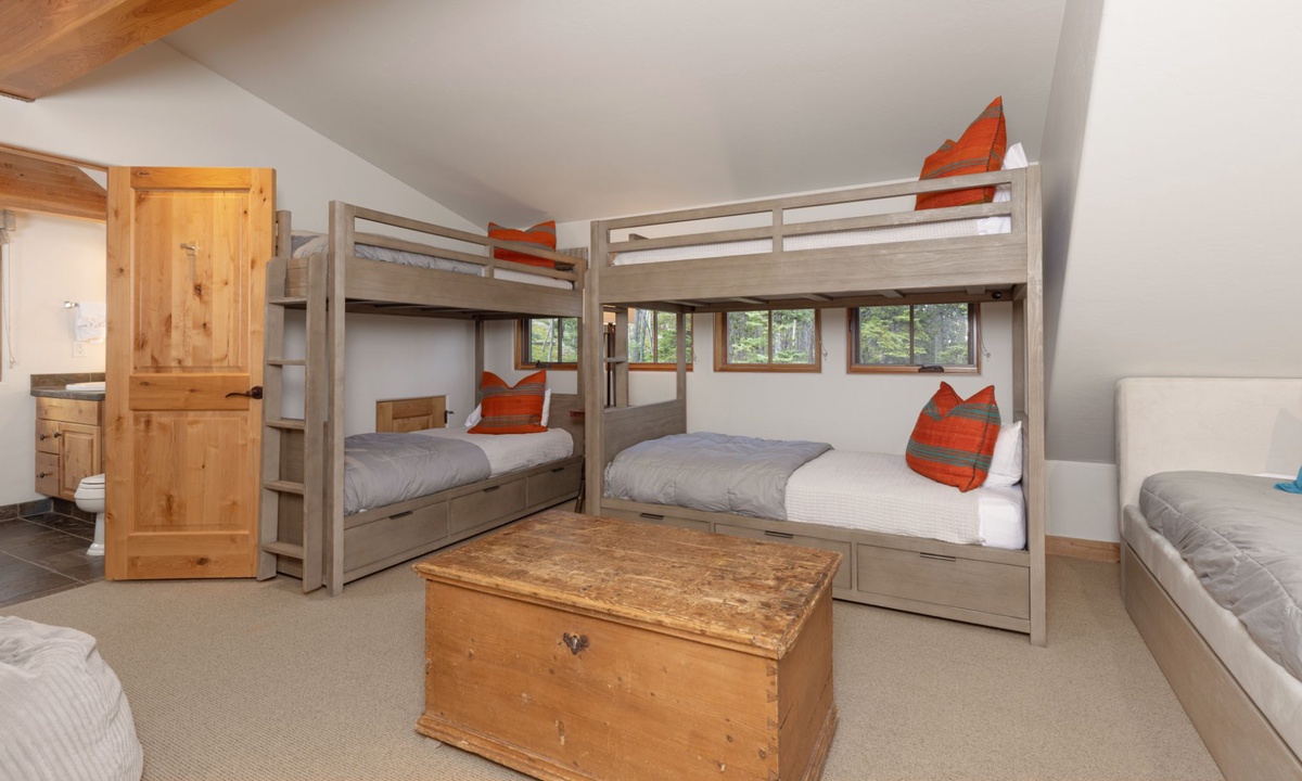 This Big Sky home sleeps 14 guests with ease in four bedrooms. The main level of the home features a king bedroom with an additional king and full room on the lower level, all with private bathrooms. The upstairs room has two twin beds, a full bed, and a private bathroom with a shower. All the creature comforts needed for a good night’s rest in Big Sky, MT.