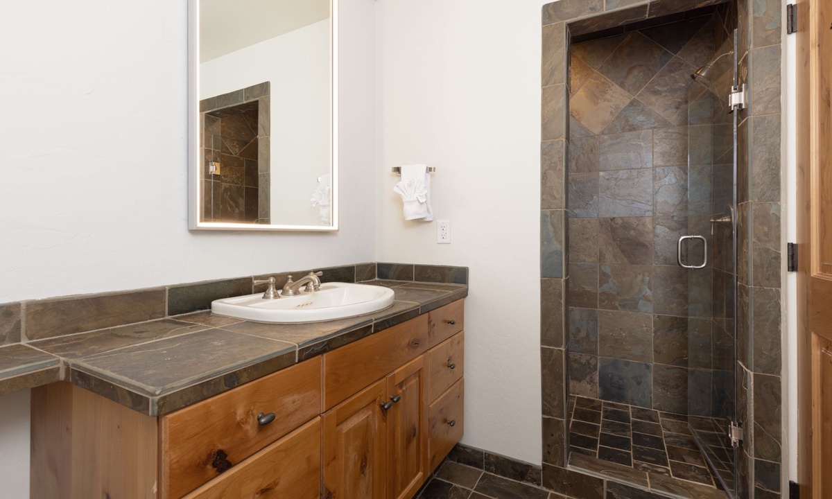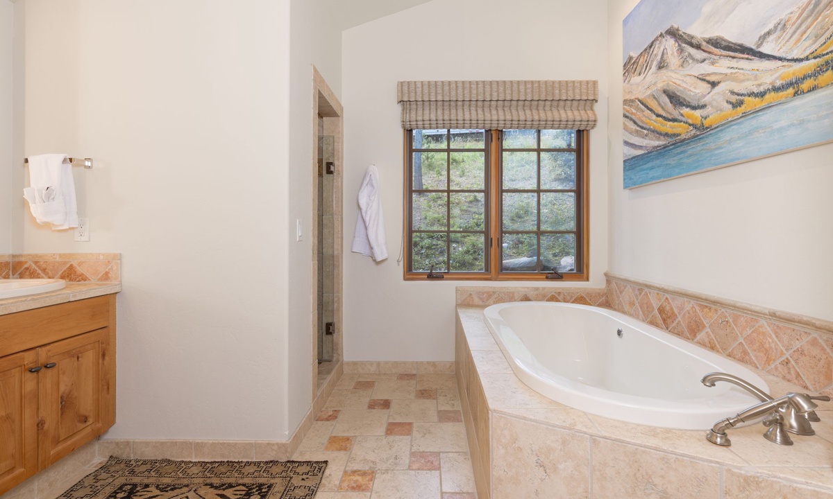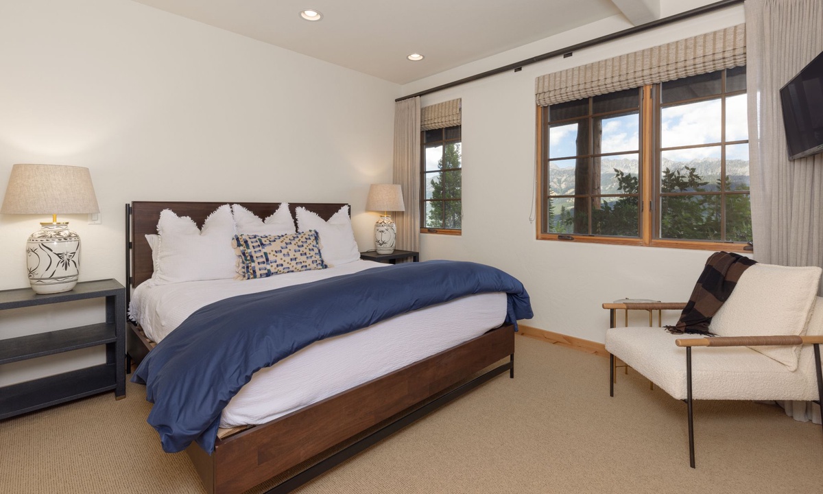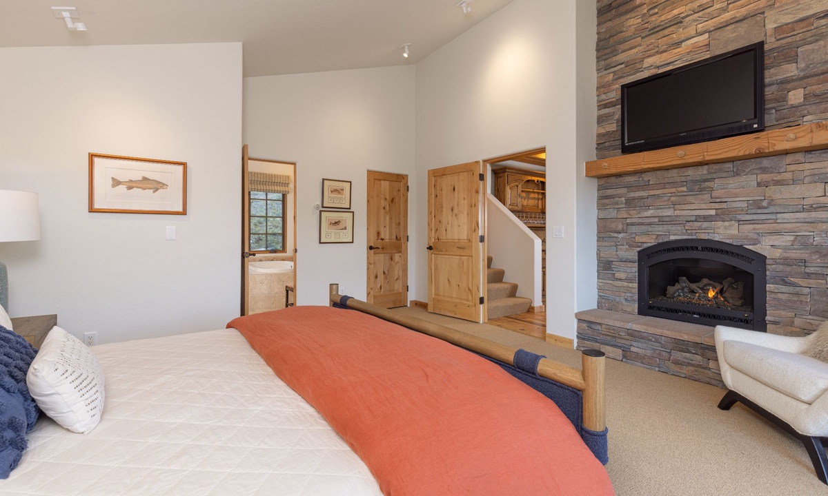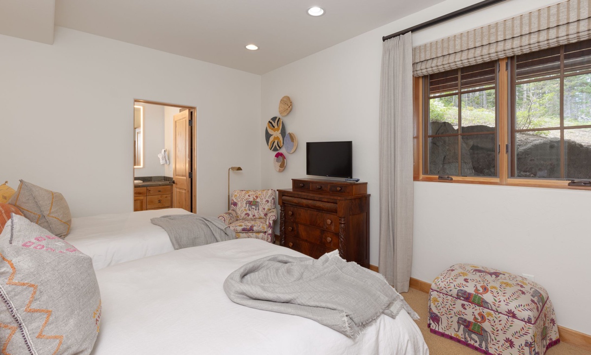 This Big Sky home sleeps 14 guests with ease in four bedrooms. The main level of the home features a king bedroom with an additional king and full room on the lower level, all with private bathrooms. The upstairs room has two twin beds, a full bed, and a private bathroom with a shower. All the creature comforts needed for a good night’s rest in Big Sky, MT.