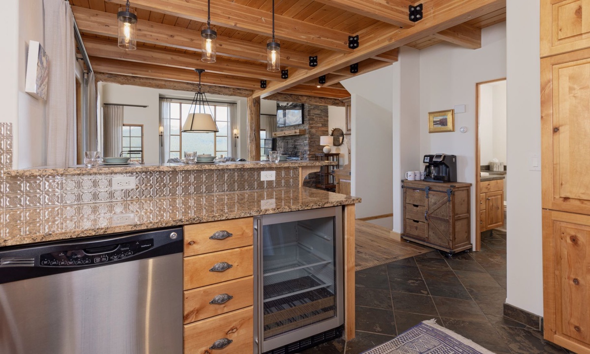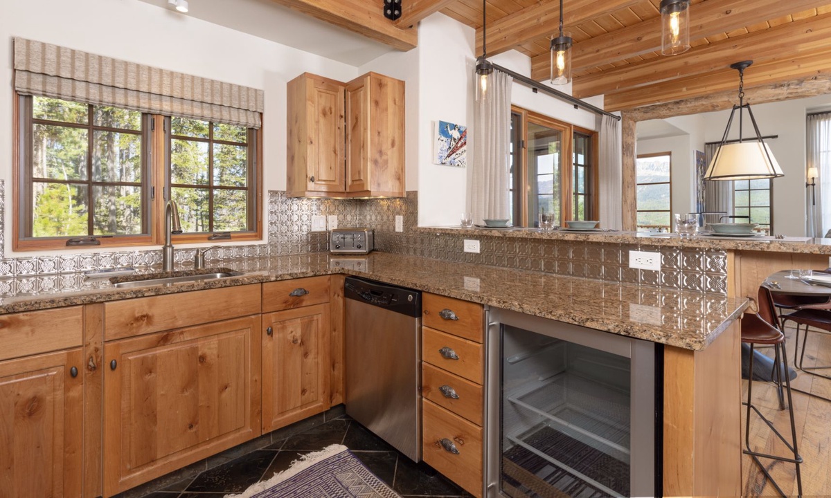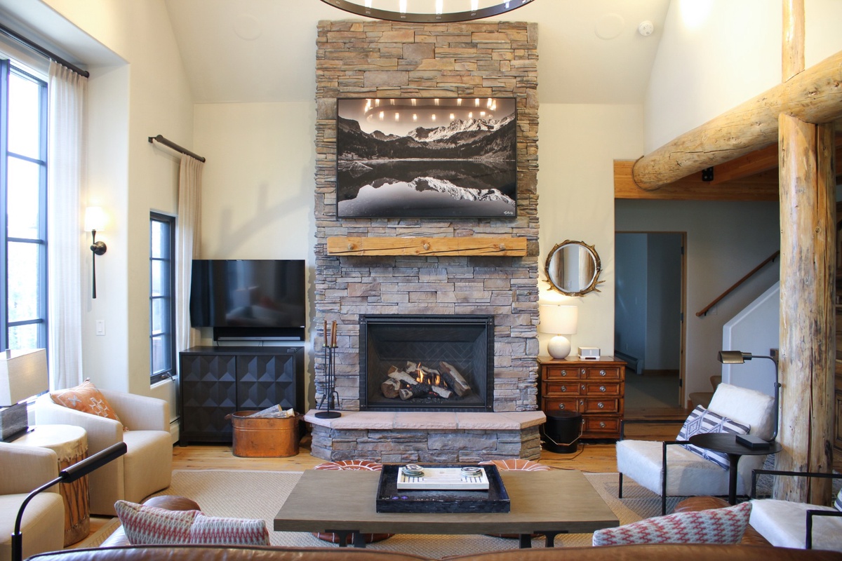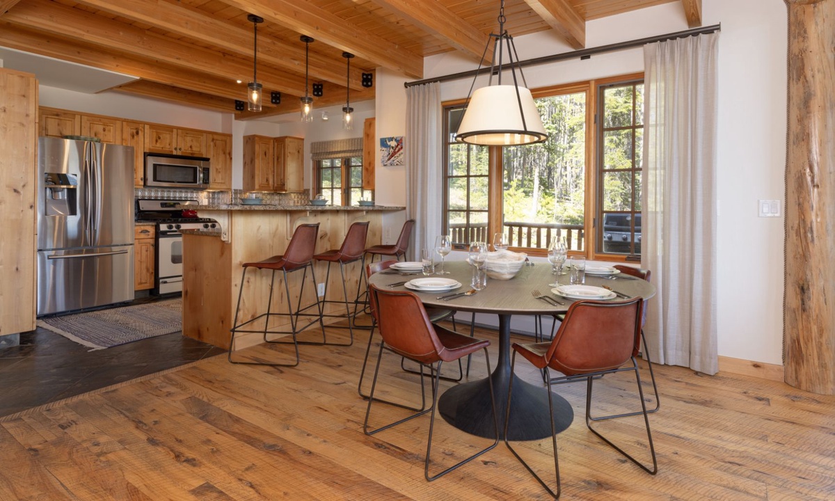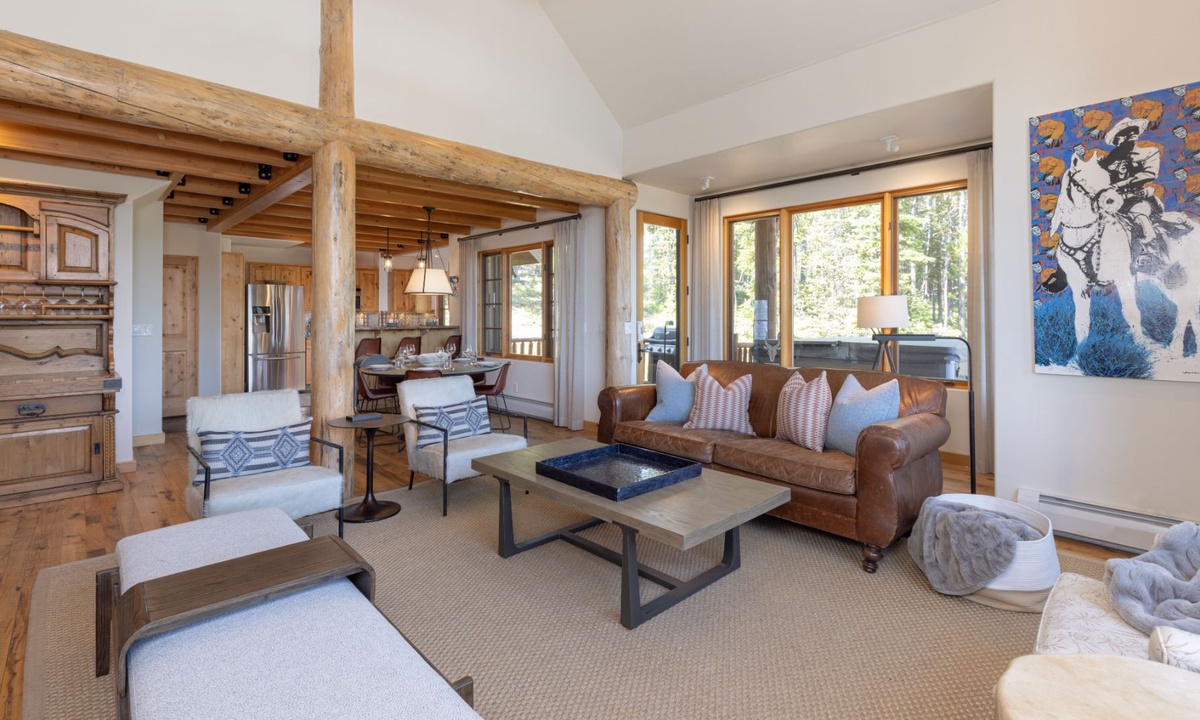 7 Bull Dogger boasts 2,600 sq ft of designer interiors, sophisticated amenities and rustic yet stylish handmade furniture throughout the home, with an open plan layout ideal for larger groups looking for space, comfort and style for their next Big Sky vacation. The great room features soaring cathedral ceilings, large windows with awesome views, a stone clad fireplace and comfy seating for your whole crowd. The fully-fitted kitchen is modern with high-end stainless appliances and an adjoining dining table to share home-cooked meals. The outdoor deck offers the finest in Big Sky outdoor living! Relax with friends and family as you unwind on the loungers soaking up the Big Sky views, share BBQs, sip sundowners and hot tub under a full moon.