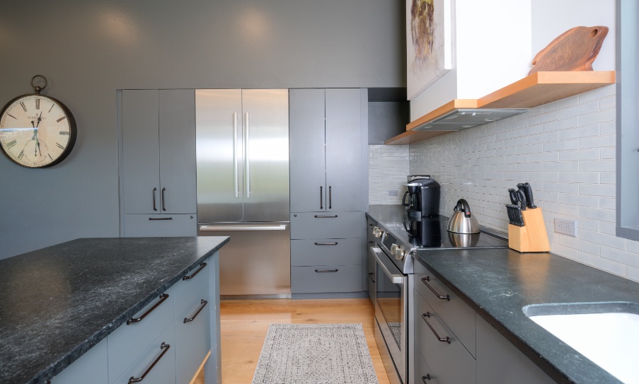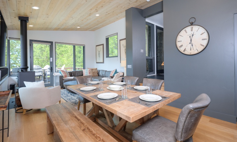 Nothing was missed in this spectacular wooded modern retreat that offers all the comforts of home in a spectacular lakeside setting. A stunning mix of modern, contemporary, and mountain decor has been used throughout the cabin making it a warm and inviting space to gather with family and friends. Seamless living from the sleek modern kitchen, fully equipped with all you need, through to the crackling wood-burning fireplace and wooden deck, makes for great year-round entertaining.