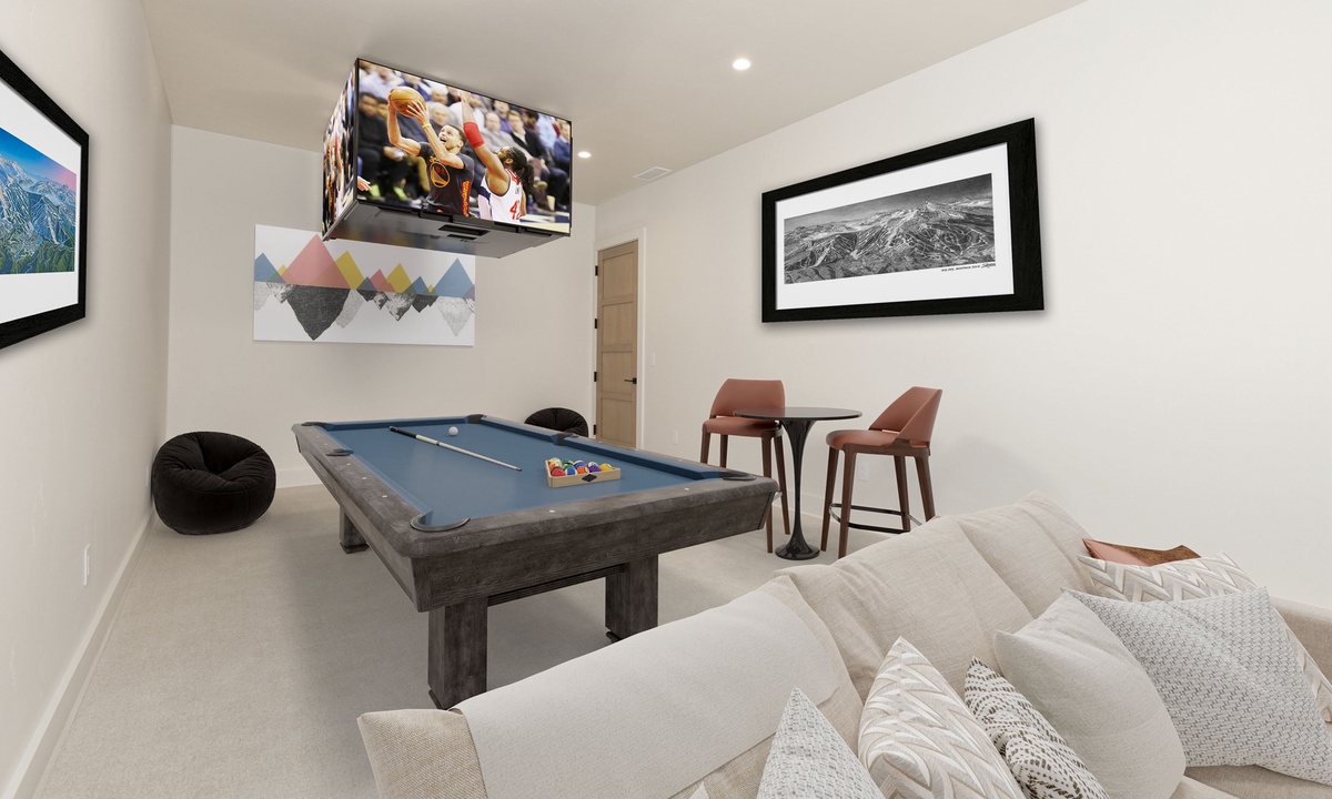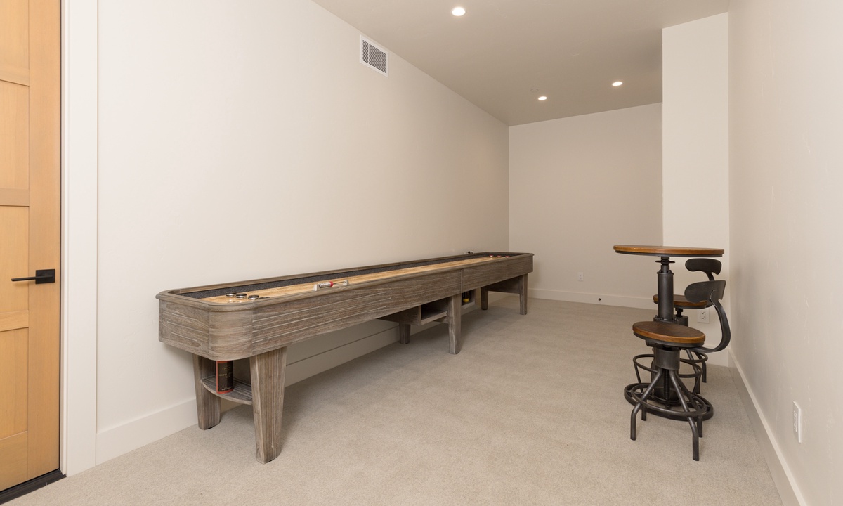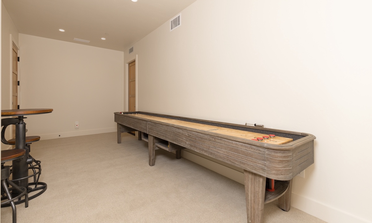 Ready to play? Head to the lower level lounge with a massive wrap-around sectional sofa and 75 inch flat screen TV. Head outside and find the lower level patio, complete with a private eight person hot tub where you can savor the crisp mountain air and stargaze at night. The home’s inventive lighting creates a magical ambiance for evening gatherings, the perfect place to relax and soak in the spectacular surroundings. For those who enjoy a bit of friendly competition, the two bookend media rooms promise endless fun. These two lower level game rooms are well-appointed with a full-length shuffleboard, pool table, large flat screen TVs, and two seating areas.