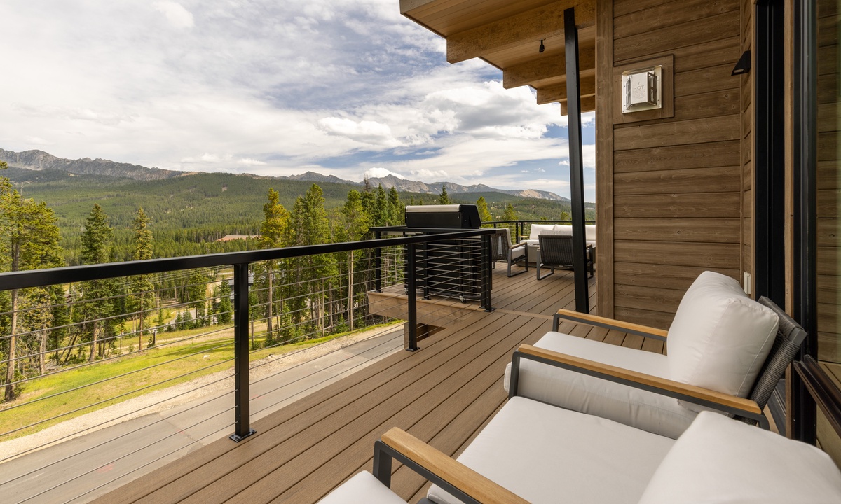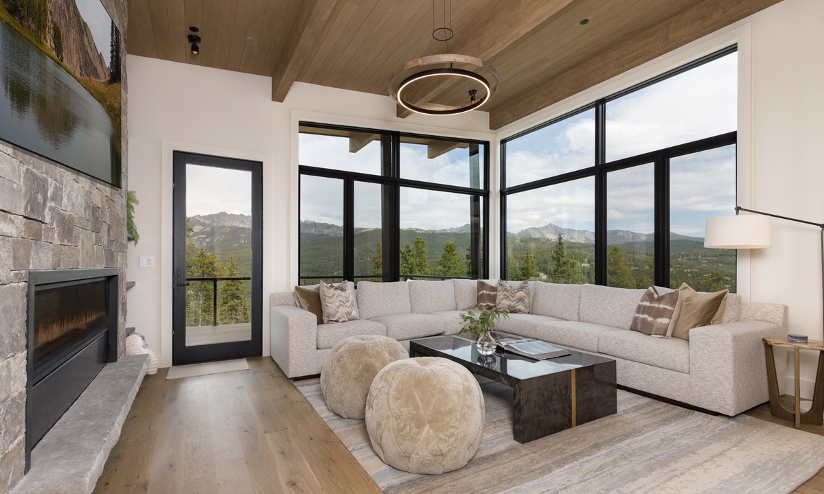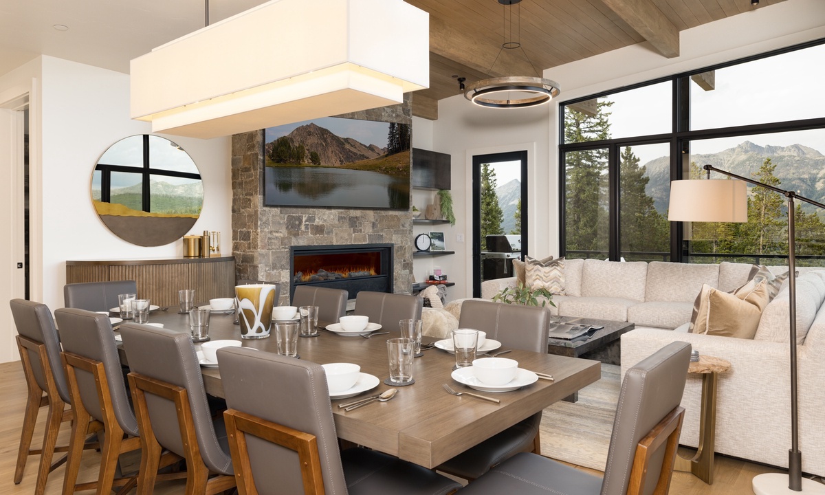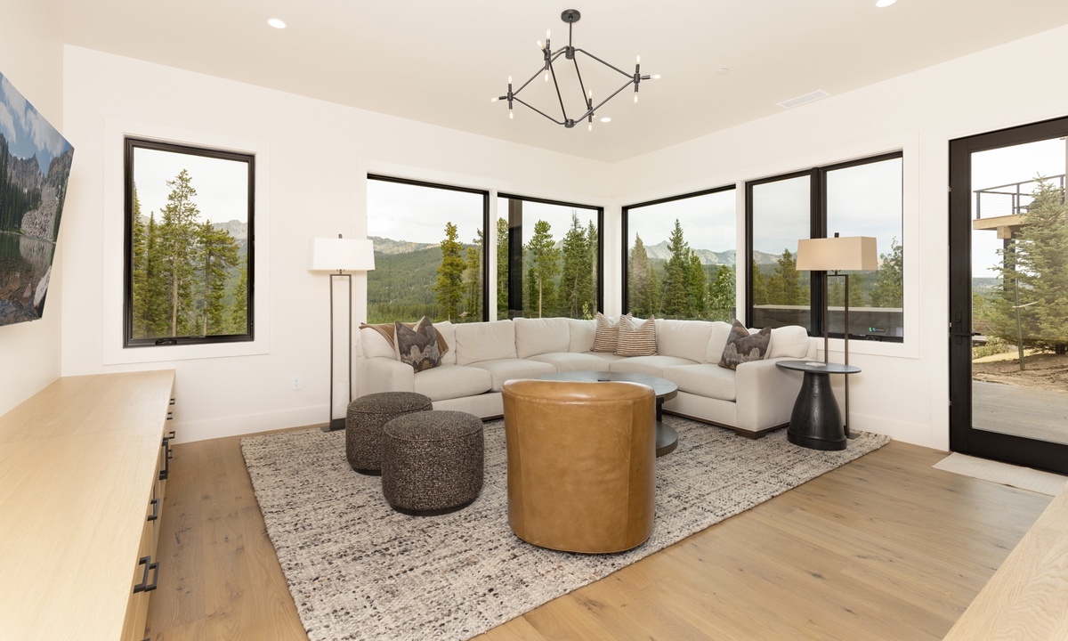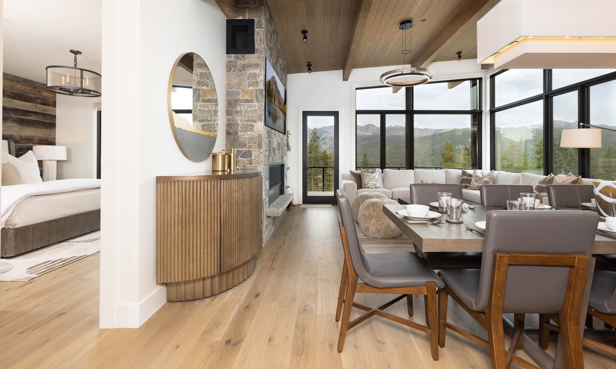 Step inside and feel immediately welcomed by the clean lines and inventive lighting that elevates the rustic design of this three-story gem. On the main level, expansive windows frame panoramic views of Beehive Basin and Yellow Mountain, filling the home with natural light. Leave your shoes and worries at the door in the entryway mudroom, boasting tons of space and functional storage. Every corner of this home has been thoughtfully designed, ensuring a seamless fusion of style and comfort. The main level living area features soaring ceilings and an inviting atmosphere, perfect for unwinding after a day on the slopes. The gourmet kitchen is a chef’s dream, equipped with top-of-the-line appliances and elegant finishes including a six-burner Wolf range. Enjoy meals with family and friends in the spacious dining area that seats ten with room for additional seating for larger groups. Gather around the fireplace in the cozy great room, where modern furnishings meet rustic charm. Step out onto the main level deck and find thoughtful outdoor seating and a propane fire pit, perfect for enjoying a morning cup of coffee.