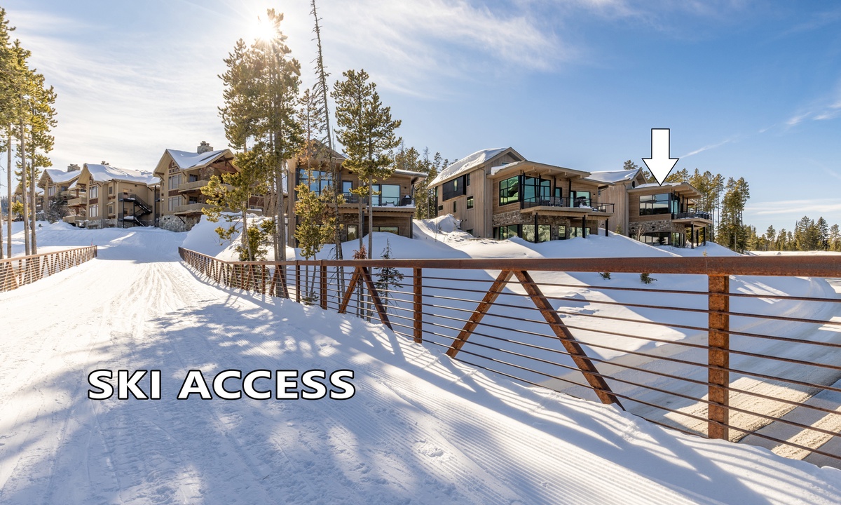 From the top of the new 8-person lift, follow signs to Powder River. run. Ski through the skier tunnel on the left side of Powder River and ski past the FIRSt skier bridge on the right. Take a hard right on Natawista Run (2nd right after the tunnel) and this transitions to Bootlegger Access. DO NOT take the left onto the bridge at the split. Follow Bootlegger and take a left at the sign for Alpine Meadows. Ski over the long skier bridge back to the garage of the unit on the left.