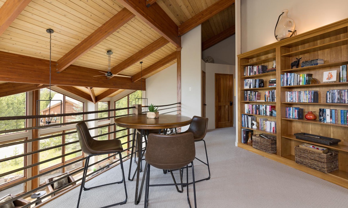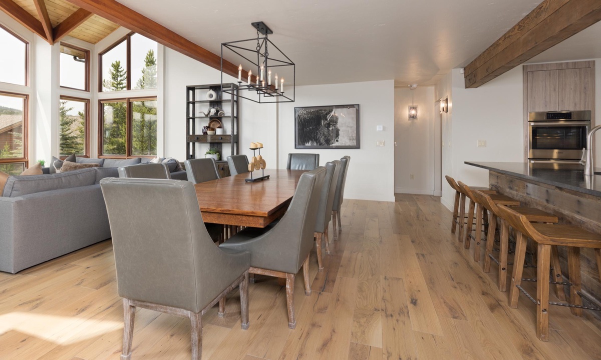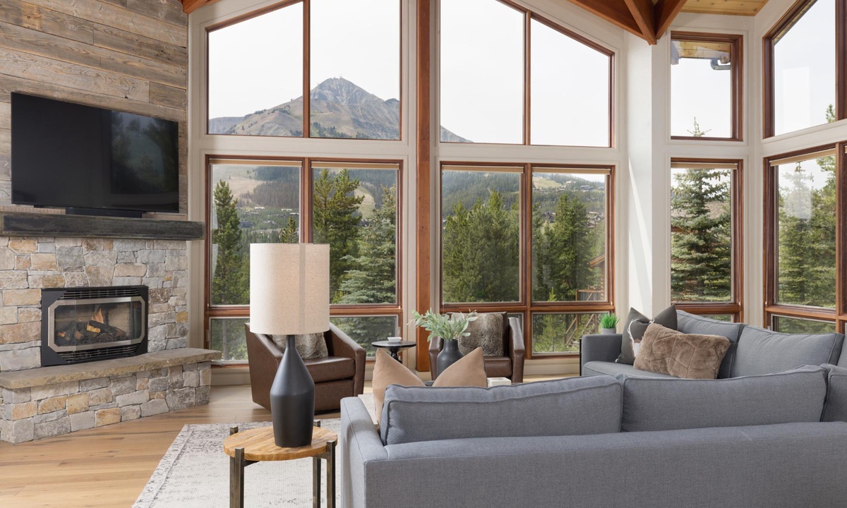 Step into the space and be greeted by soaring vaulted ceilings and large panoramic windows that showcase spectacular mountain vistas and fill the space with tons of natural light. The living area features plush seating, large flat screen TV, and a gas fireplace, the ideal spot to cozy up after a day full of adventure. The heart of the home is the gourmet kitchen, outfitted with stainless steel appliances, granite countertops, wine fridge, and a dining table designed to easily seat eight with seating for four more at the breakfast bar. Whether you’re prepping a multi‑course feast or enjoying a casual brunch, this kitchen has all the amenities the chef in your group will need to whip up something fantastic! Adjacent to the dining area you’ll discover a cozy alcove, ideal for a pre‑dinner glass of wine or a morning cup of coffee. Step outside and find a large wrap around deck with outdoor seating options and a private bubbling hot tub. Outdoors you’ll also find a propane grill, a crackling fire pit, and a seasonal fun horseshoe pit.