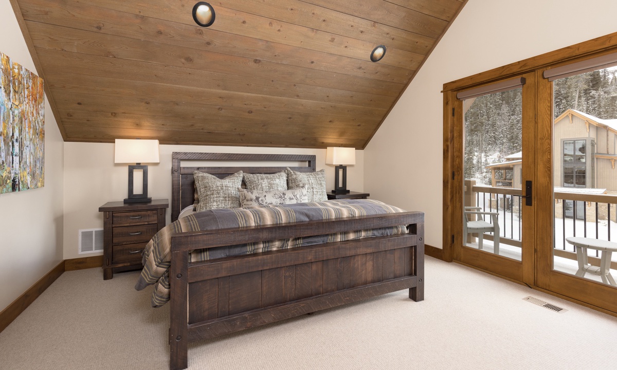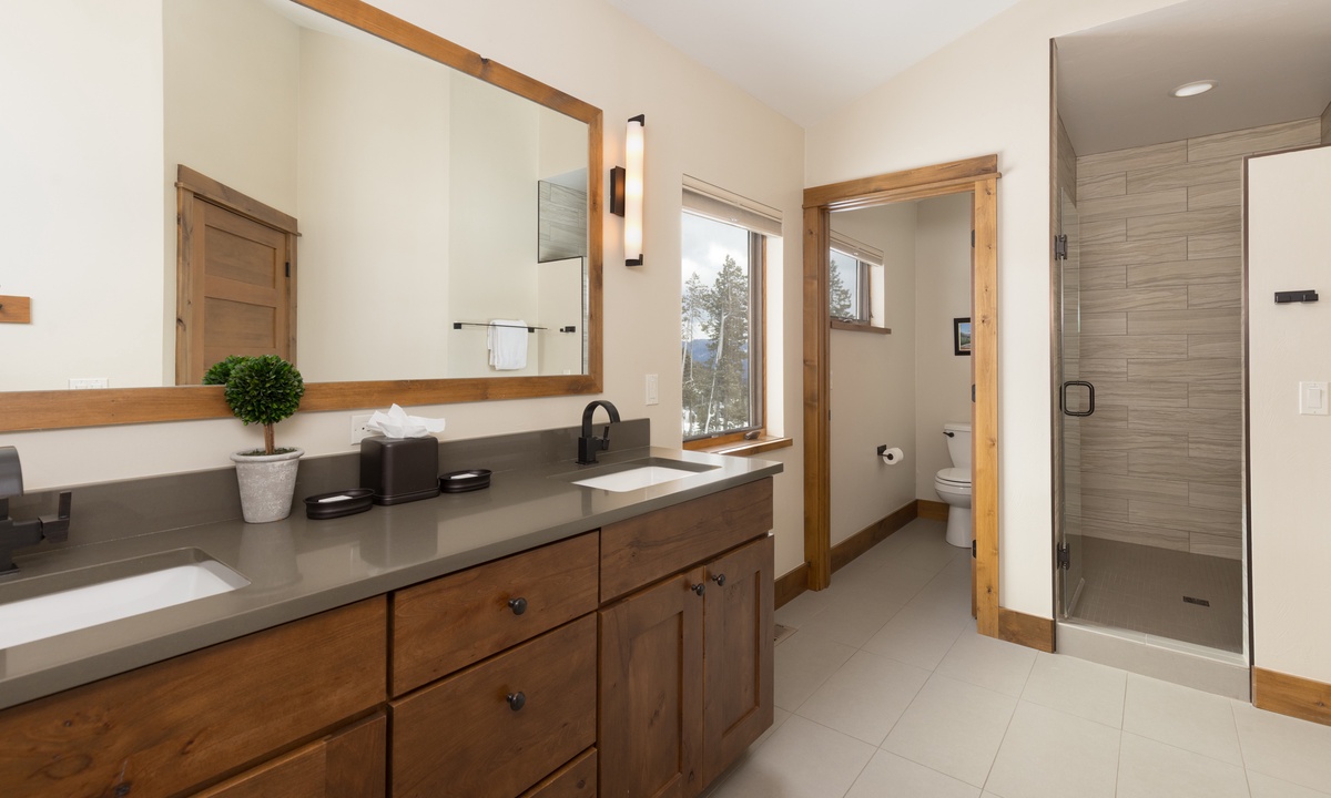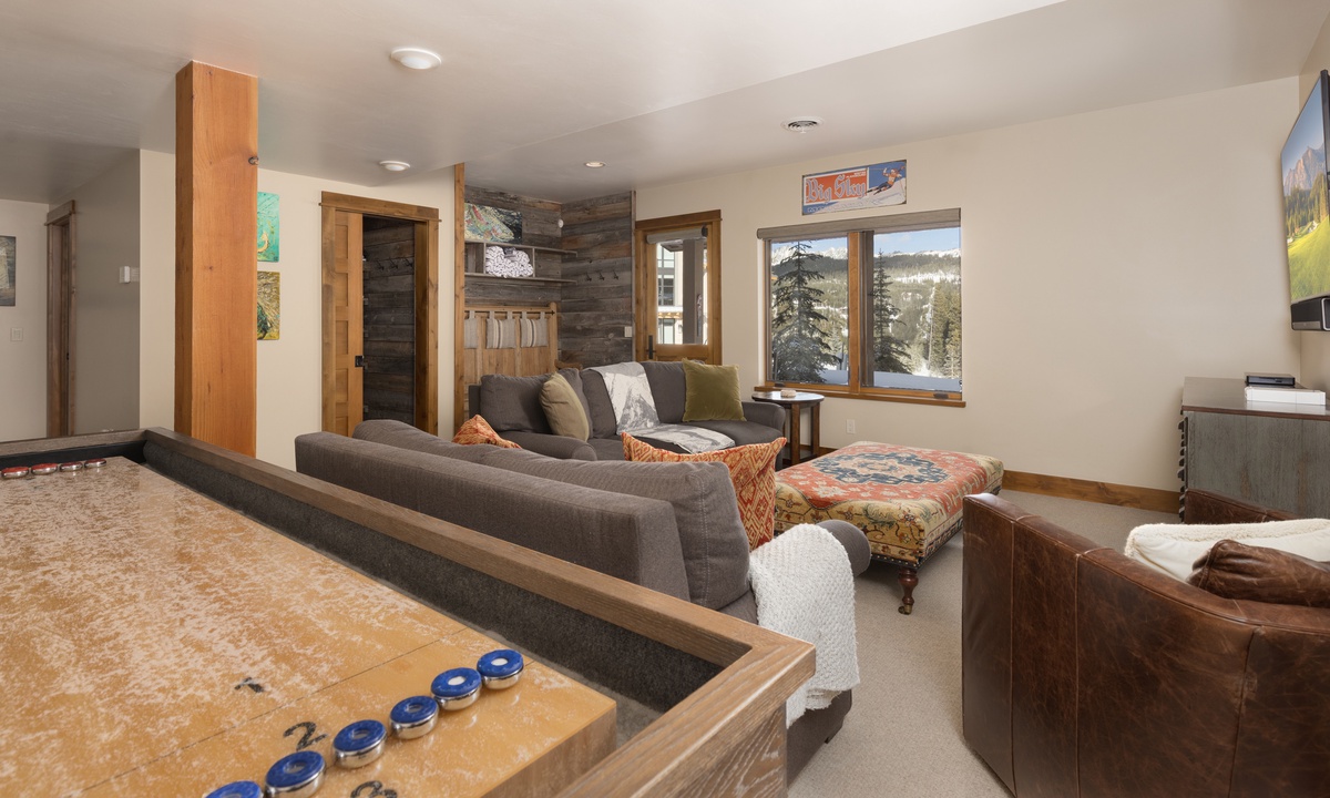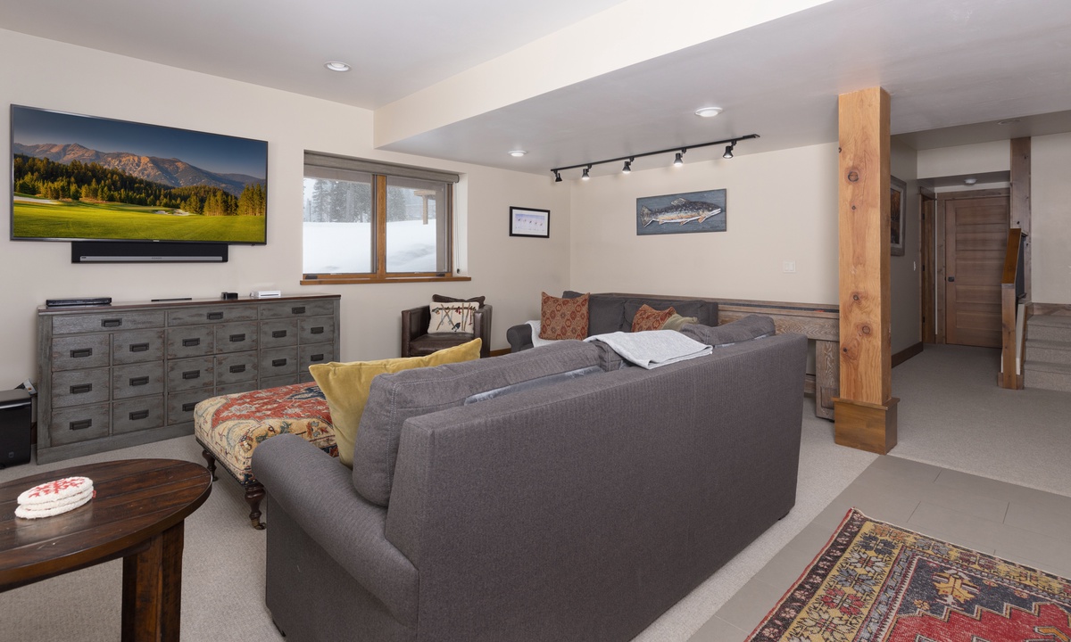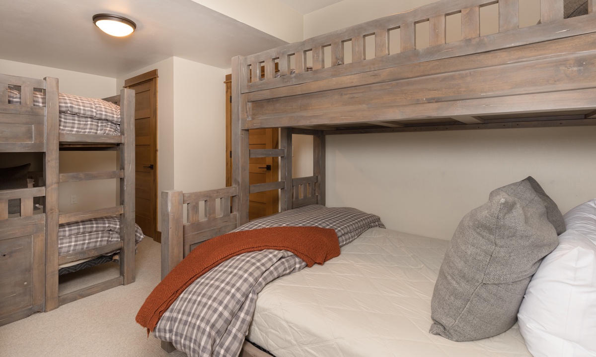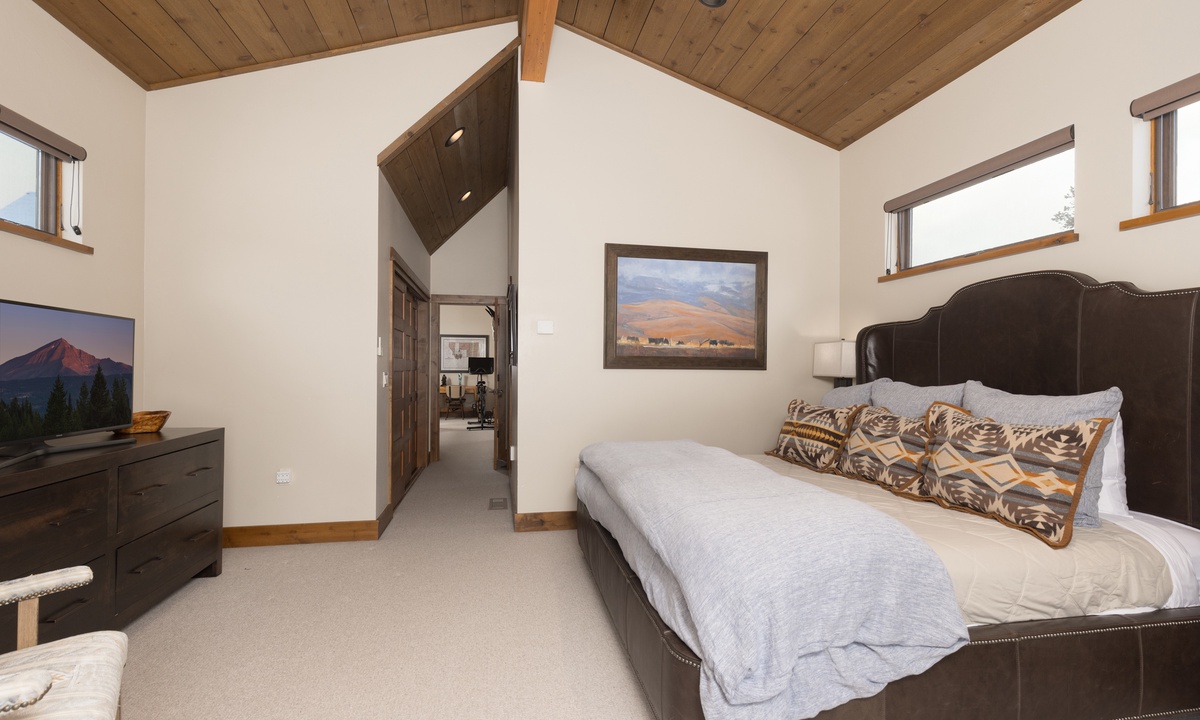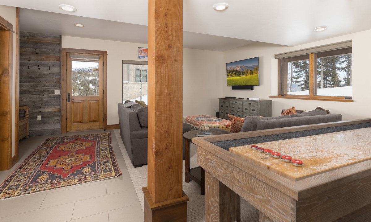 When it’s time to rest easy, the chalet comfortably accommodates up to 15 guests across five bedrooms. The main level Primary King Suite features an attached ensuite bathroom complete with a soaking tub, stand up shower, and luxe finishes. The upper level hosts two more King Suites each offering private ensuite bathrooms each with stand up showers and tons of privacy. On the lower level, find the lower level lounge with a flat screen TV and a plush wrap around couch that doubles as a Queen sleeper sofa. The lower level includes another King Suite with its own ensuite bathroom and a spacious bunk room featuring a Twin/Queen bunk bed & a Twin/Twin bunk bed. Combining luxury, comfort, and an unbeatable location, Homestead Chalet 5 is the perfect choice for an exceptional Big Sky getaway!