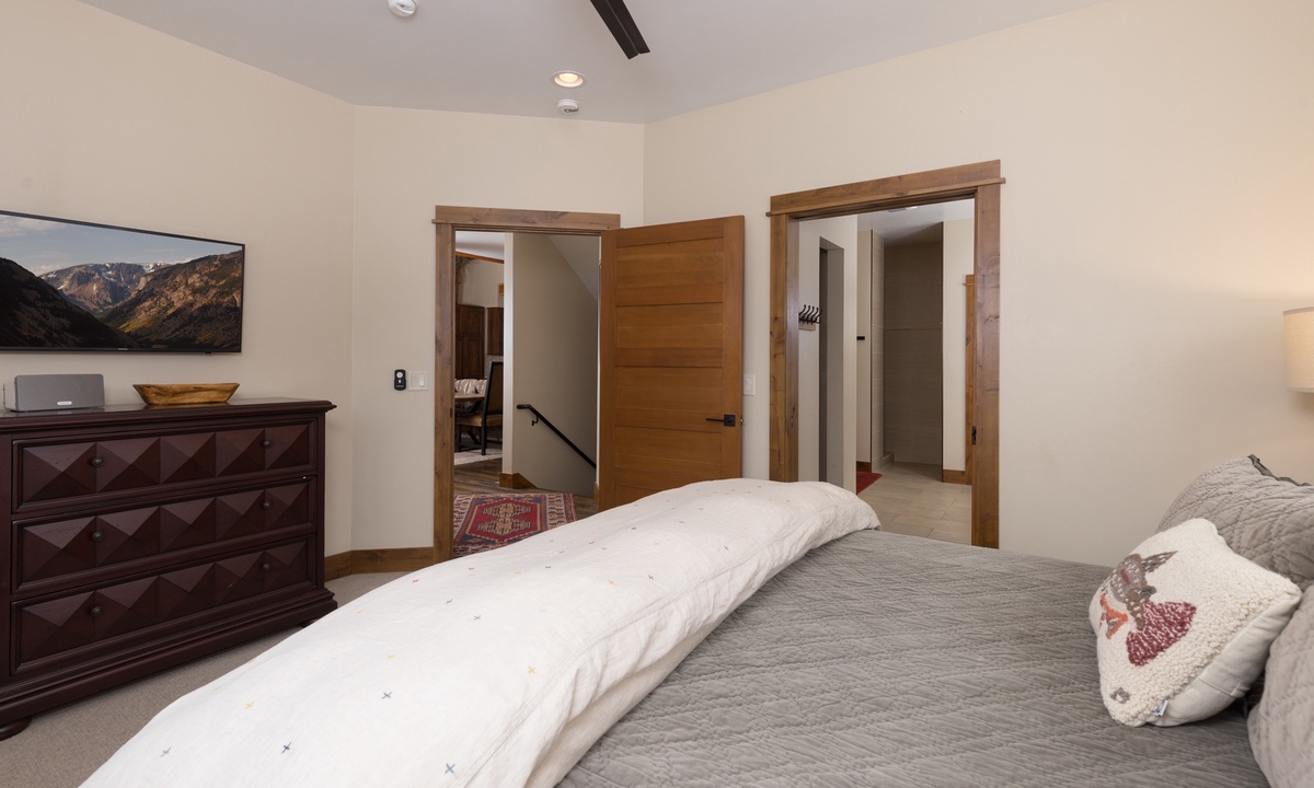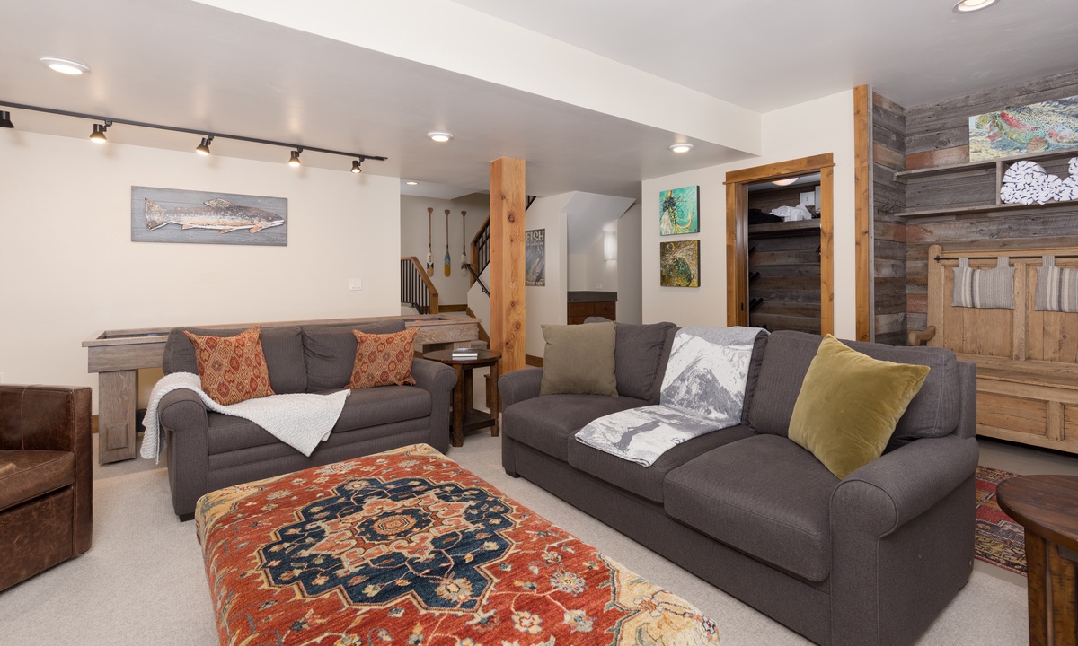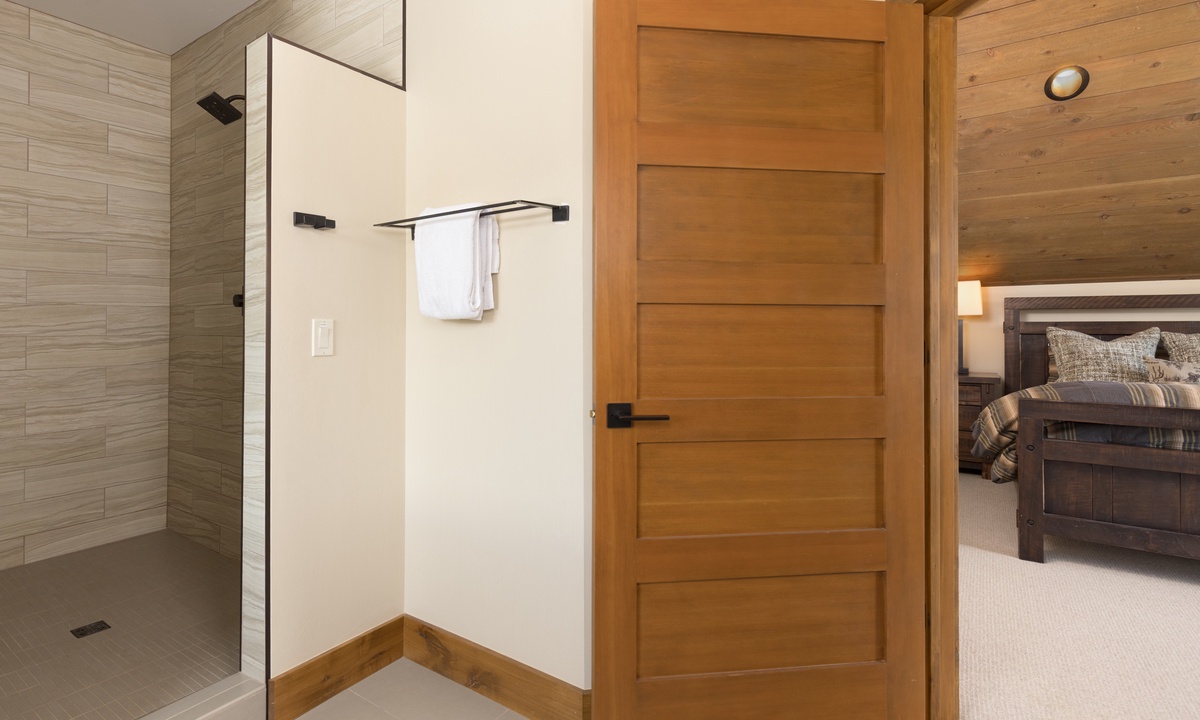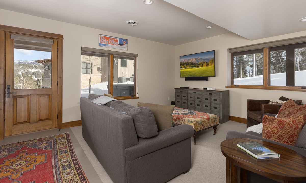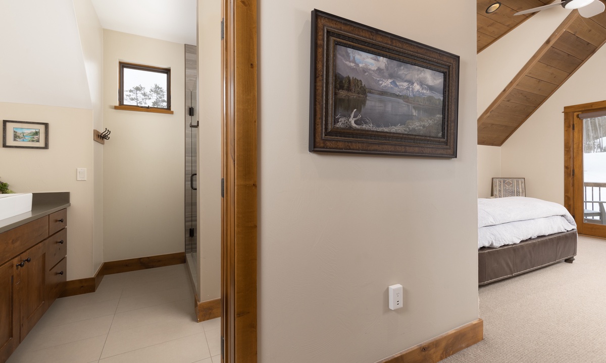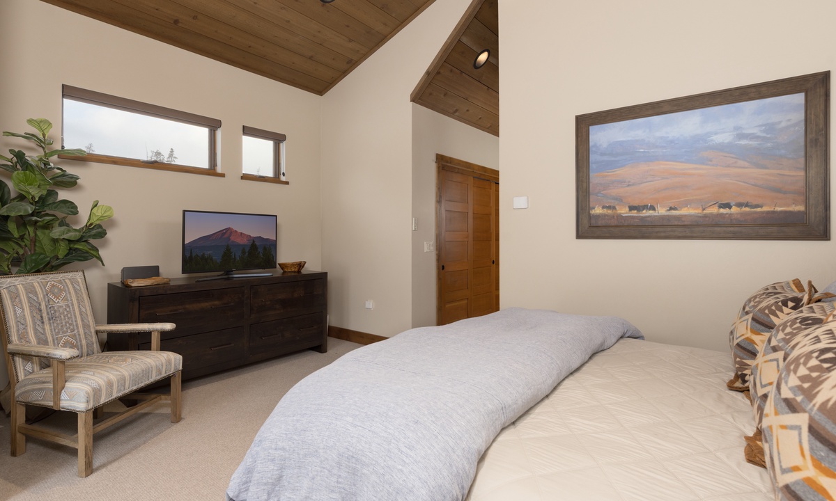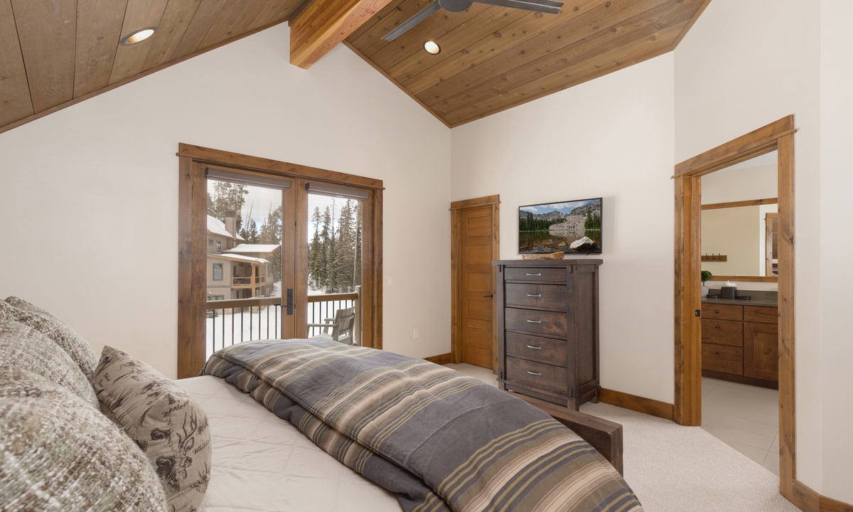 When it’s time to rest easy, the chalet comfortably accommodates up to 15 guests across five bedrooms. The main level Primary King Suite features an attached ensuite bathroom complete with a soaking tub, stand up shower, and luxe finishes. The upper level hosts two more King Suites each offering private ensuite bathrooms each with stand up showers and tons of privacy. On the lower level, find the lower level lounge with a flat screen TV and a plush wrap around couch that doubles as a Queen sleeper sofa. The lower level includes another King Suite with its own ensuite bathroom and a spacious bunk room featuring a Twin/Queen bunk bed & a Twin/Twin bunk bed. Combining luxury, comfort, and an unbeatable location, Homestead Chalet 5 is the perfect choice for an exceptional Big Sky getaway!