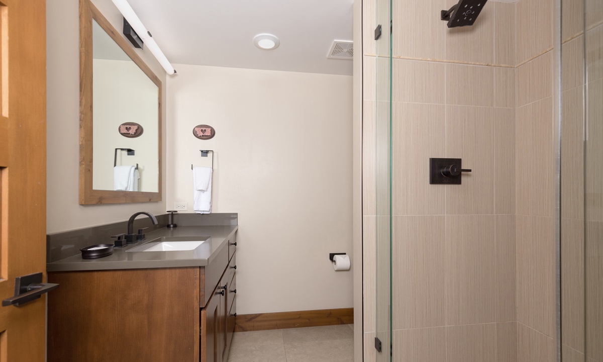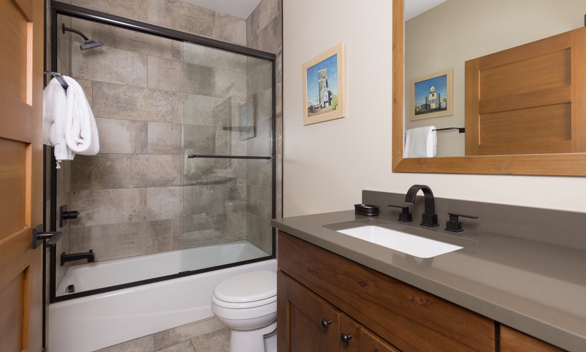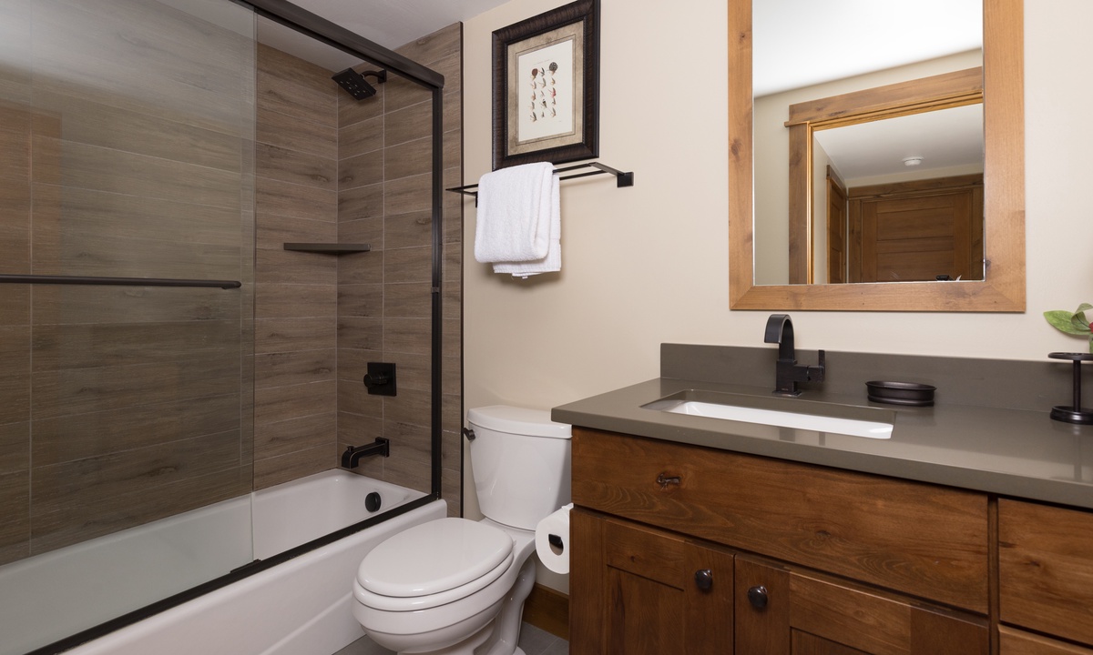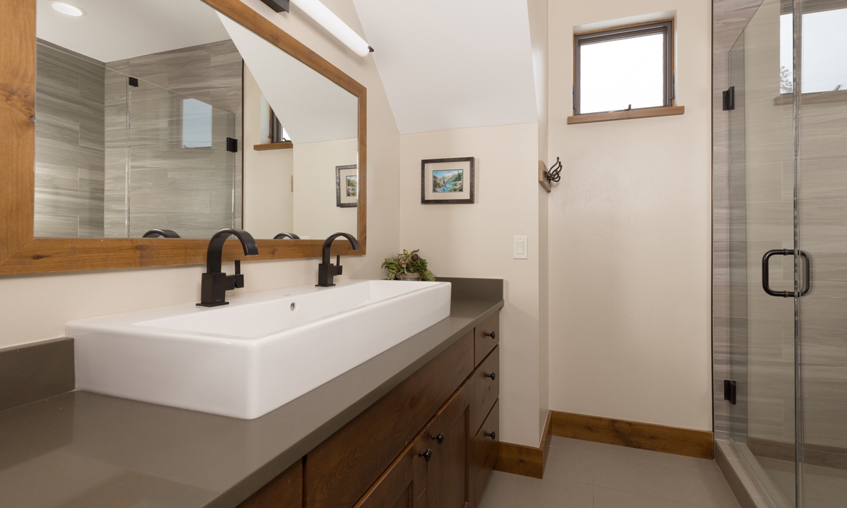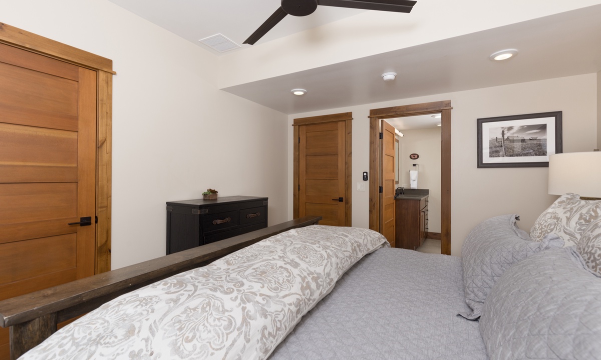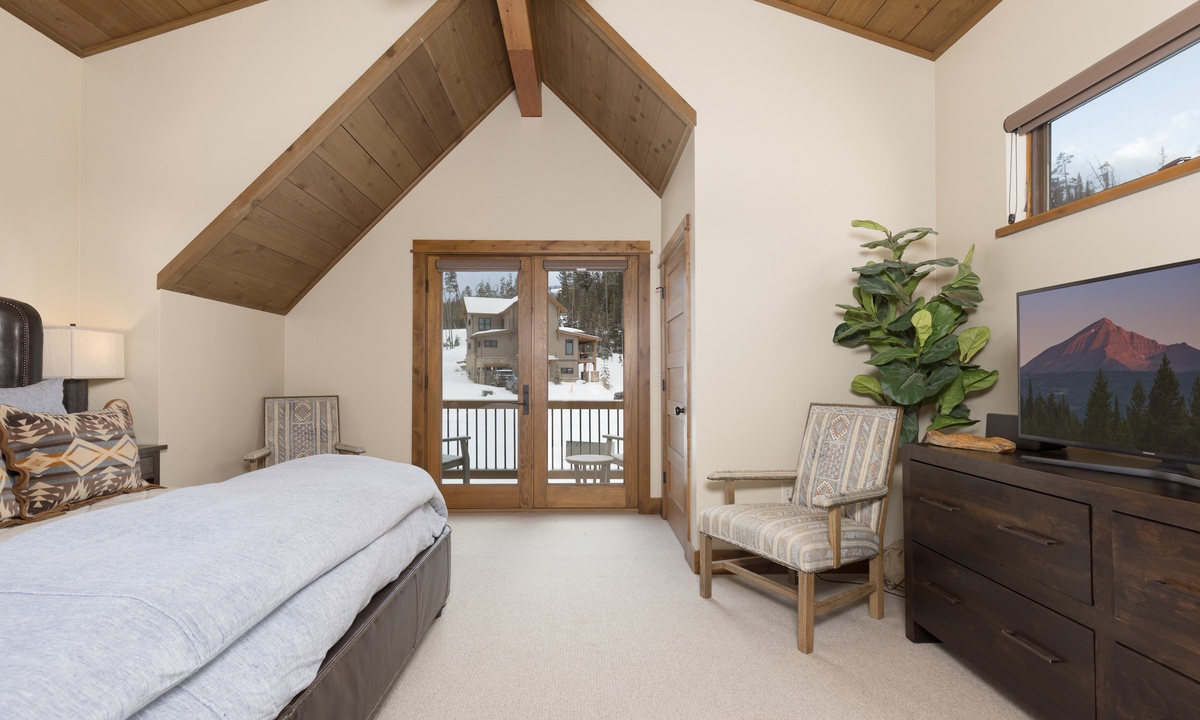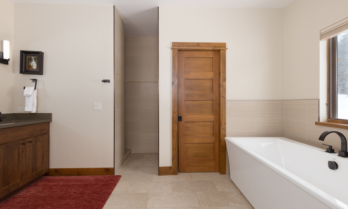 When it’s time to rest easy, the chalet comfortably accommodates up to 15 guests across five bedrooms. The main level Primary King Suite features an attached ensuite bathroom complete with a soaking tub, stand up shower, and luxe finishes. The upper level hosts two more King Suites each offering private ensuite bathrooms each with stand up showers and tons of privacy. On the lower level, find the lower level lounge with a flat screen TV and a plush wrap around couch that doubles as a Queen sleeper sofa. The lower level includes another King Suite with its own ensuite bathroom and a spacious bunk room featuring a Twin/Queen bunk bed & a Twin/Twin bunk bed. Combining luxury, comfort, and an unbeatable location, Homestead Chalet 5 is the perfect choice for an exceptional Big Sky getaway!