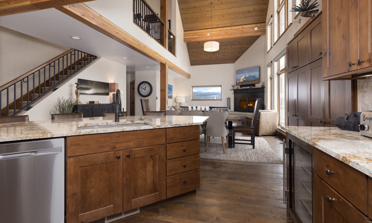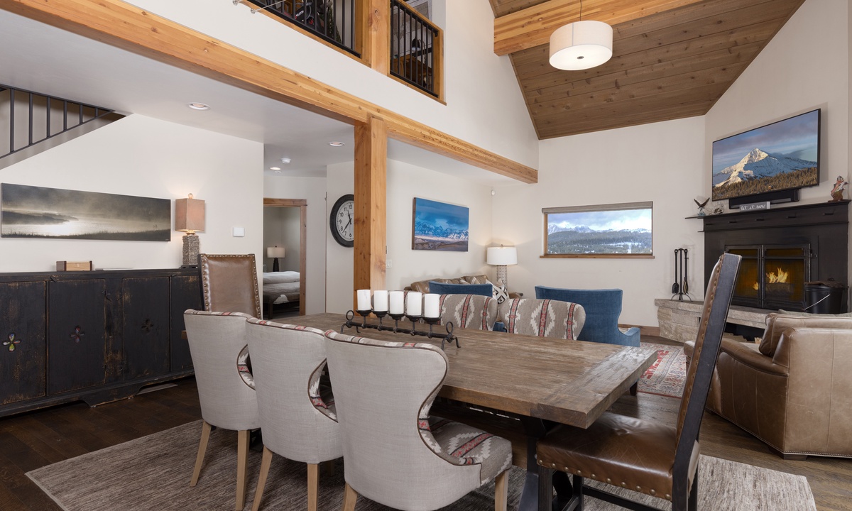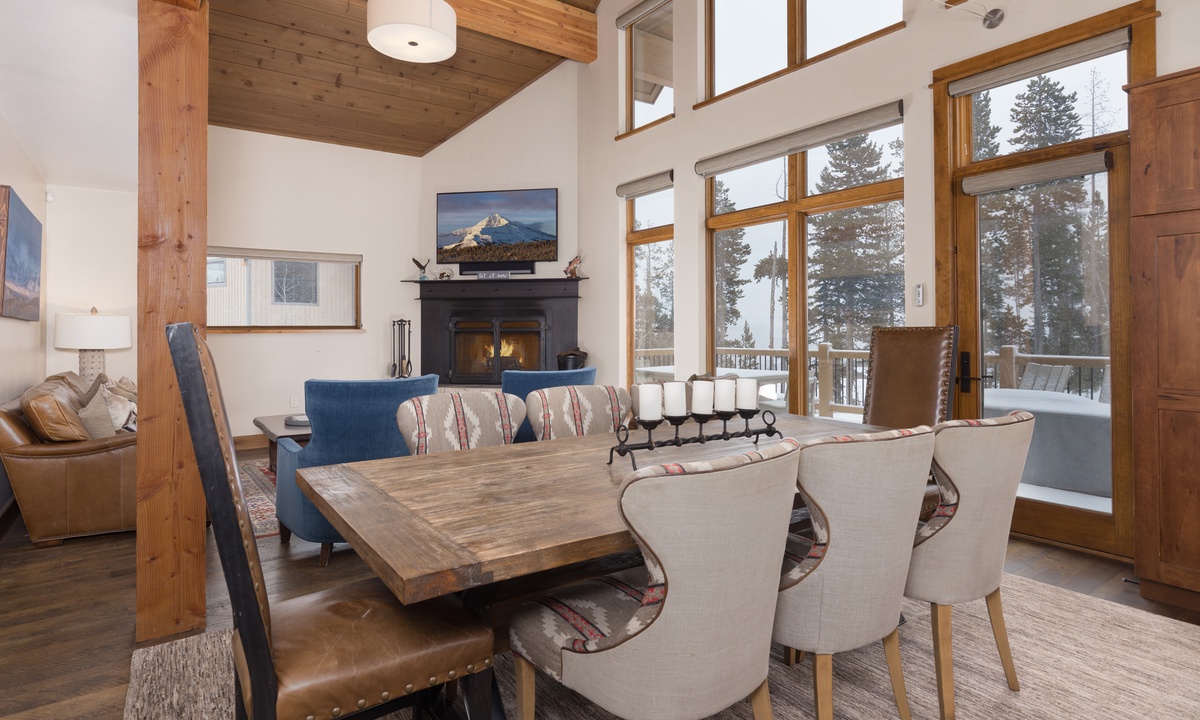 Inside, the 3,500 sq ft chalet blends contemporary alpine design with the rustic charm of a classic ski cabin. The main level great room features soaring floor to ceiling windows, a crackling fireplace, and plush furnishings. A fully equipped kitchen boasts stainless steel appliances, a gas range, and all the amenities. The generous dining area makes gathering easy and enjoyable, seating four at the breakfast bar and eight at the dining table. Step out onto the outdoor deck and lower level patio to enjoy the private bubbling hot tub, grill & dine al fresco, and gather around the fire pit to unwind after a day filled with adventure.