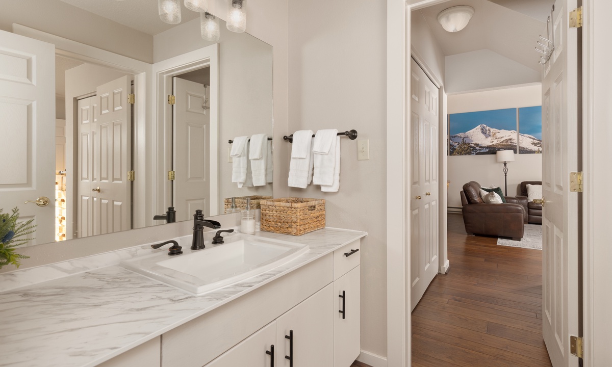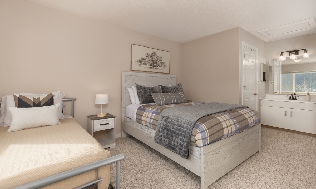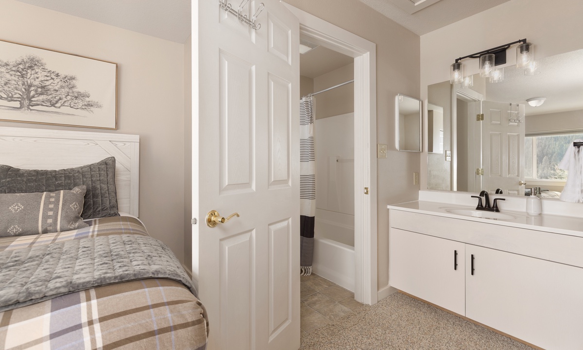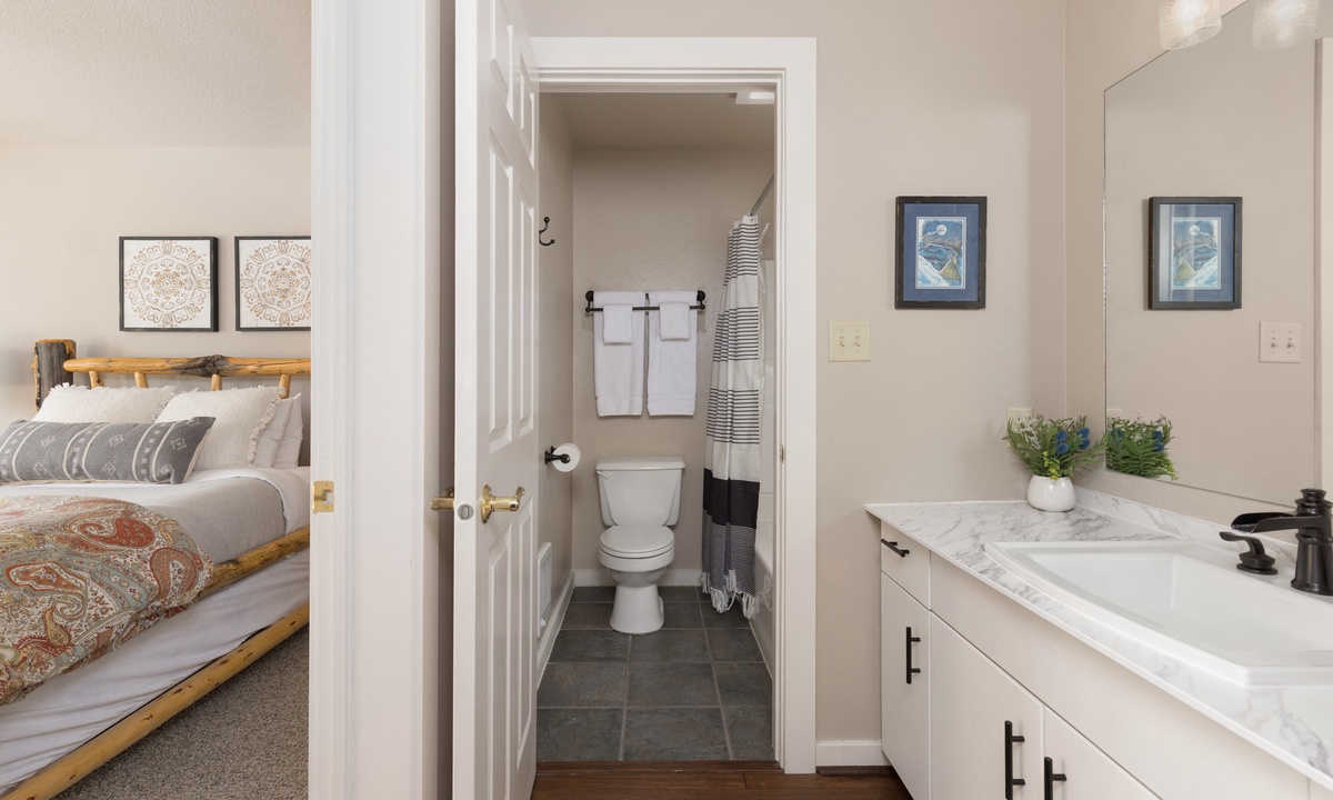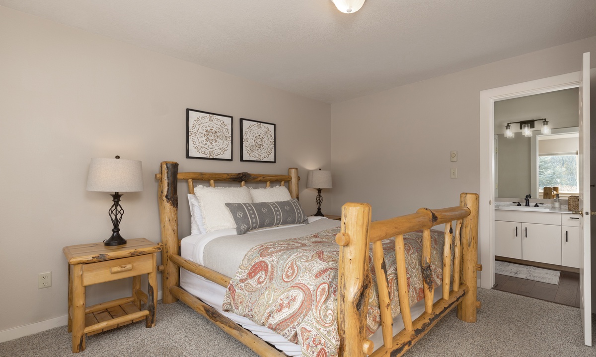 Ready to rest easy? Each bedroom is thoughtfully designed featuring cozy finishes, ensuite bathrooms, and plush bedding. The Primary King Suite can be found upstairs and boasts a huge walk in closet and attached bathroom with dual vanities and a stand up shower. One Queen Suite is located on the lower level and hosts a large flat screen TV and an ensuite bathroom with a shower/tub combo that also connects to the hallway. The second Queen Suite is upstairs and includes both a Queen and a Twin bed, and features its own attached bathroom with a single vanity and a shower/tub combo. When you’re ready to relax, step out through the sliding glass doors through the living area to the private bubbling hot tub, the perfect place to unwind. Whether you're traveling for a winter retreat or a warm summer stay, make Candlelight Meadows your home away from home for your next Big Sky getaway.