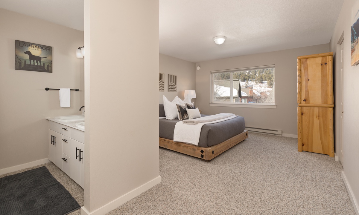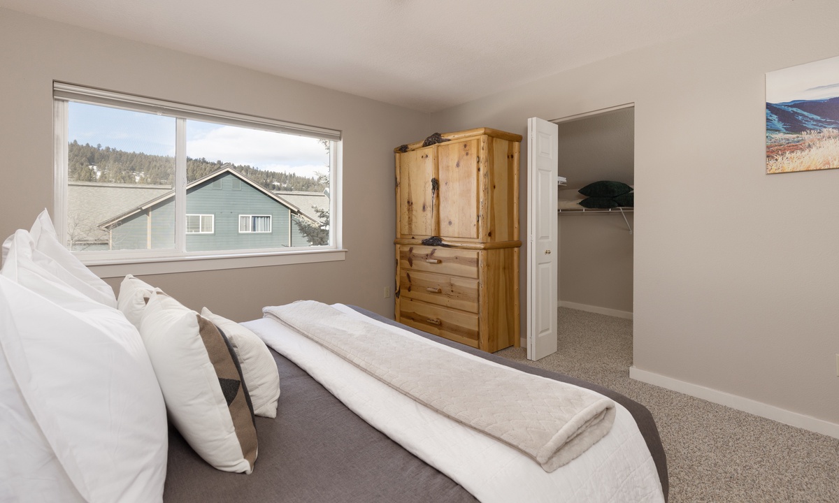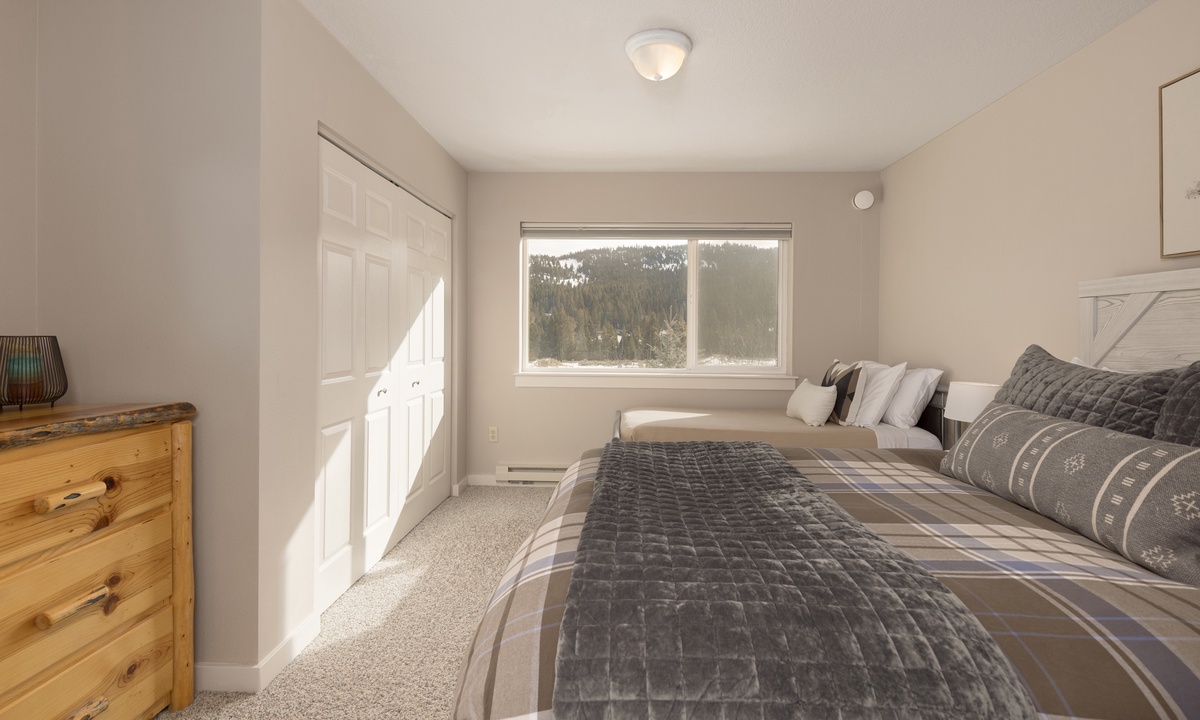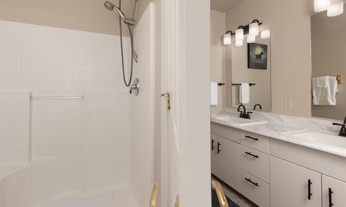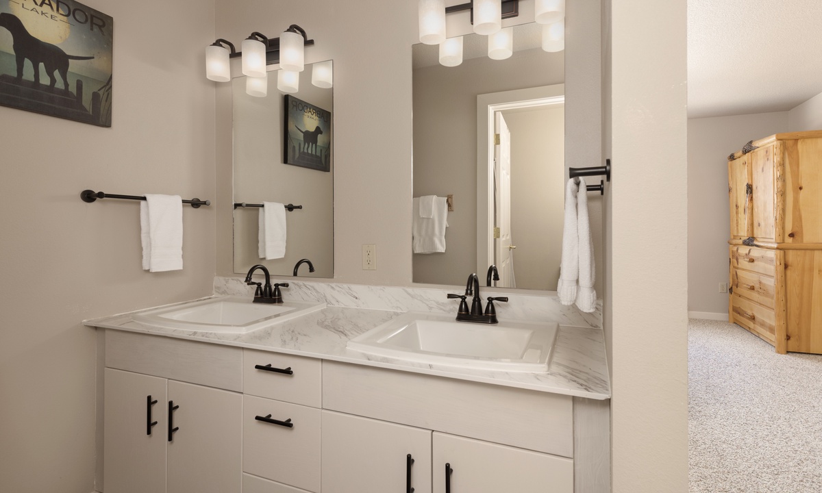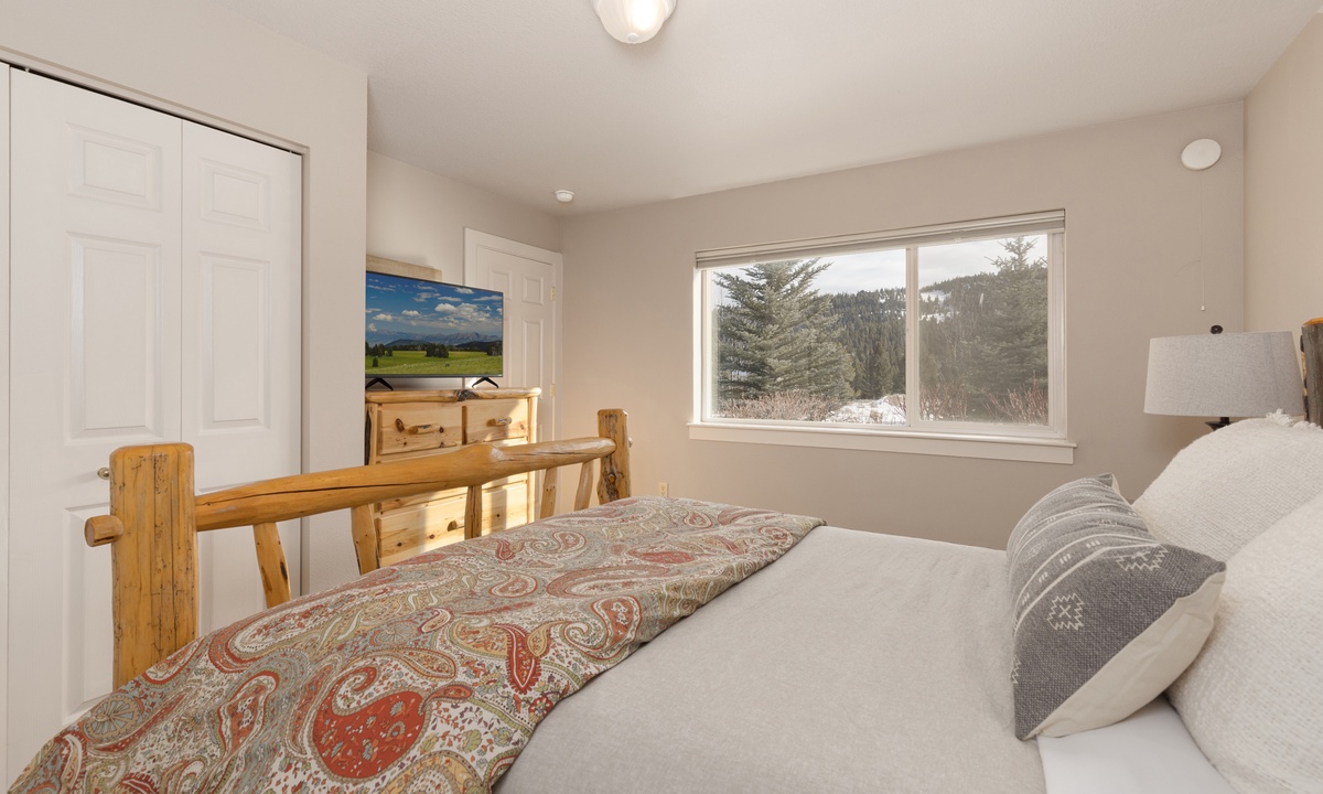 Ready to rest easy? Each bedroom is thoughtfully designed featuring cozy finishes, ensuite bathrooms, and plush bedding. The Primary King Suite can be found upstairs and boasts a huge walk in closet and attached bathroom with dual vanities and a stand up shower. One Queen Suite is located on the lower level and hosts a large flat screen TV and an ensuite bathroom with a shower/tub combo that also connects to the hallway. The second Queen Suite is upstairs and includes both a Queen and a Twin bed, and features its own attached bathroom with a single vanity and a shower/tub combo. When you’re ready to relax, step out through the sliding glass doors through the living area to the private bubbling hot tub, the perfect place to unwind. Whether you're traveling for a winter retreat or a warm summer stay, make Candlelight Meadows your home away from home for your next Big Sky getaway.