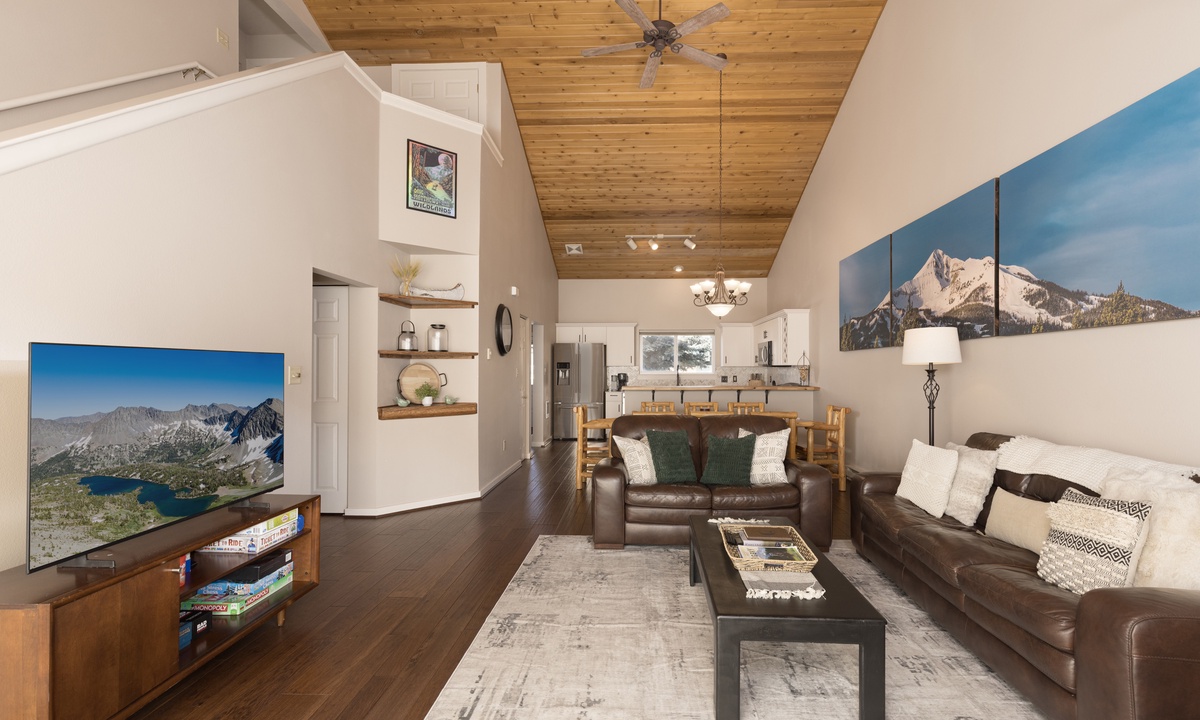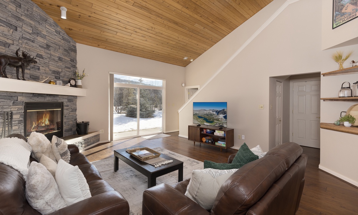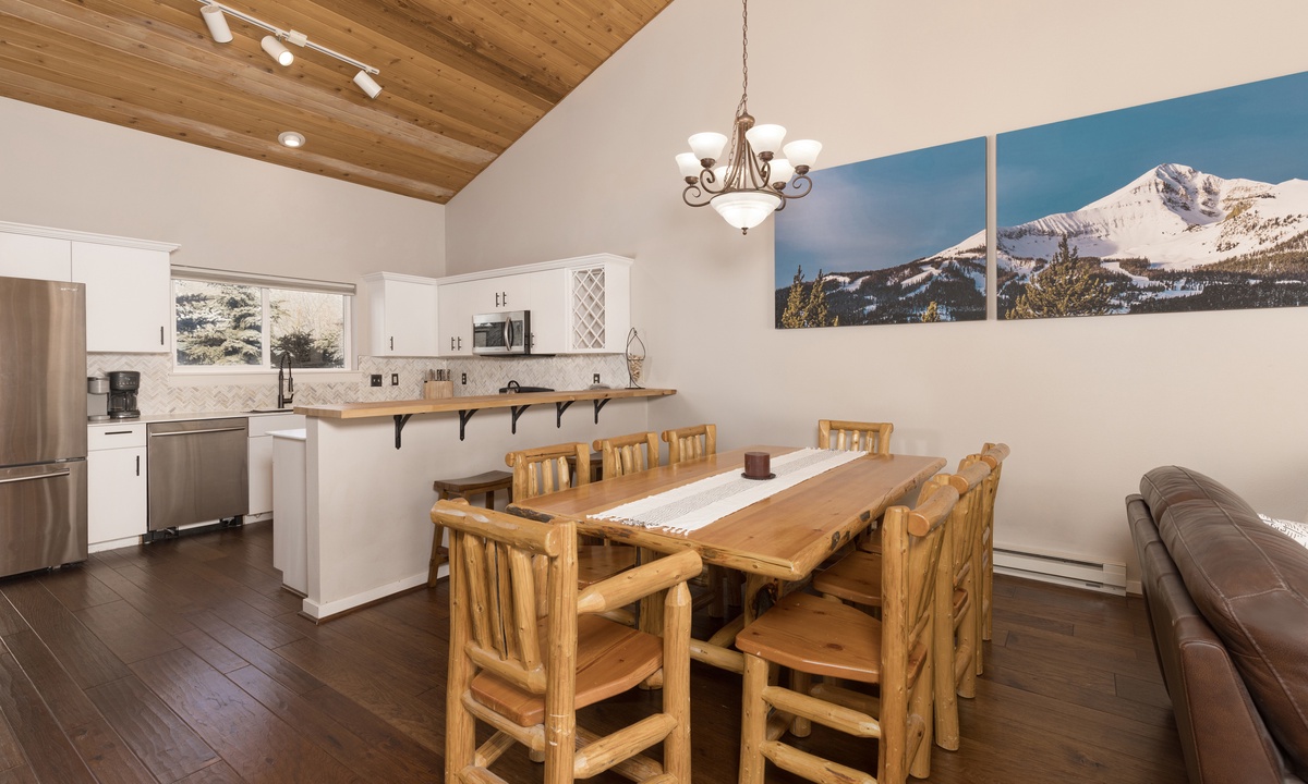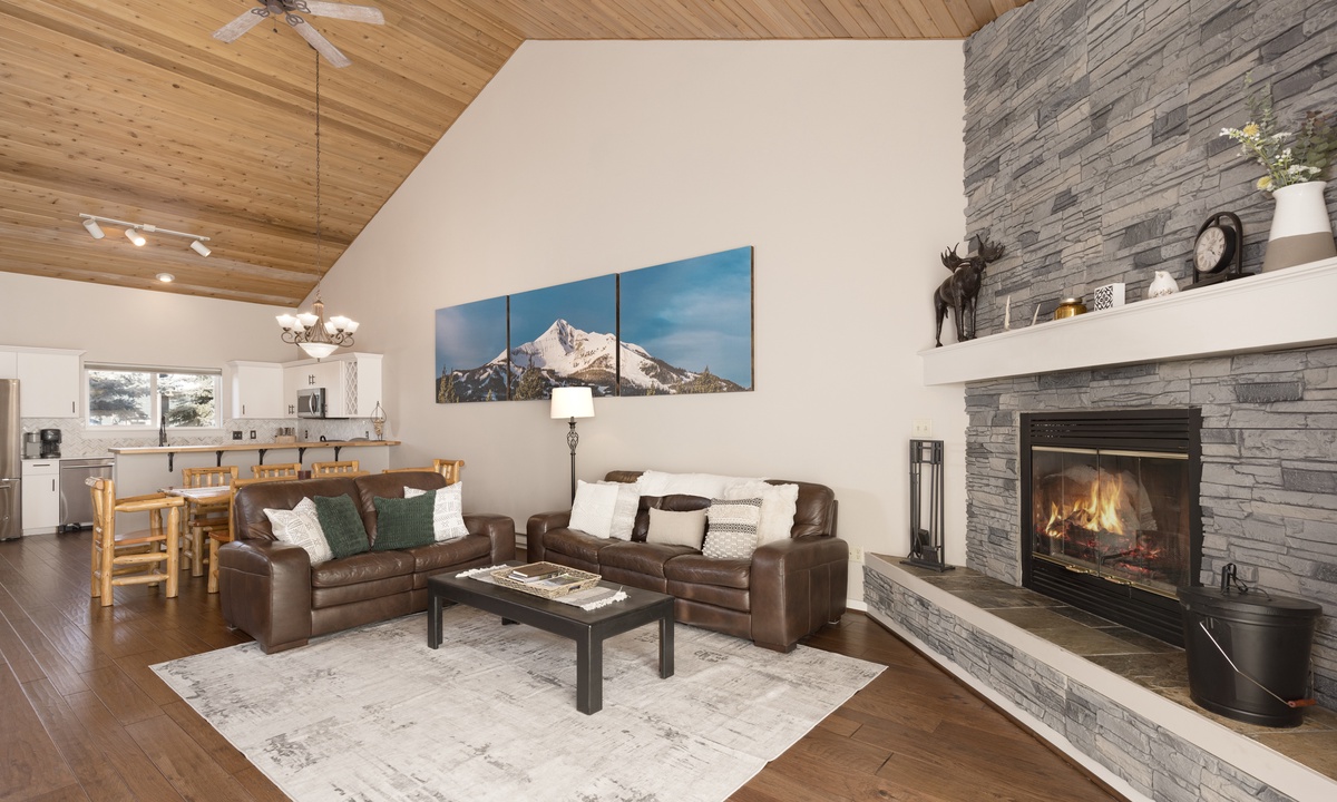 Enter on the main level into a convenient mudroom with hooks and cubbies for storage, then step into the great room featuring a bright and open living space with vaulted ceilings, contemporary artwork, and leather furnishings. Cozy up after a day full of adventure and watch a movie on the large flat screen TV, play a board game, or simply warm up by the crackling fireplace. The adjacent kitchen boasts granite countertops, stainless steel appliances, and all the essentials you’ll need to whip up dinner. When it's time to dine, pull up a chair at the breakfast bar with seating for two or sit down all together at the dining table with room for eight.