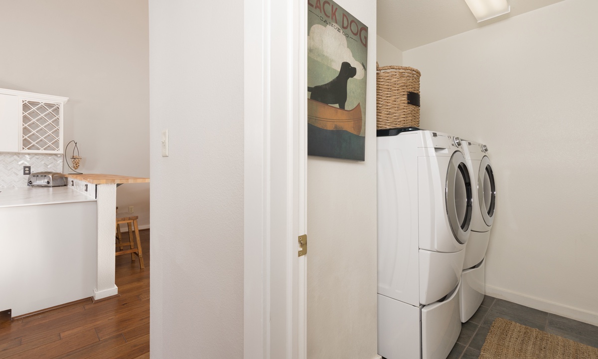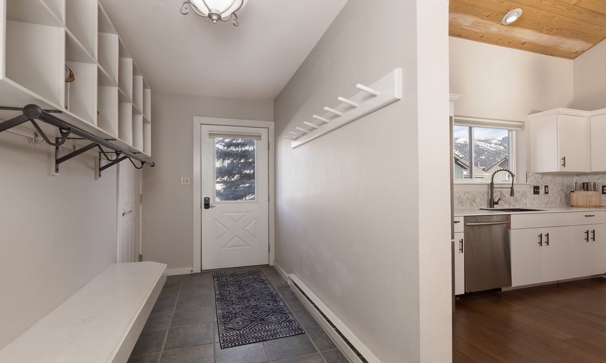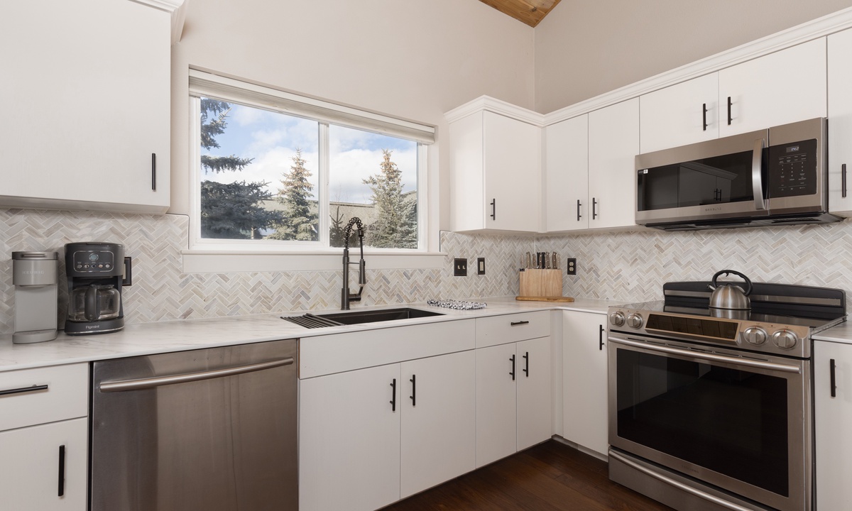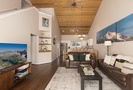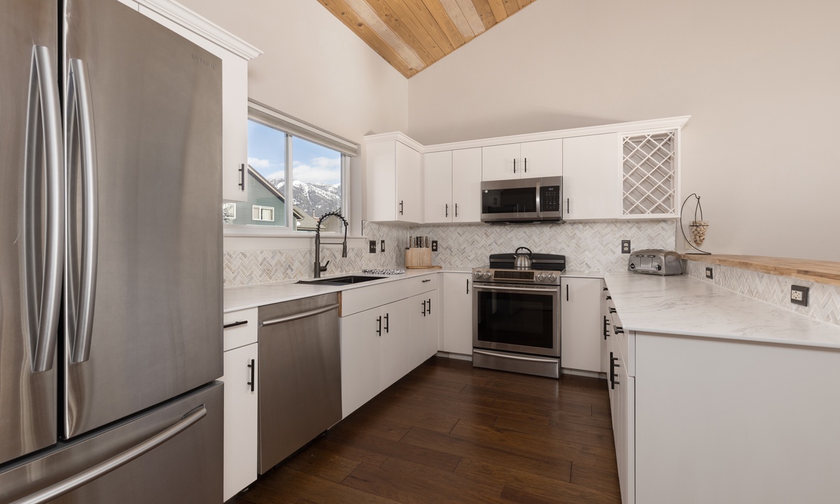Enter on the main level into a convenient mudroom with hooks and cubbies for storage, then step into the great room featuring a bright and open living space with vaulted ceilings, contemporary artwork, and leather furnishings. Cozy up after a day full of adventure and watch a movie on the large flat screen TV, play a board game, or simply warm up by the crackling fireplace. The adjacent kitchen boasts granite countertops, stainless steel appliances, and all the essentials you’ll need to whip up dinner. When it's time to dine, pull up a chair at the breakfast bar with seating for two or sit down all together at the dining table with room for eight.