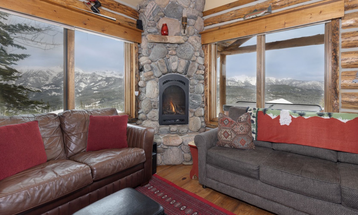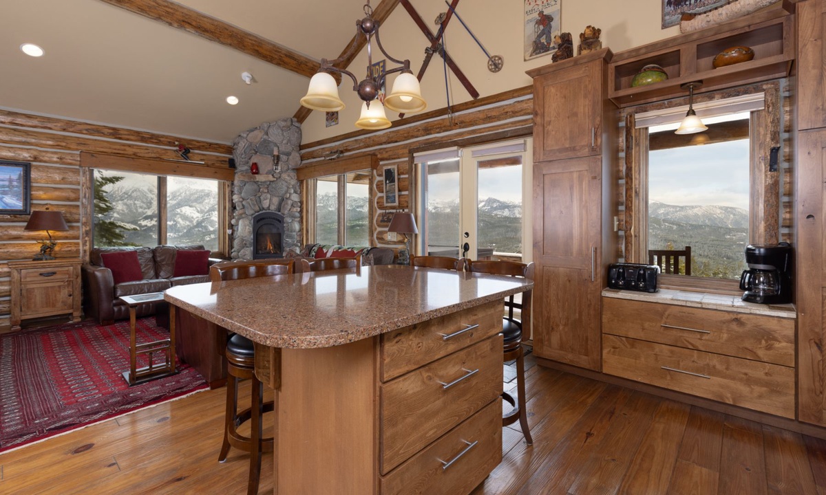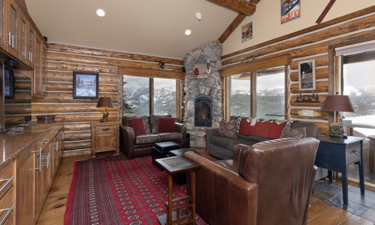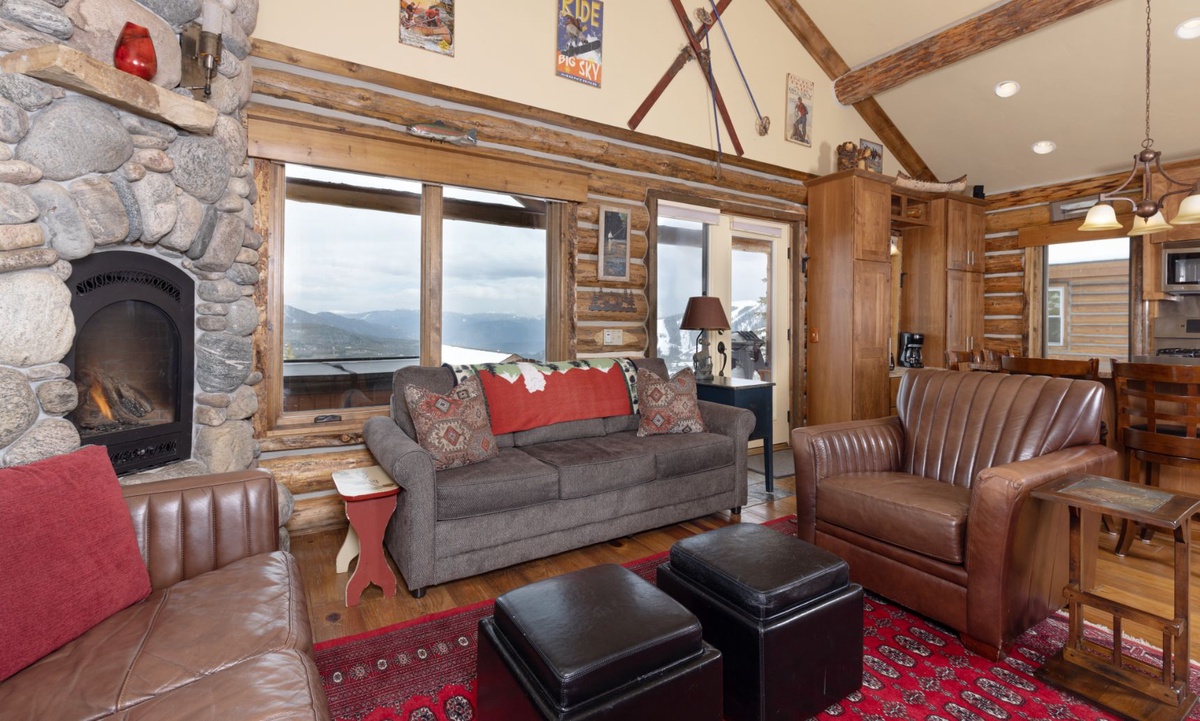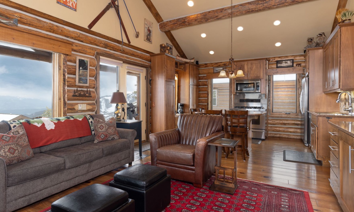 The open plan living area is welcoming with high vaulted ceilings, rustic log beams, warm wood flooring, a gas fireplace to cozy around after skiing or exploring Big Sky and a flat screen TV for entertainment. The kitchen is well-equipped with modern appliances, a vintage-style gas range and oven and a dining table to share family style meals or a quick midday snack between ski runs. Step outside to a private deck boasting some of the best views in Big Sky there you will find the hot tub. Whether you’re sipping champagne and planning your next day of Big Sky adventures as the sun sets from your private hot tub, or simply soaking up the panoramic alpine views, this perfect perch is an unbeatable and exceptionally scenic gathering place.