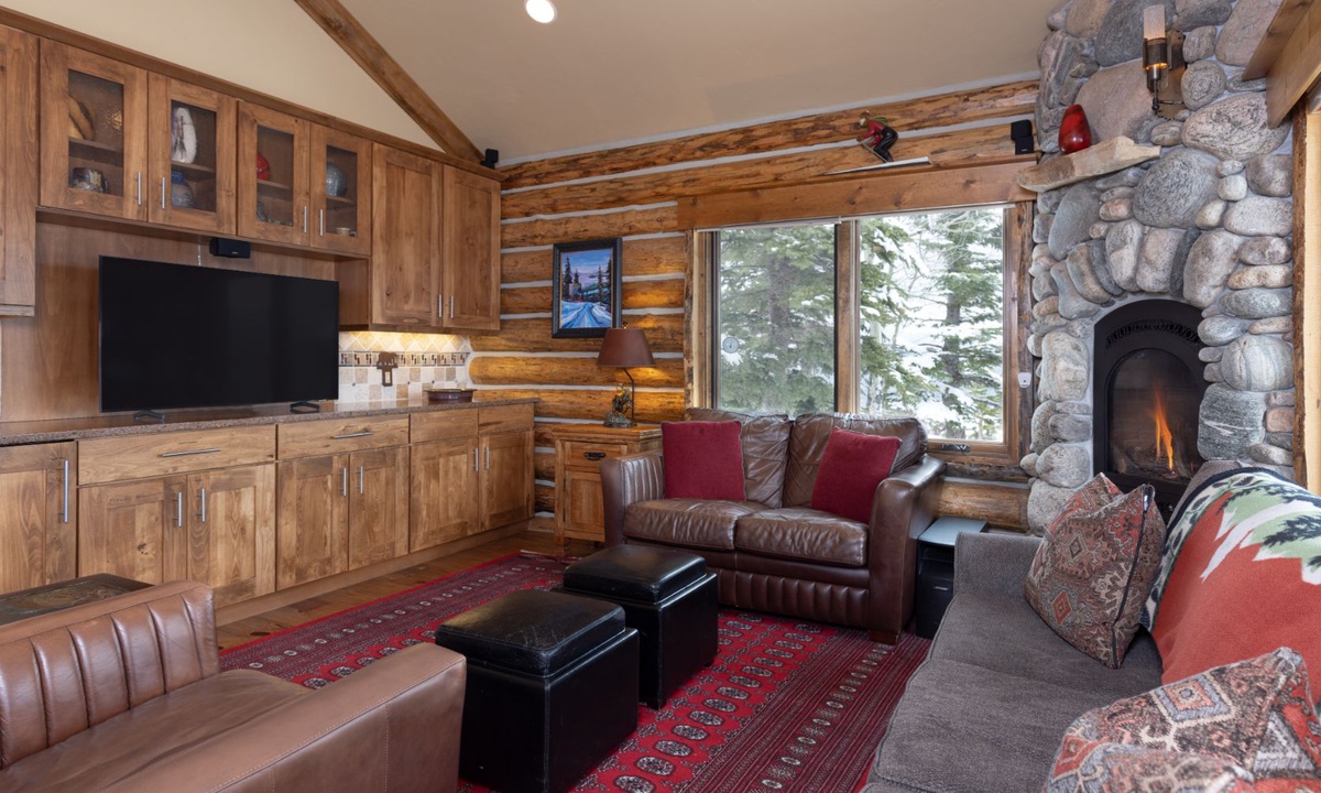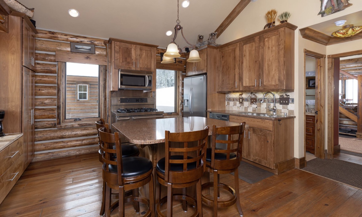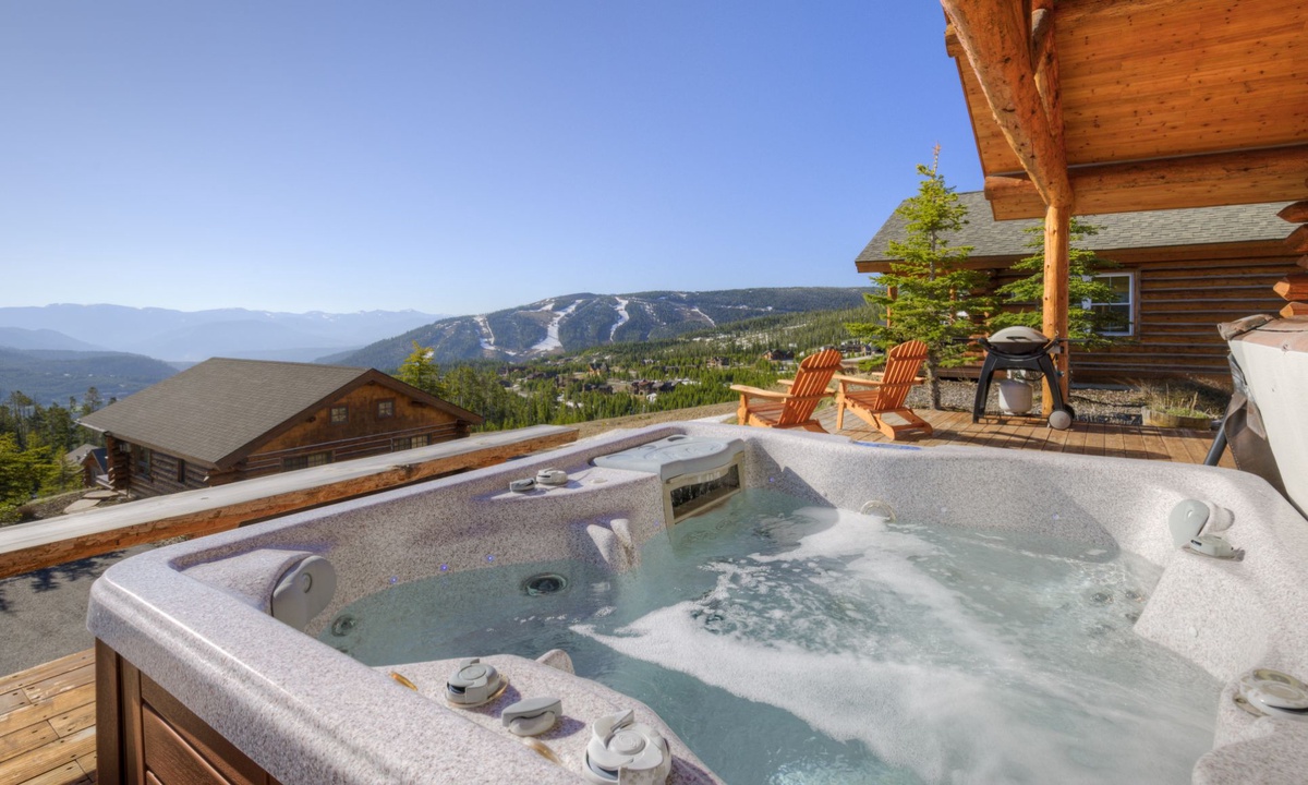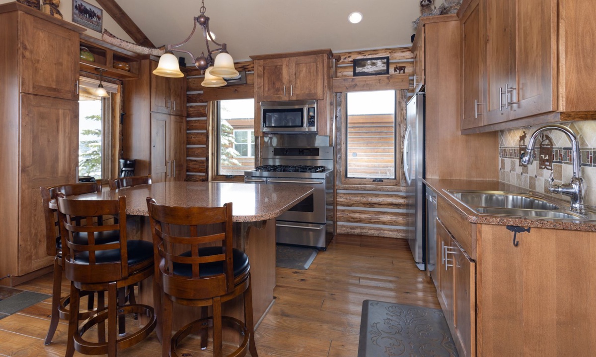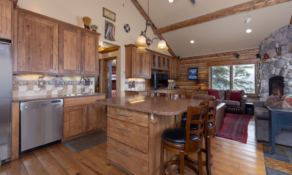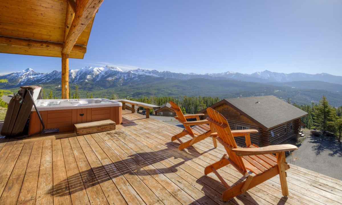 The open plan living area is welcoming with high vaulted ceilings, rustic log beams, warm wood flooring, a gas fireplace to cozy around after skiing or exploring Big Sky and a flat screen TV for entertainment. The kitchen is well-equipped with modern appliances, a vintage-style gas range and oven and a dining table to share family style meals or a quick midday snack between ski runs. Step outside to a private deck boasting some of the best views in Big Sky there you will find the hot tub. Whether you’re sipping champagne and planning your next day of Big Sky adventures as the sun sets from your private hot tub, or simply soaking up the panoramic alpine views, this perfect perch is an unbeatable and exceptionally scenic gathering place.