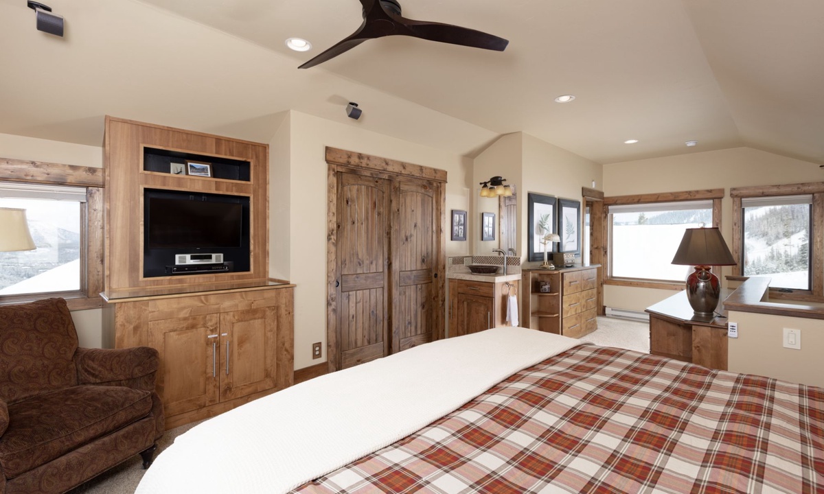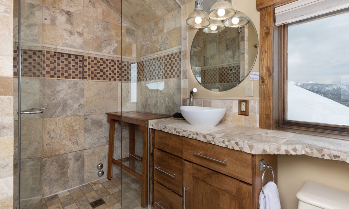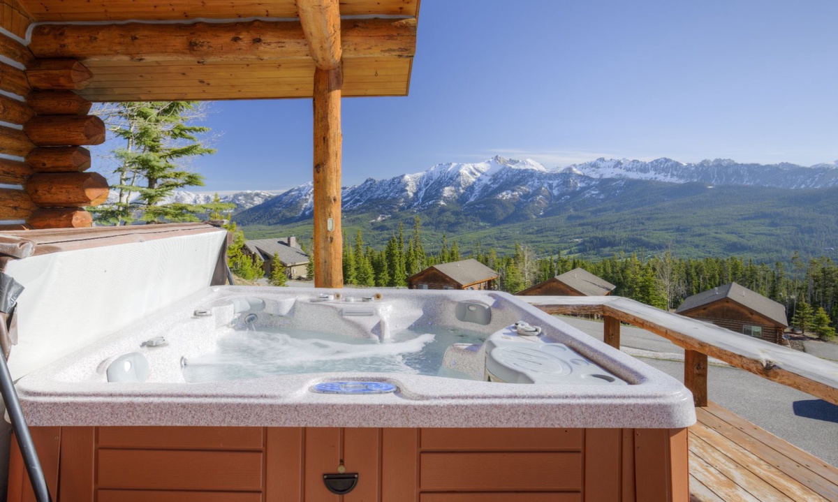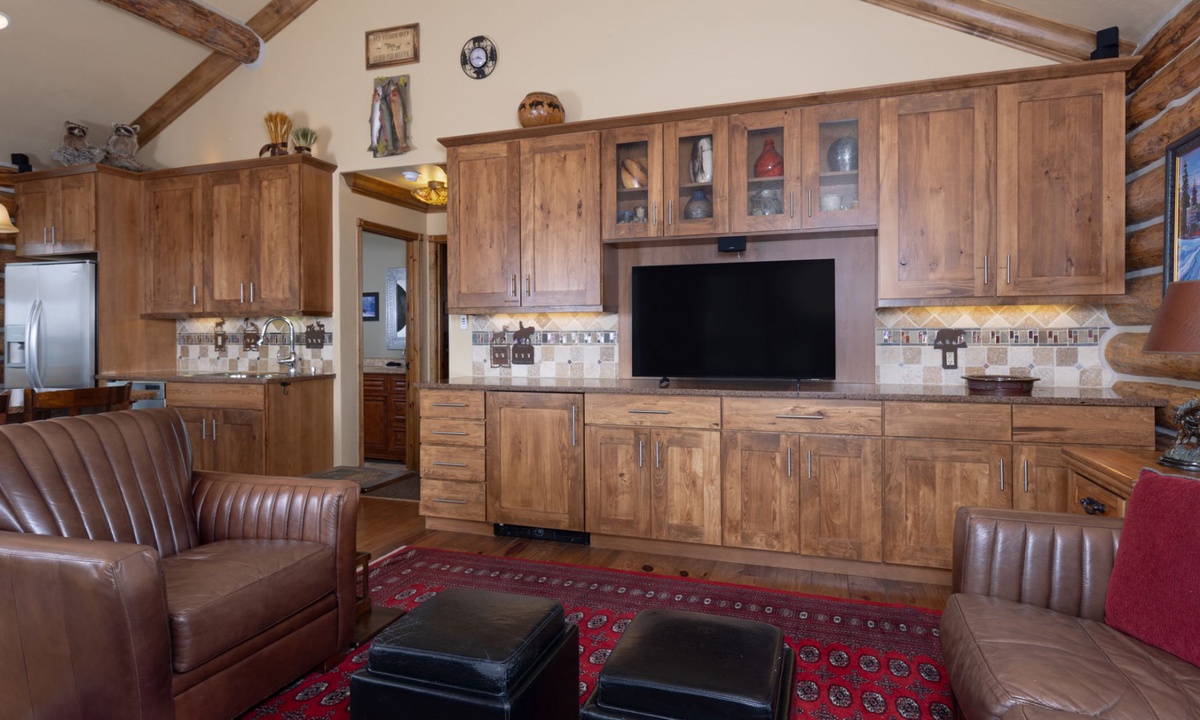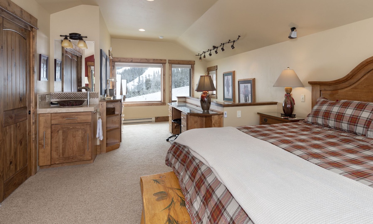 The open plan living area is welcoming with high vaulted ceilings, rustic log beams, warm wood flooring, a gas fireplace to cozy around after skiing or exploring Big Sky and a flat screen TV for entertainment. The kitchen is well-equipped with modern appliances, a vintage-style gas range and oven and a dining table to share family style meals or a quick midday snack between ski runs. Step outside to a private deck boasting some of the best views in Big Sky there you will find the hot tub. Whether you’re sipping champagne and planning your next day of Big Sky adventures as the sun sets from your private hot tub, or simply soaking up the panoramic alpine views, this perfect perch is an unbeatable and exceptionally scenic gathering place.
