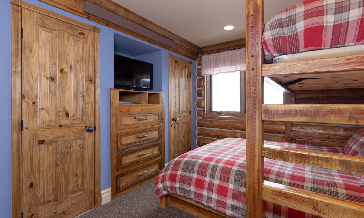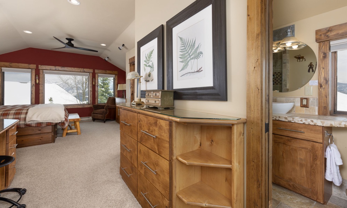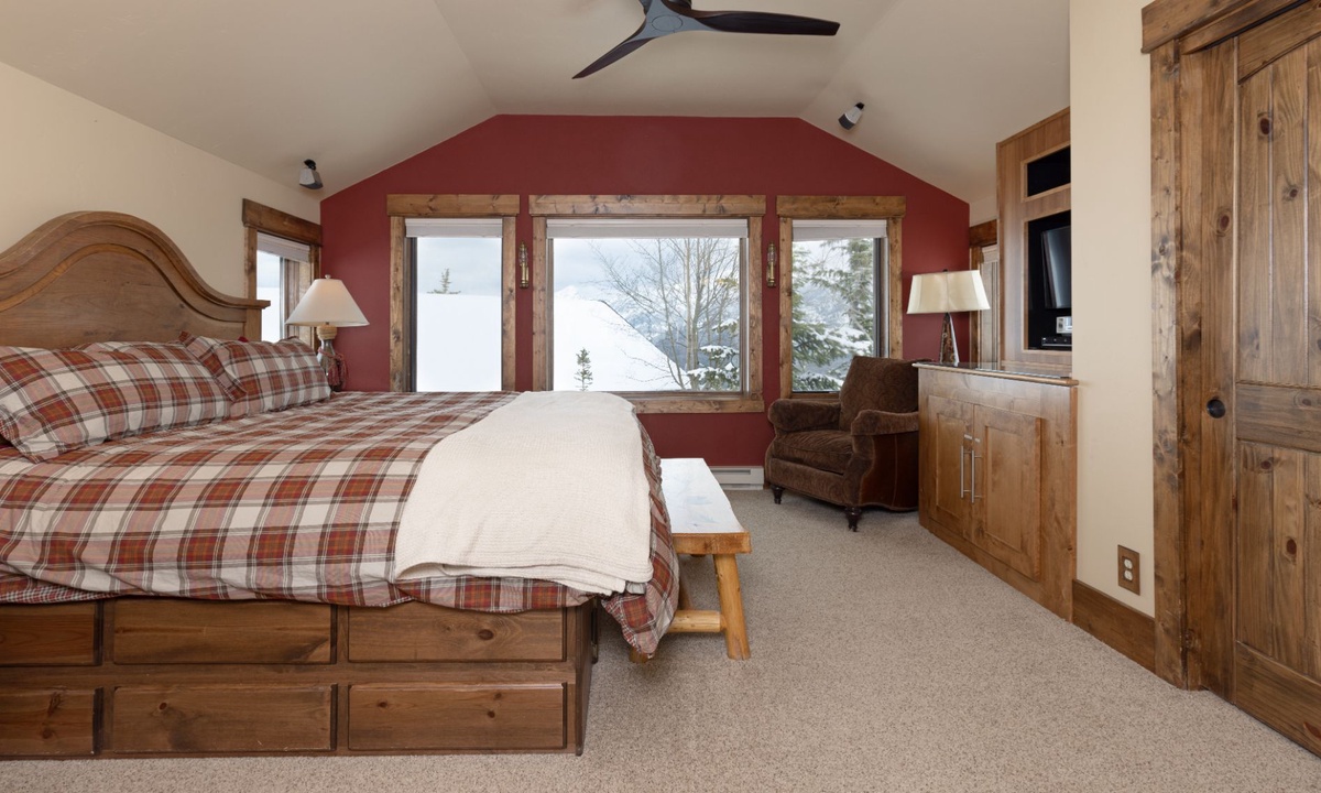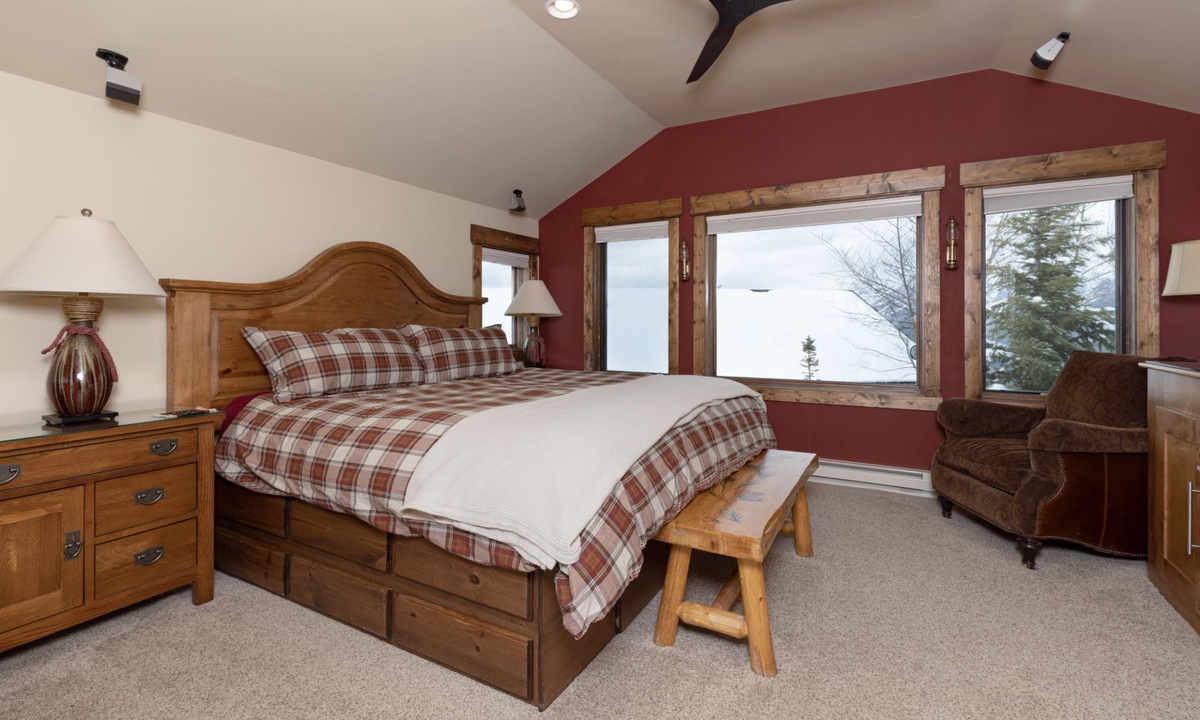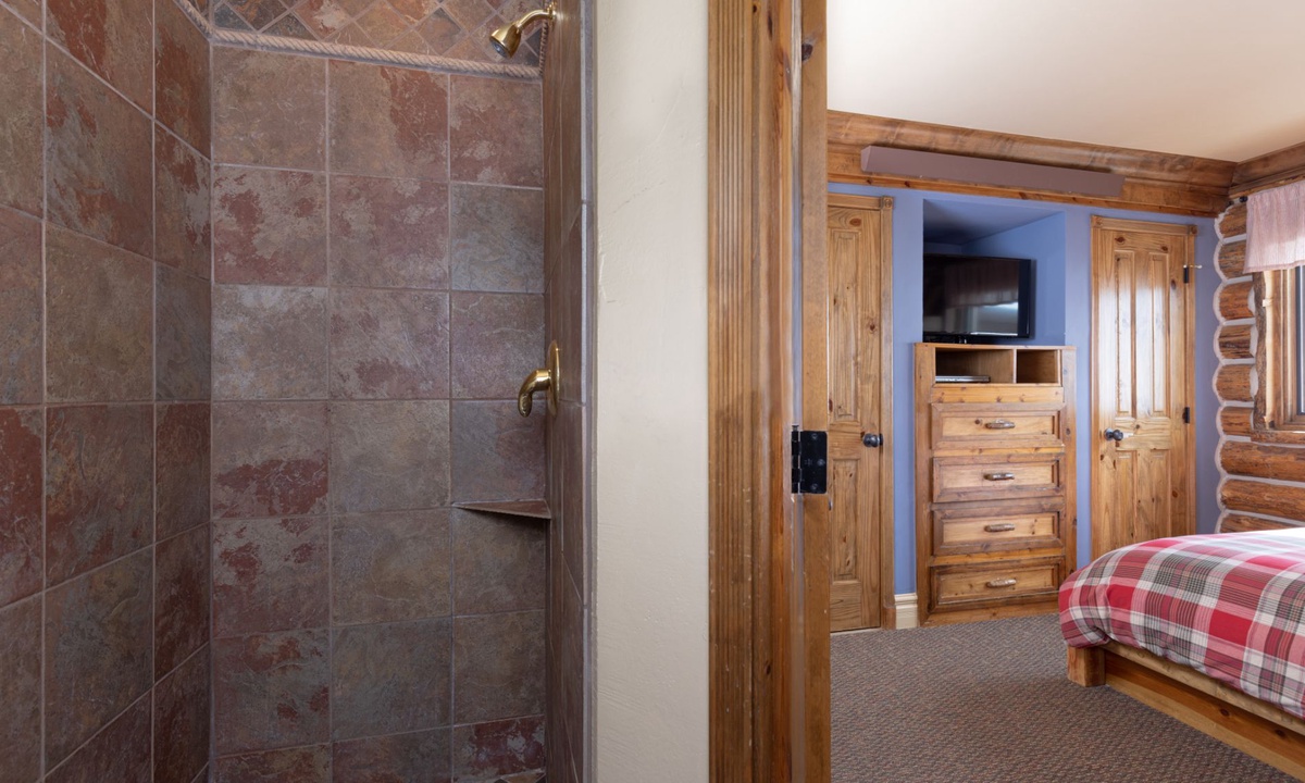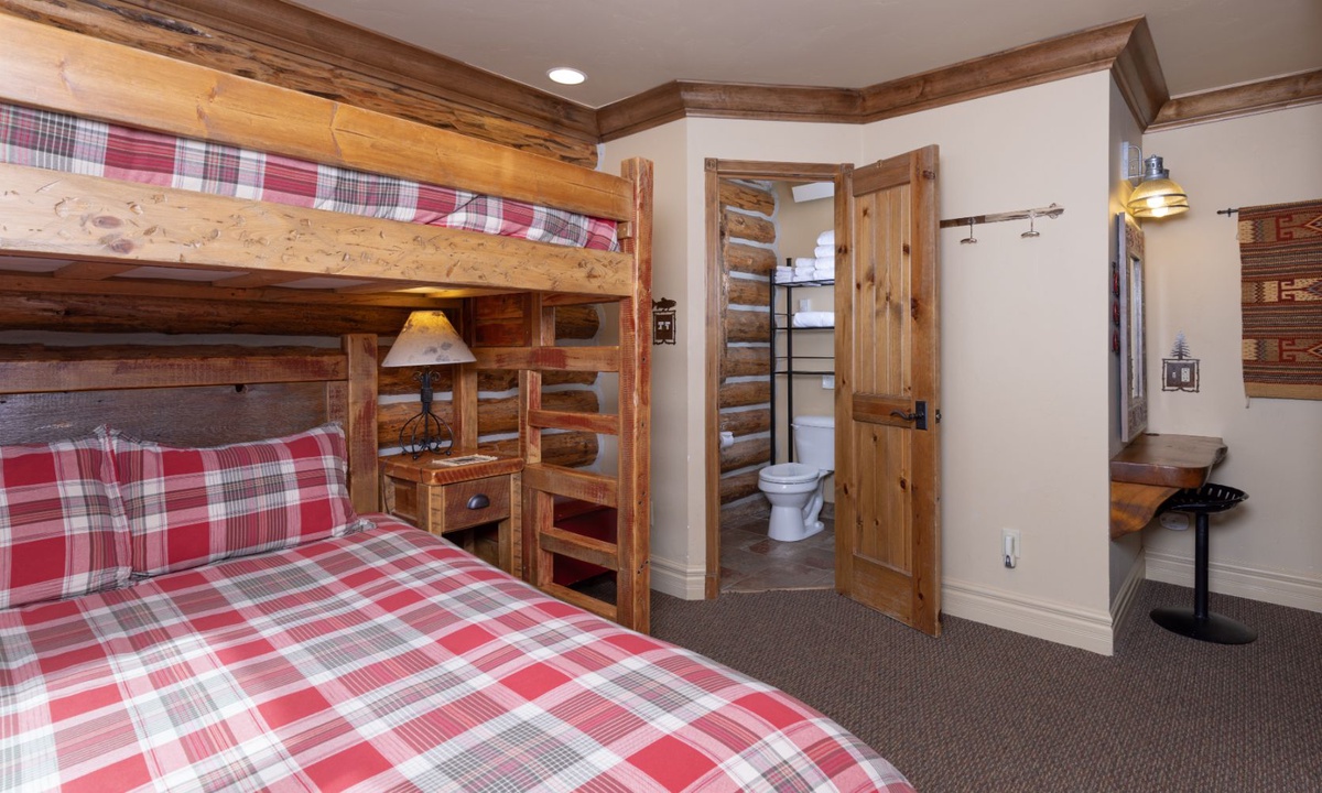This cozy Cowboy Heaven cabin comfortably accommodates up to 5 guests in 2 spacious bedrooms. The master suite features a custom king bed and a private bathroom with a steam shower. Bedroom 2 has a Captain's bunk bed with a queen bed on bottom and a twin bed on top, and a private bathroom with a shower. All bedrooms are equipped with high-quality furnishings and linens for a night of comfort.
