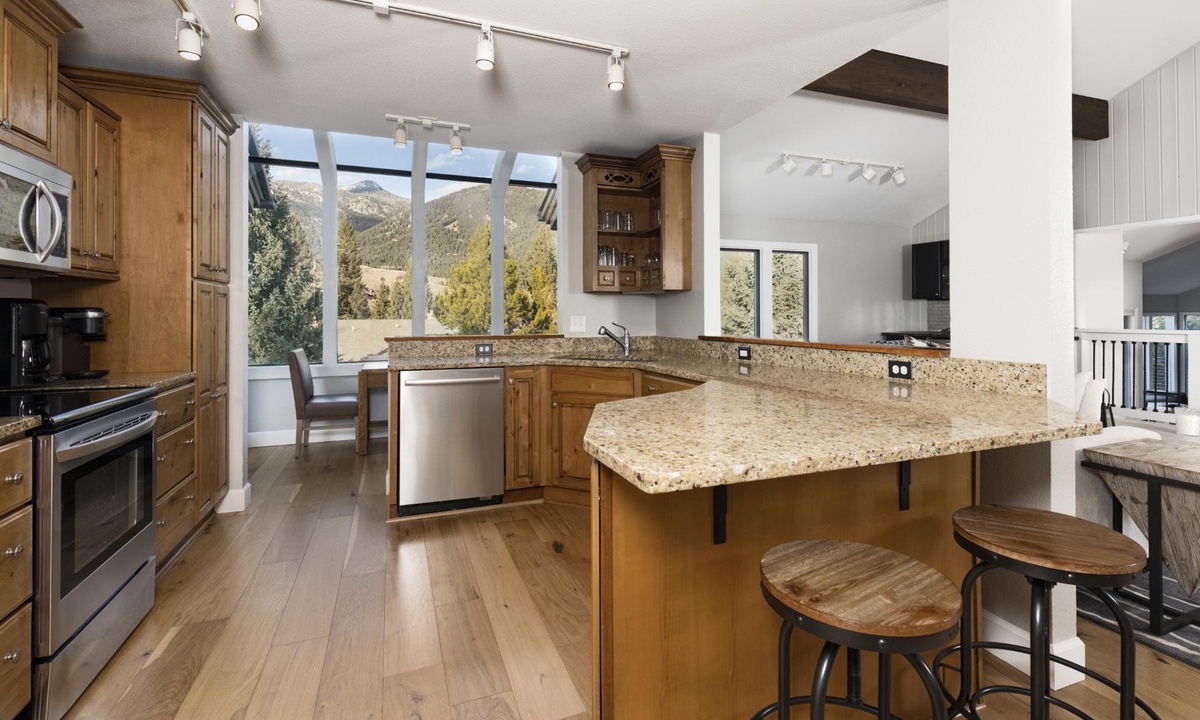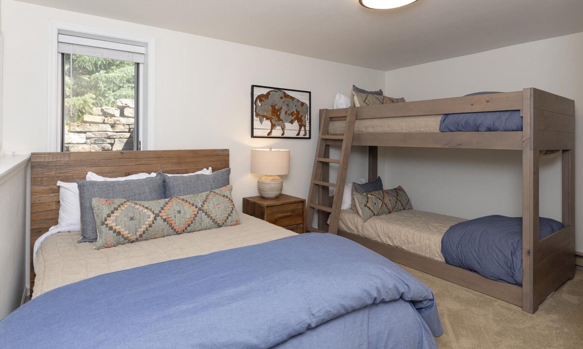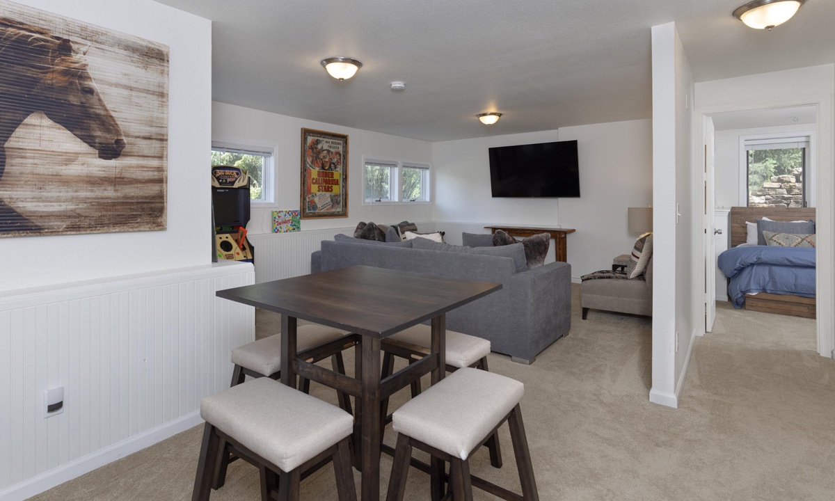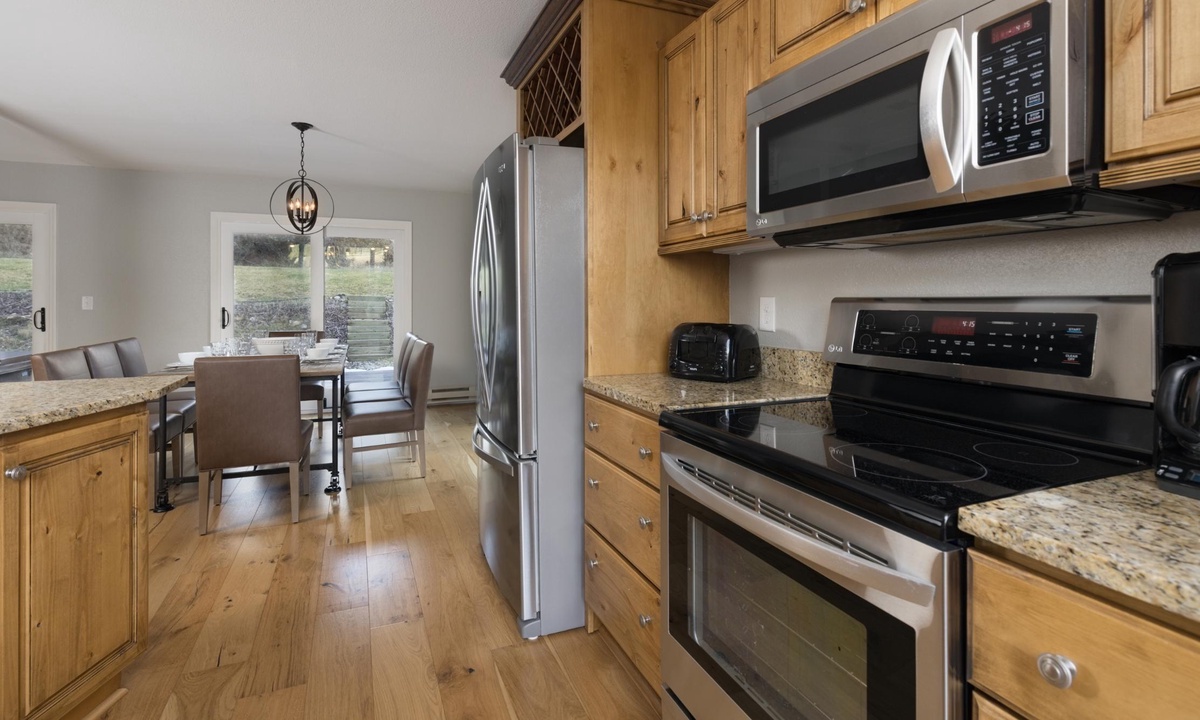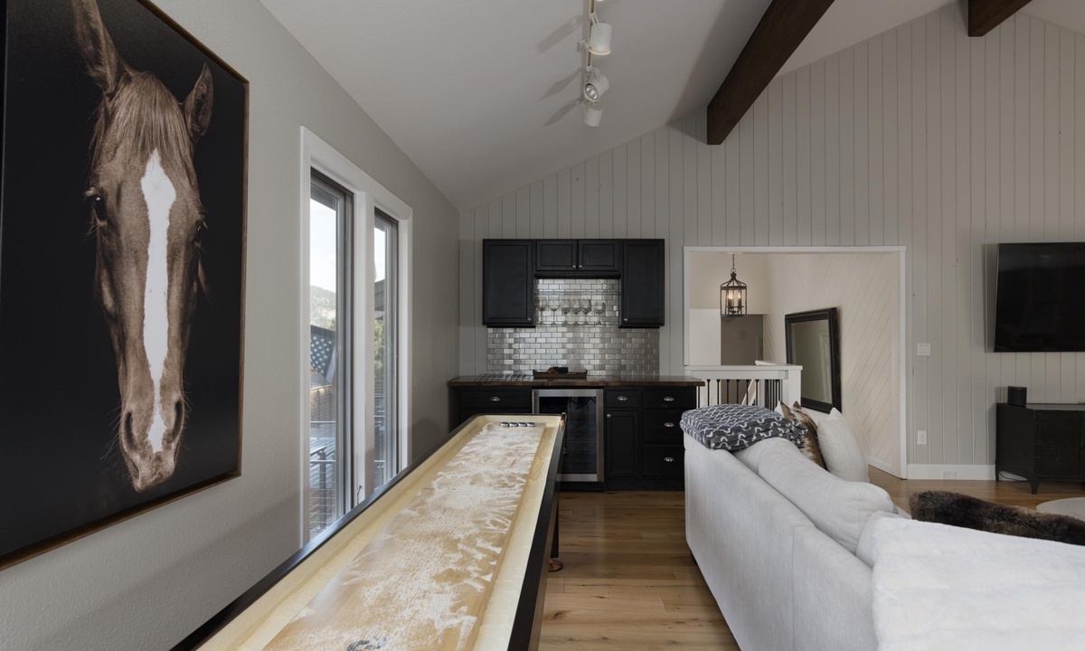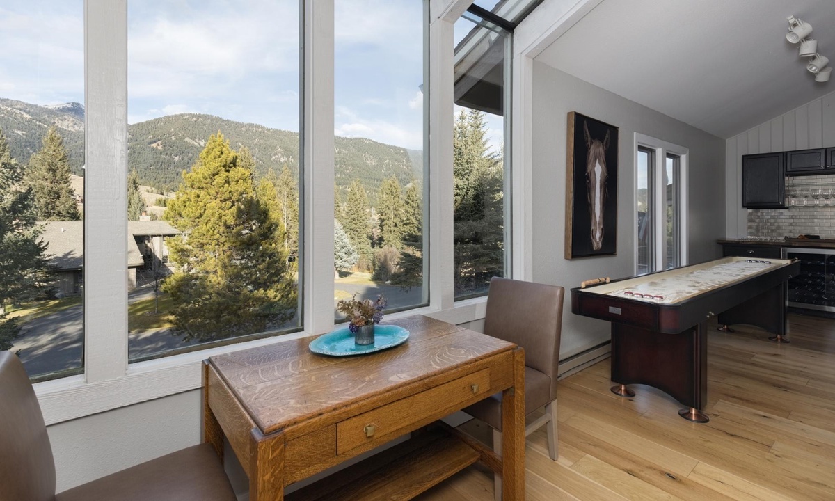 The great room is open plan with plenty of space to reconnect and entertain friends and family. The living area is warm and inviting with a stone clad fireplace, shuffleboard, flat screen TV for entertainment and a wet bar and wine cooler for perfect Big Sky sundowners. The kitchen is fully-equipped with modern stainless-steel appliances, gorgeous granite counters and all you need to prepare home-cooked meals when you’re not exploring Big Sky’s fun restaurant scene.