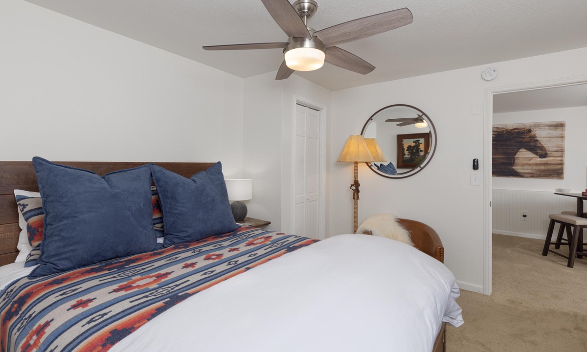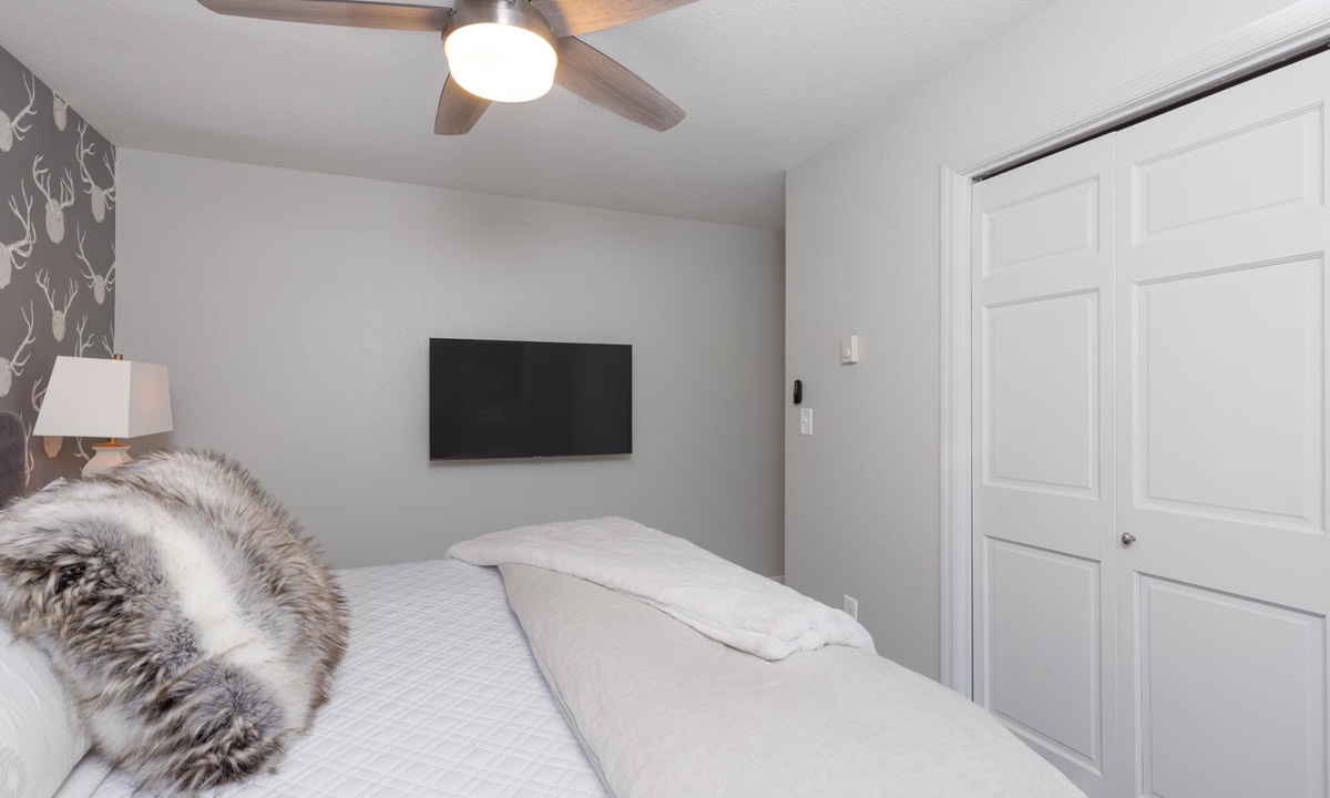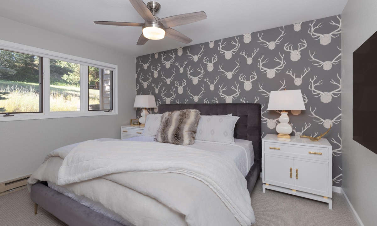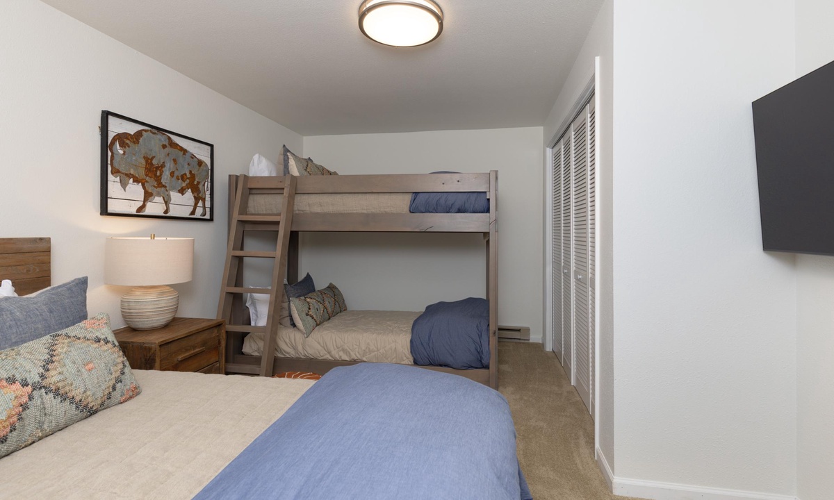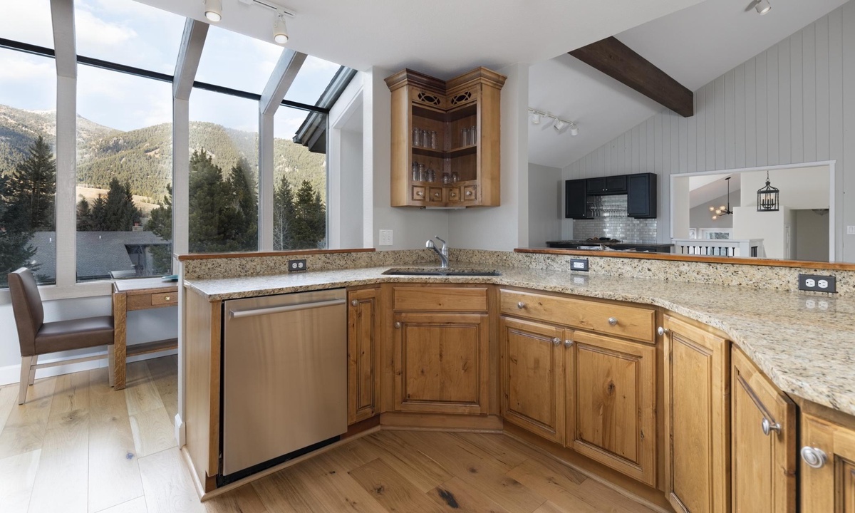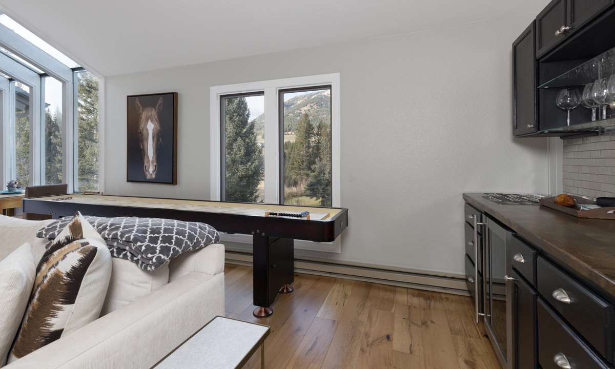 The great room is open plan with plenty of space to reconnect and entertain friends and family. The living area is warm and inviting with a stone clad fireplace, shuffleboard, flat screen TV for entertainment and a wet bar and wine cooler for perfect Big Sky sundowners. The kitchen is fully-equipped with modern stainless-steel appliances, gorgeous granite counters and all you need to prepare home-cooked meals when you’re not exploring Big Sky’s fun restaurant scene.