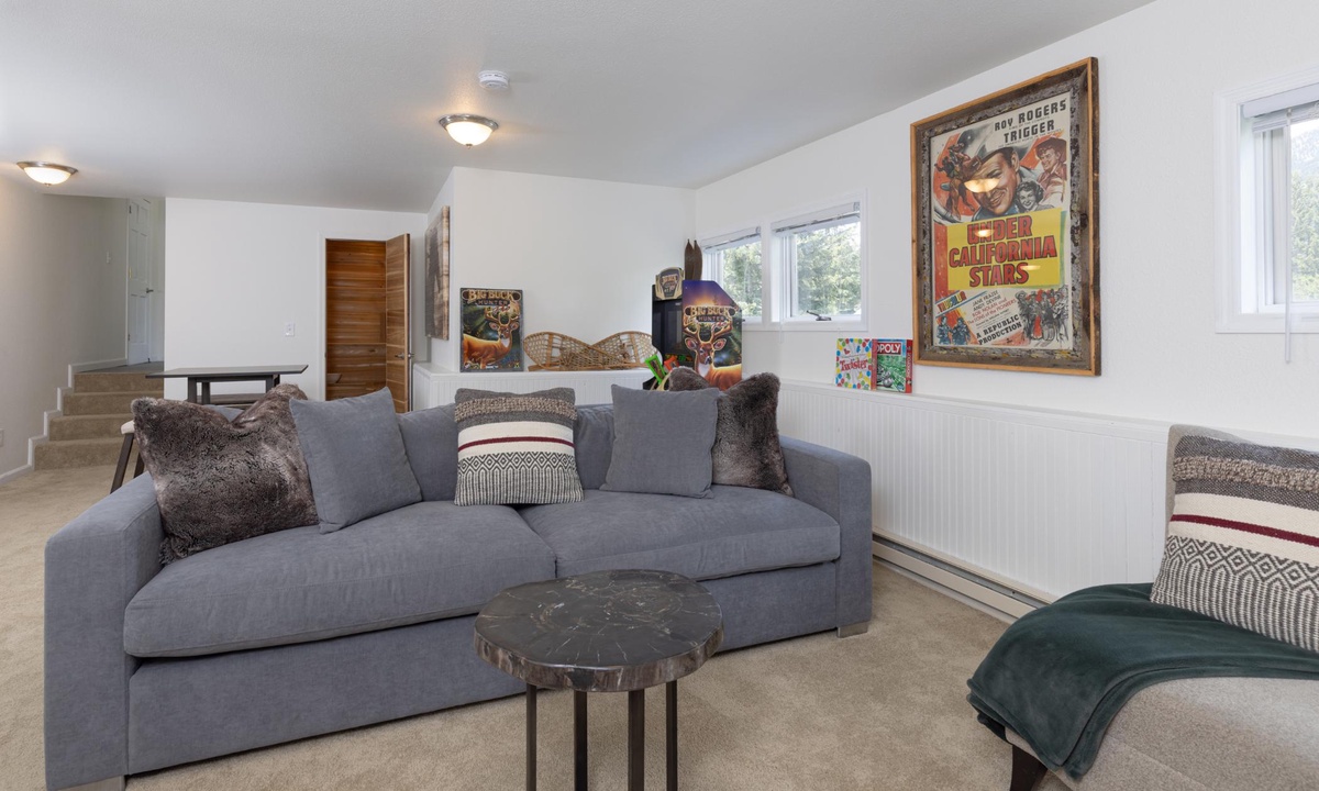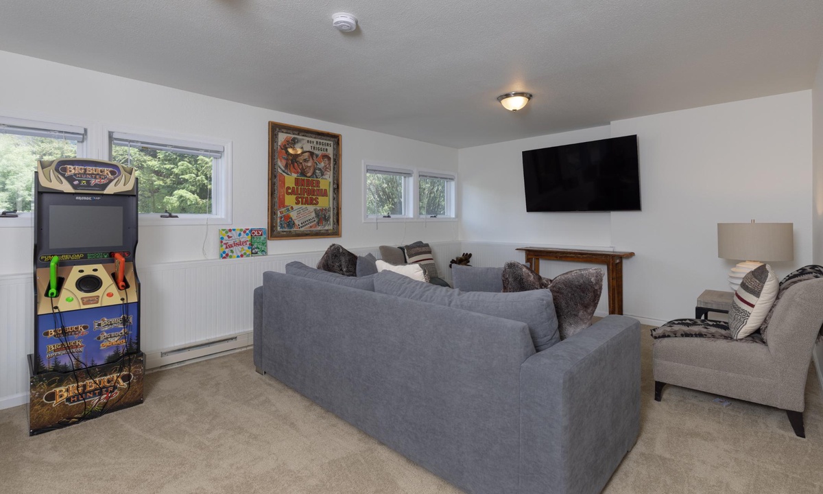 The lower level of this spacious home features a cozy living area and deck, family den and four beautifully appointed bedrooms. The master bedroom features a wooden king-size bed, private bathroom with a large glass walk-in shower, and direct access to the deck shared with the living area. Bedroom 2 has a king-sized bed, Bedroom 3 a queen-sized bed and the fourth bedroom has one queen bed and an XL twin bunk bed.The third living area is the den on the lower level complete with a futon bed, smart TV, Big Buck Hunter and a very inviting custom sauna.