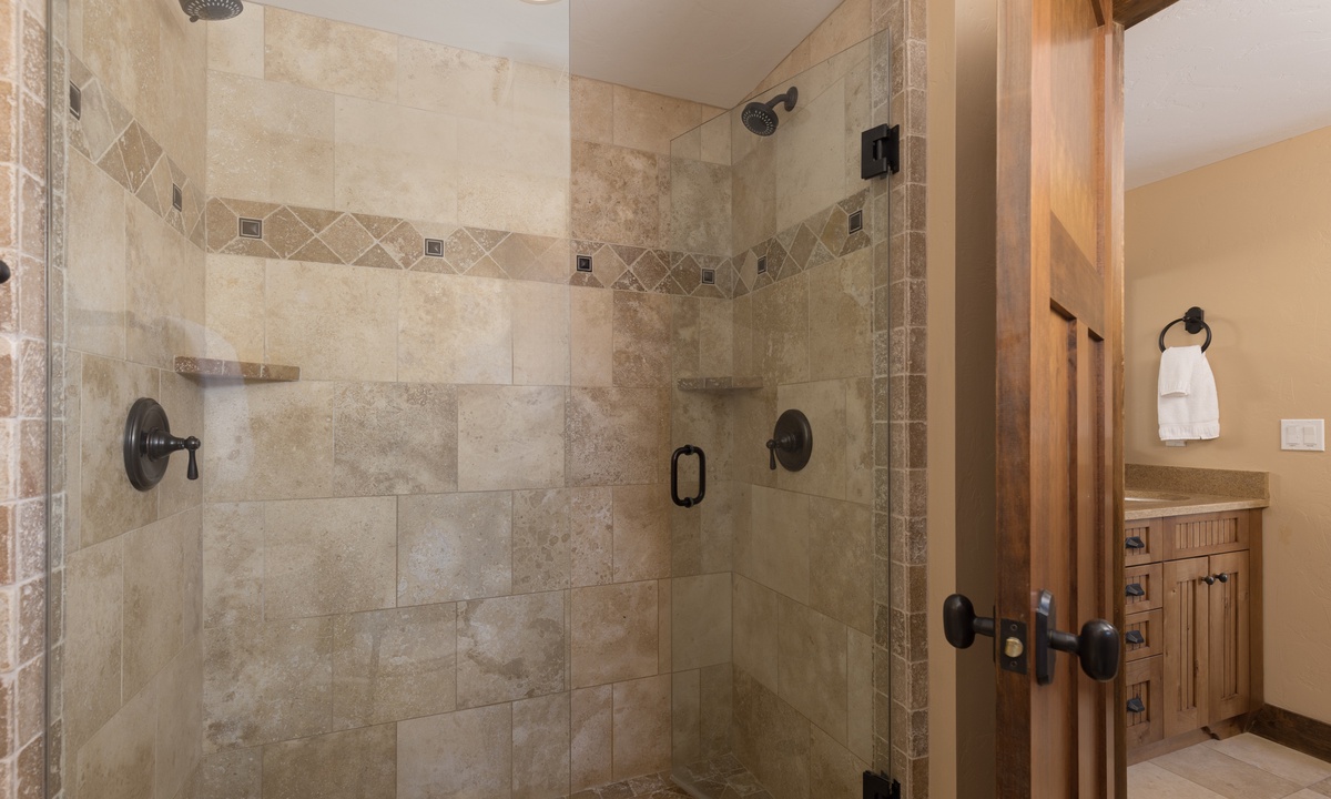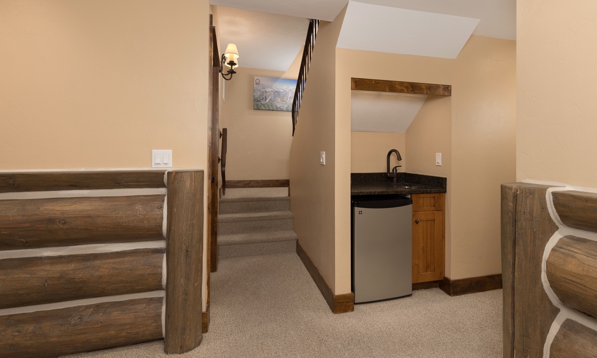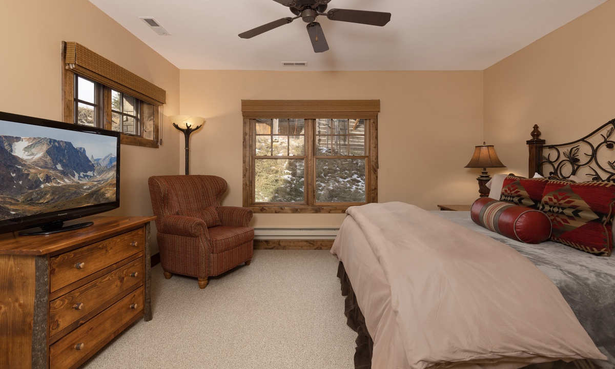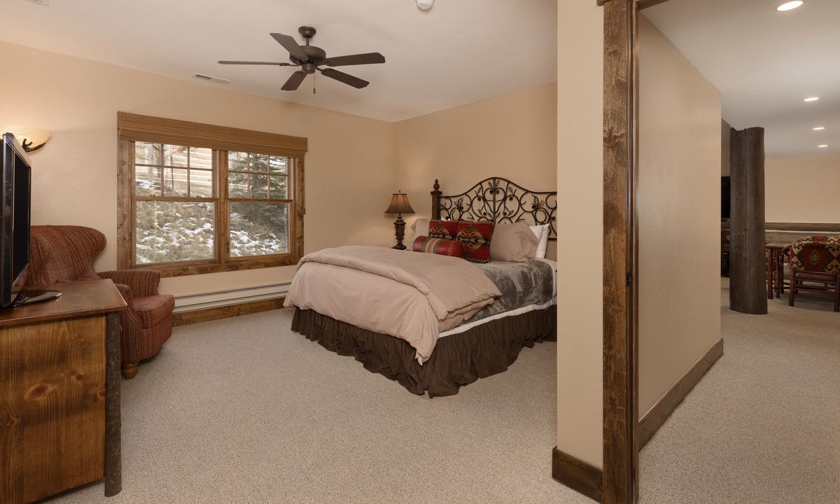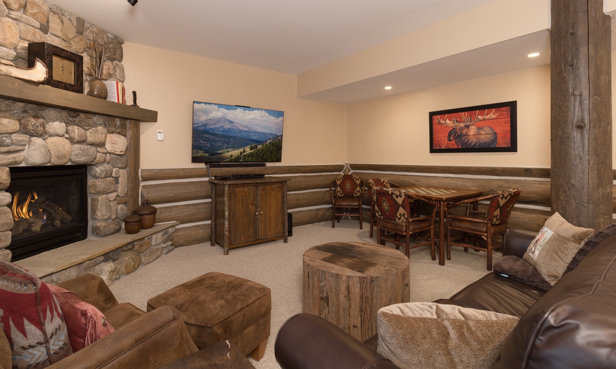 The lower level features a second living area and another bedroom. The living area features a pull-out couch, a stunning stone fireplace, and a detached bathroom. The lower-level bedroom features a king size bed and an en-suite bathroom.