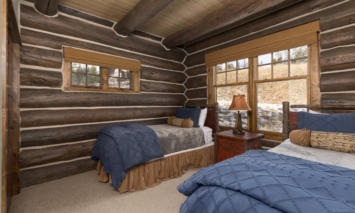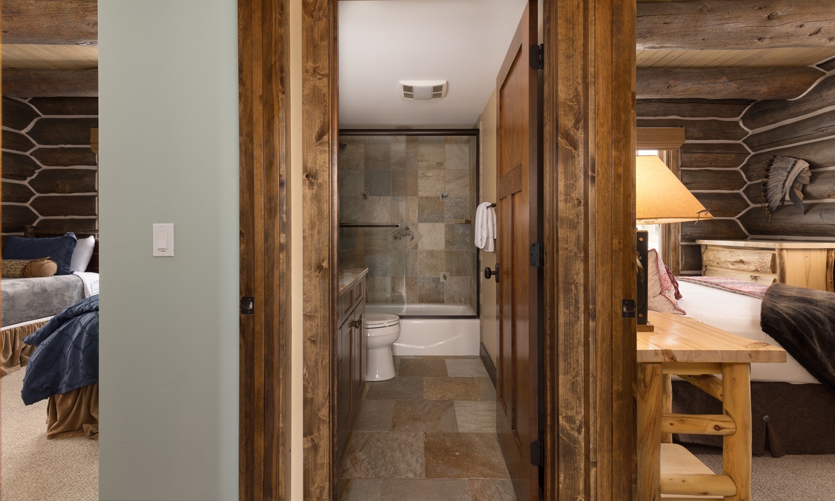 This cabin comfortably accommodates 10 guests throughout the 4 bedrooms. The main level features two bedrooms. The first bedroom features a queen size bed, plenty of storage space, and a detached full bathroom shared with the second bedroom. The second bedroom features two twin size beds and plenty of storage, perfect for children!