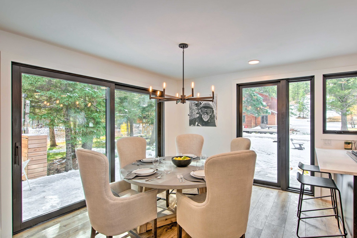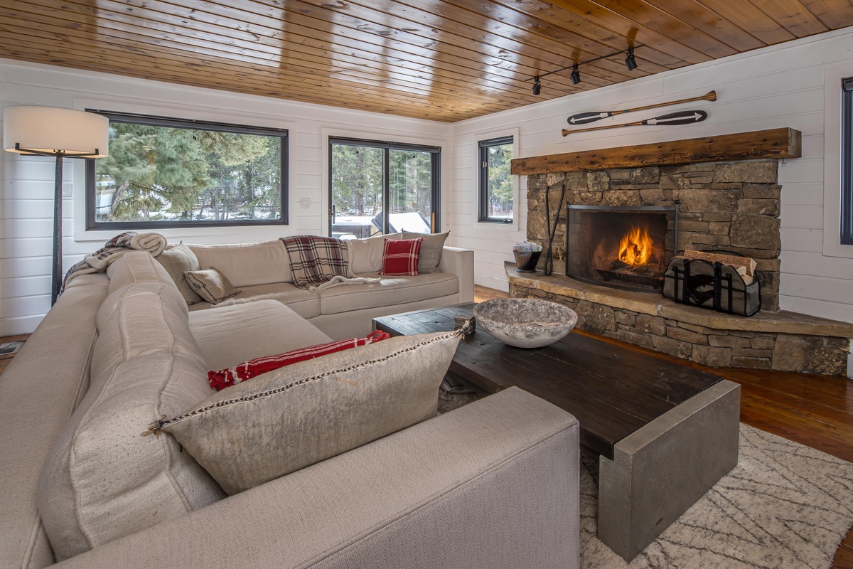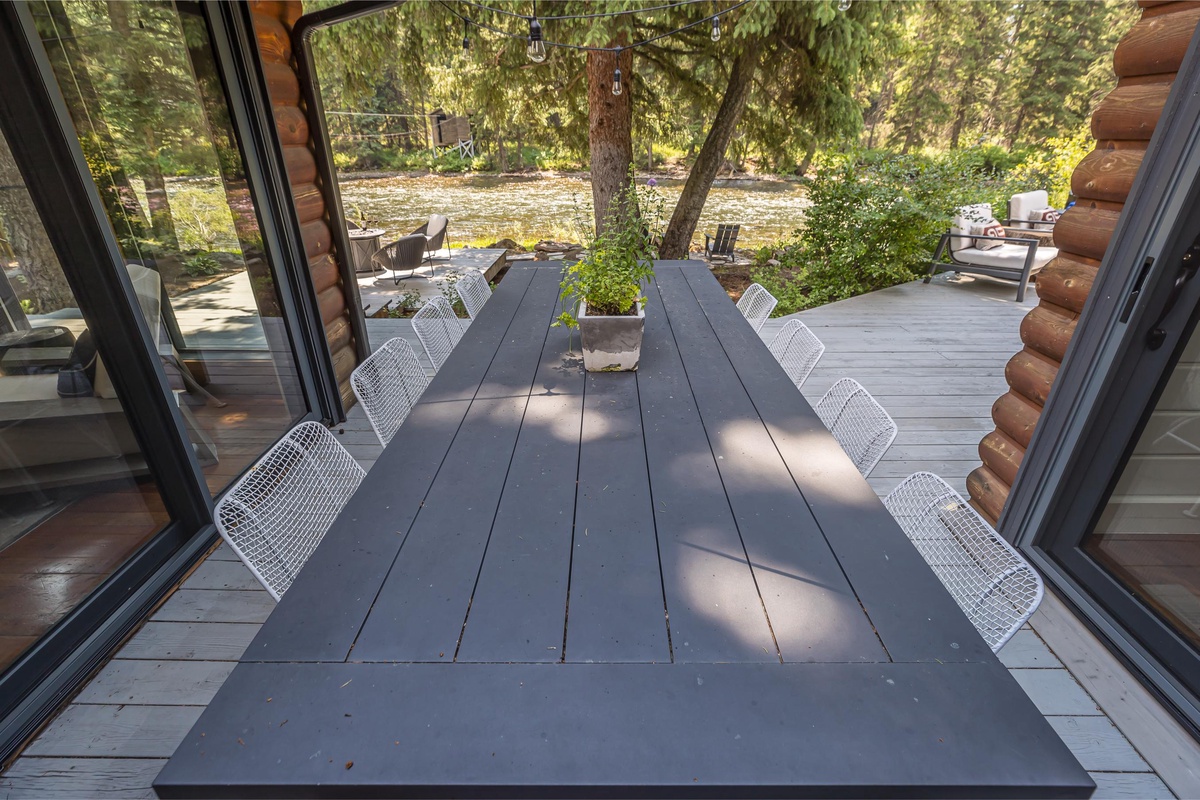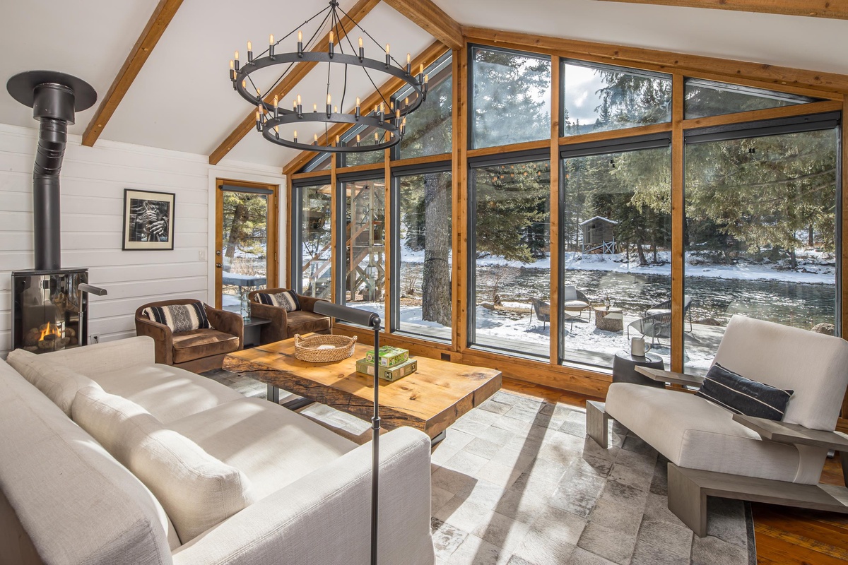 Upon entering the Main House, you're greeted by a sun-drenched day room featuring floor-to-ceiling windows that frame panoramic views of the Gallatin River. This inviting space comfortably seats eight and serves as the perfect first stop to unwind and relax after a fun day of adventuring. The open concept main level boasts a gourmet kitchen equipped with a gas range, dual ovens, and stainless steel appliances. The dining area seats eight, with additional seating for three at the breakfast bar. Head through the dining area and find the main level living room featuring an oversized sectional sofa, a stone gas fireplace, a vintage record player and soundbar, and a large flat screen TV. Through the sliding glass doors find a private hot tub with river views, outdoor seating options, and an outdoor fire pit.