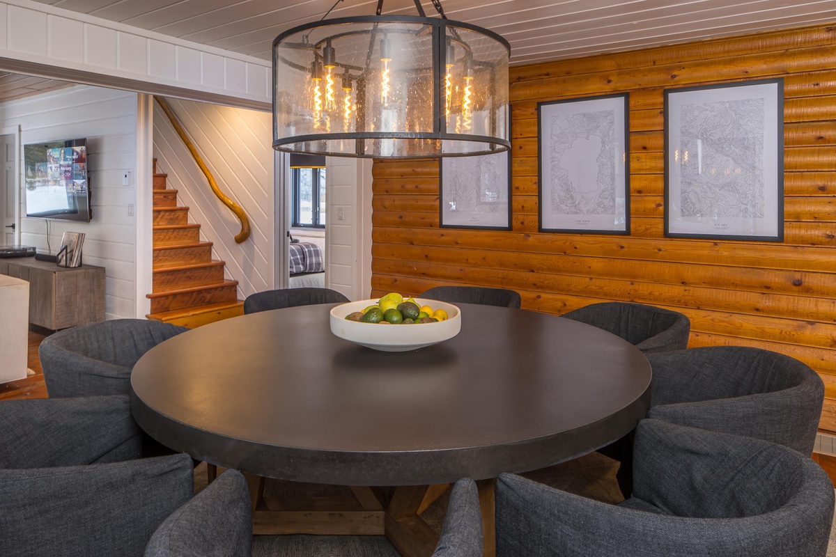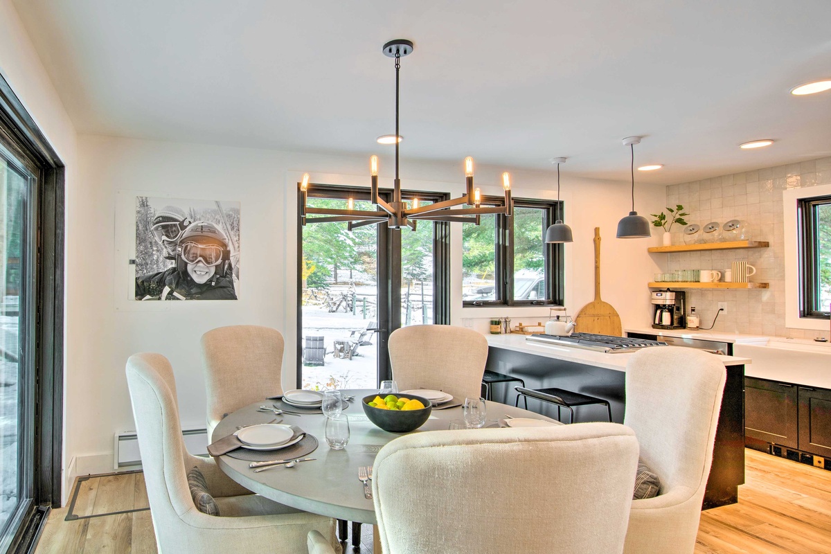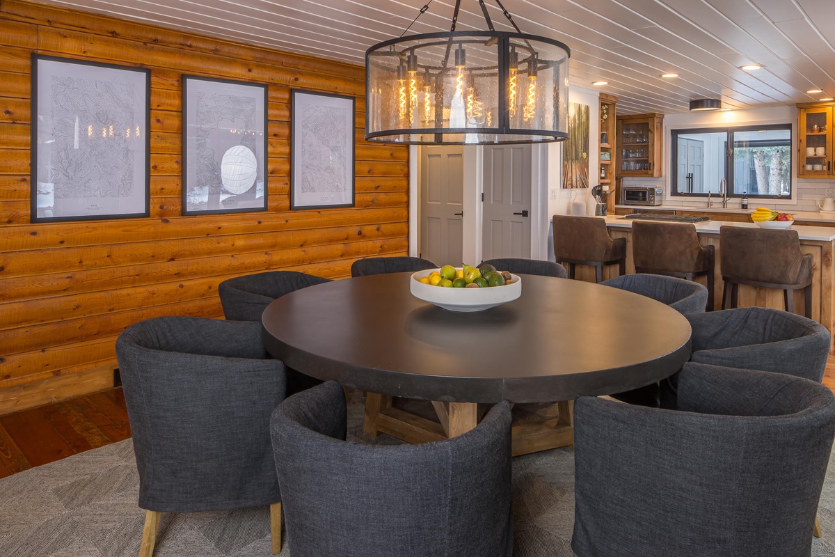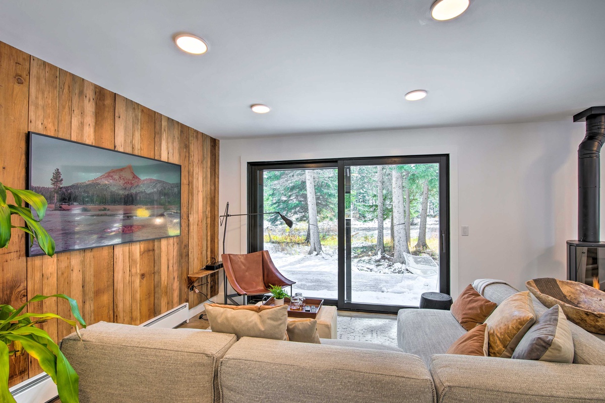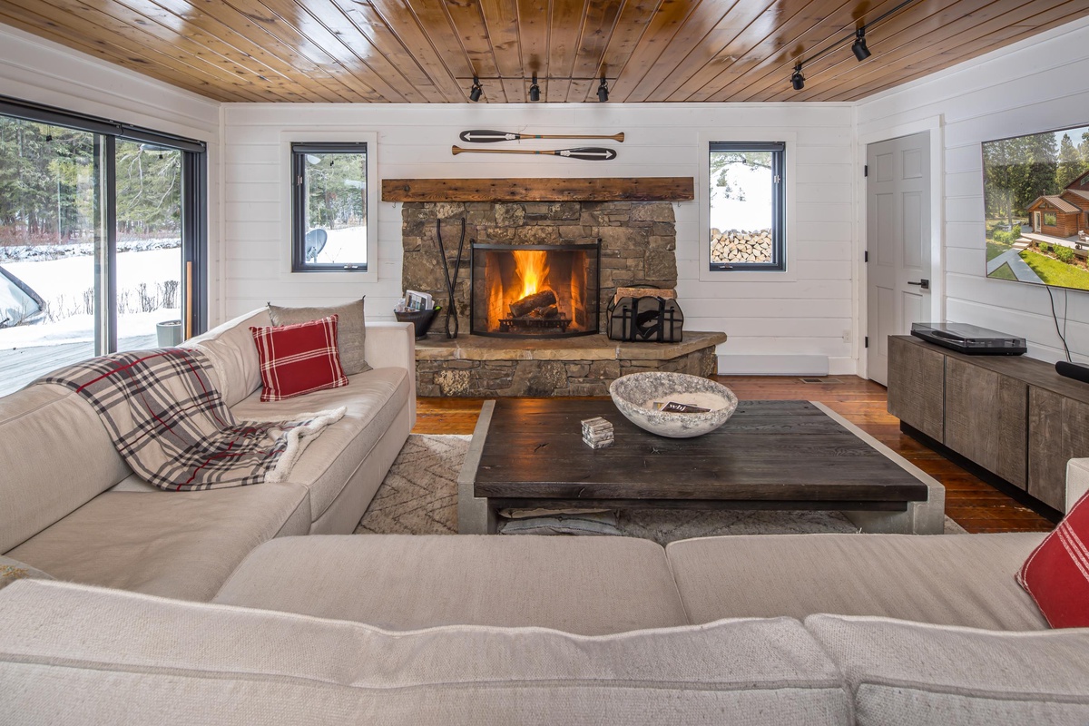 Upon entering the Main House, you're greeted by a sun-drenched day room featuring floor-to-ceiling windows that frame panoramic views of the Gallatin River. This inviting space comfortably seats eight and serves as the perfect first stop to unwind and relax after a fun day of adventuring. The open concept main level boasts a gourmet kitchen equipped with a gas range, dual ovens, and stainless steel appliances. The dining area seats eight, with additional seating for three at the breakfast bar. Head through the dining area and find the main level living room featuring an oversized sectional sofa, a stone gas fireplace, a vintage record player and soundbar, and a large flat screen TV. Through the sliding glass doors find a private hot tub with river views, outdoor seating options, and an outdoor fire pit.