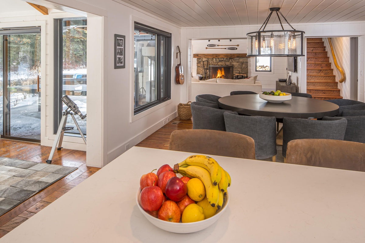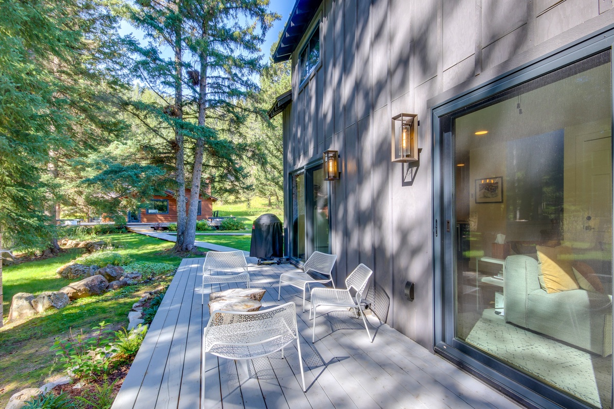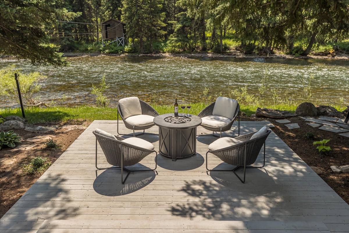 Just steps away, the separate Guest House offers its own fully equipped kitchen with a gas range, stainless steel appliances, and a farmhouse sink. When you’re ready to dine, pull up a chair at the dining room table, or take a seat at the breakfast bar with seating for two. The main level easily flows into the living room, featuring a cozy sectional sofa, river views, and a flat screen TV. Head through the sliding glass doors and find an additional outdoor seating area complete with outdoor furniture and a private fire pit.