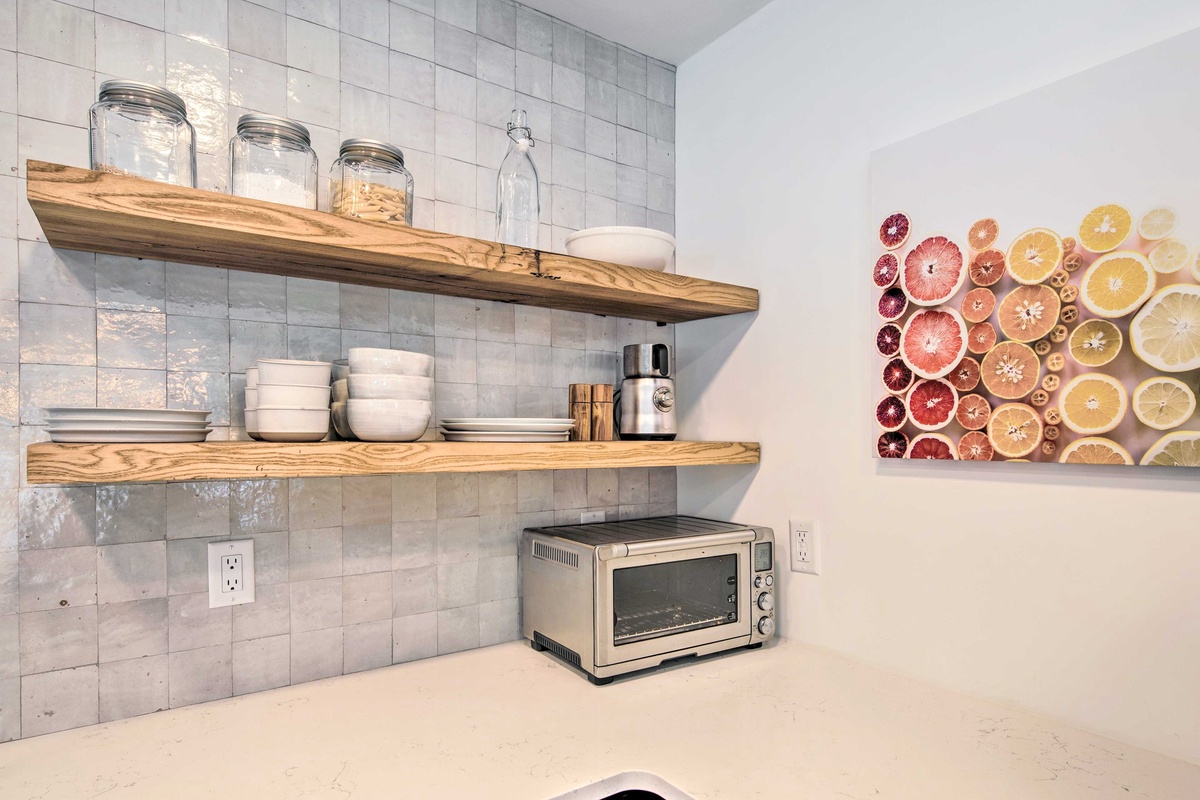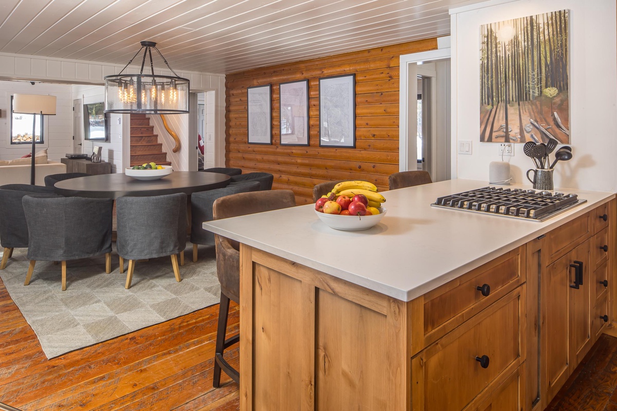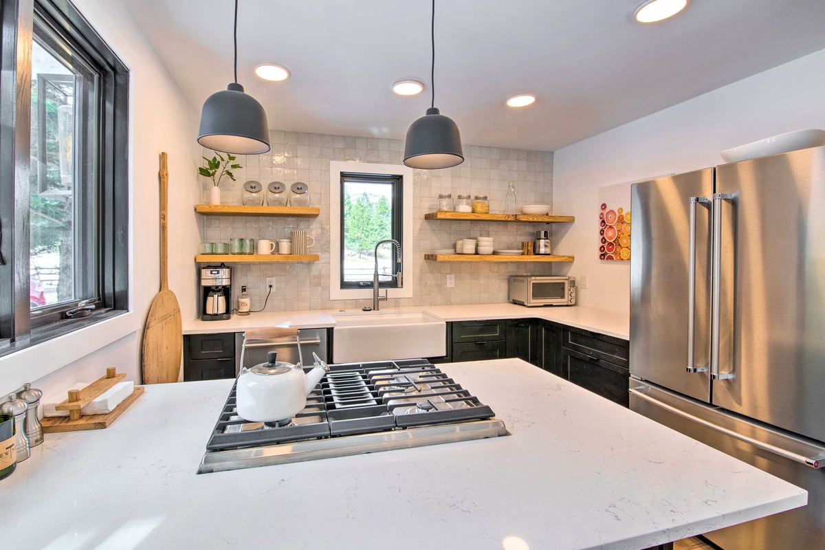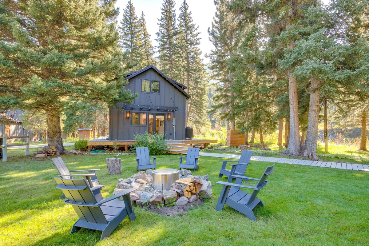 Just steps away, the separate Guest House offers its own fully equipped kitchen with a gas range, stainless steel appliances, and a farmhouse sink. When you’re ready to dine, pull up a chair at the dining room table, or take a seat at the breakfast bar with seating for two. The main level easily flows into the living room, featuring a cozy sectional sofa, river views, and a flat screen TV. Head through the sliding glass doors and find an additional outdoor seating area complete with outdoor furniture and a private fire pit.