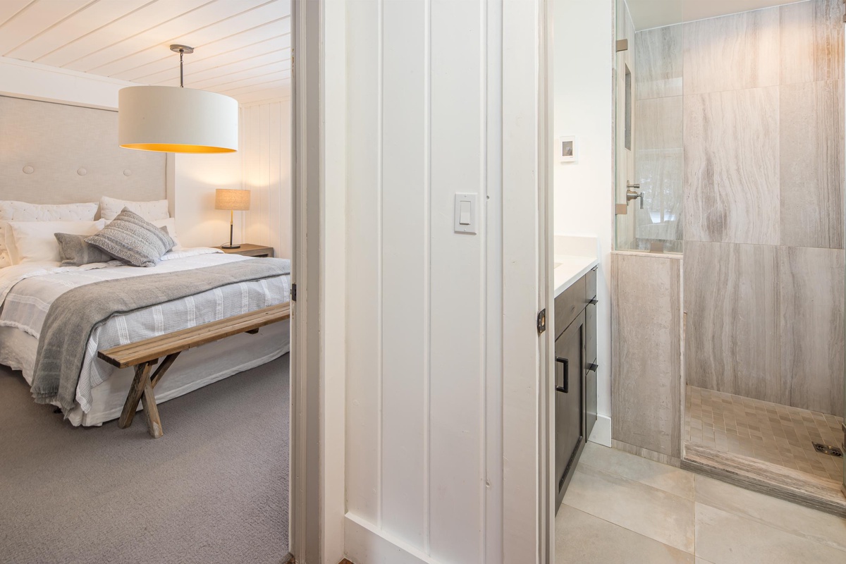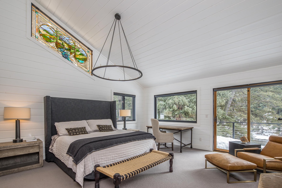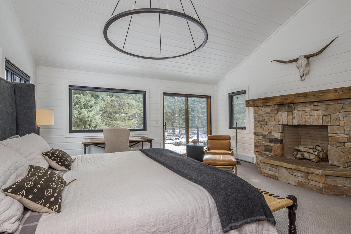 Ready to rest easy? The main house features three bedrooms, two on the main level and one on the upper level. On the main level, find the first King Bedroom featuring countryside views, high-end bedding, and a spacious closet. Also on this level you’ll find the Queen Bedroom and a shared full bathroom with a stand-up rainfall shower accessed through the hallway. Upstairs, the entire upper level is dedicated to the impressive Primary King Suite, featuring an ornamental stone fireplace, intricate stained glass windows, a desk for remote work, and a private balcony. Sliding glass doors open from this Suite out onto a private deck with breathtaking views of the Gallatin River. Head back inside to find an expansive closet that wraps around and leads into an attached ensuite bathroom featuring high-end finishes, dual vanity sinks, and a stand-up rainfall shower.