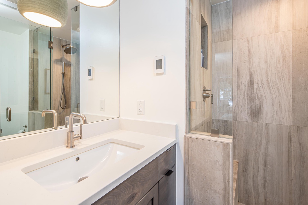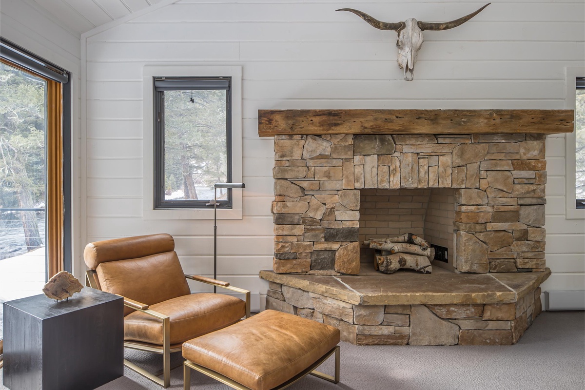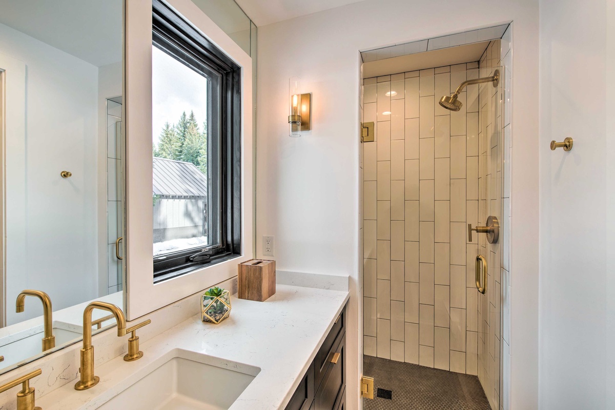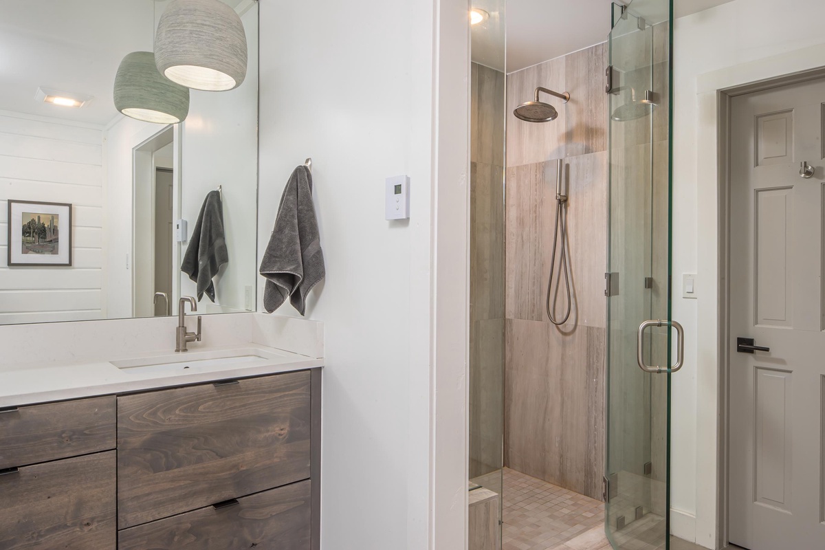 Ready to rest easy? The main house features three bedrooms, two on the main level and one on the upper level. On the main level, find the first King Bedroom featuring countryside views, high-end bedding, and a spacious closet. Also on this level you’ll find the Queen Bedroom and a shared full bathroom with a stand-up rainfall shower accessed through the hallway. Upstairs, the entire upper level is dedicated to the impressive Primary King Suite, featuring an ornamental stone fireplace, intricate stained glass windows, a desk for remote work, and a private balcony. Sliding glass doors open from this Suite out onto a private deck with breathtaking views of the Gallatin River. Head back inside to find an expansive closet that wraps around and leads into an attached ensuite bathroom featuring high-end finishes, dual vanity sinks, and a stand-up rainfall shower.