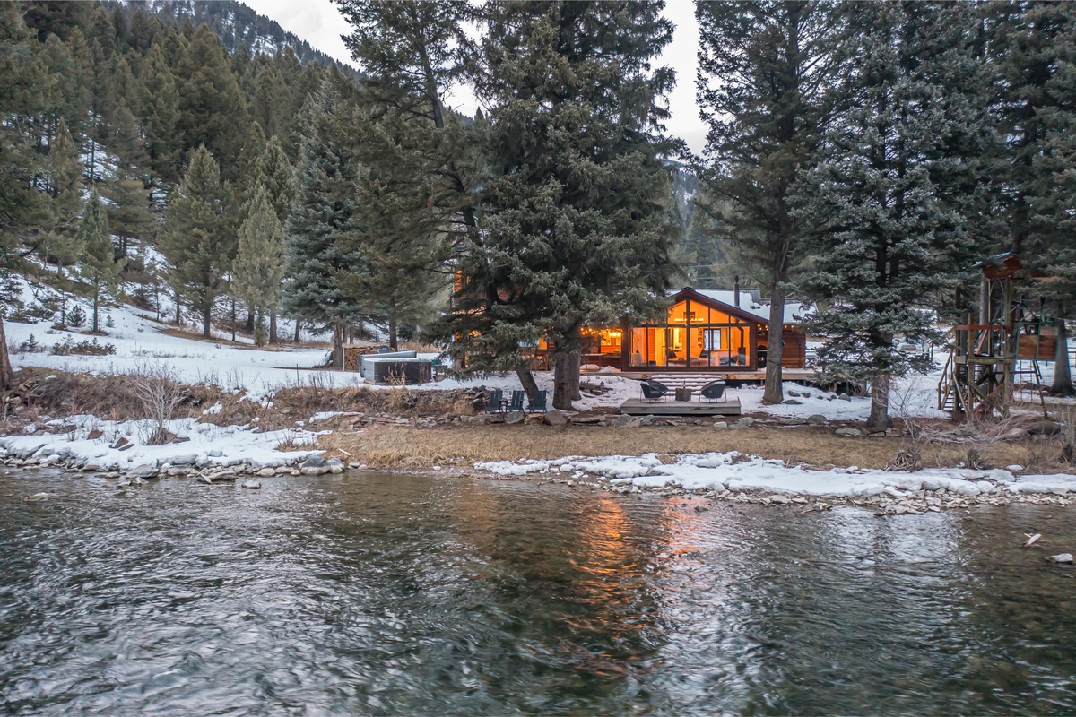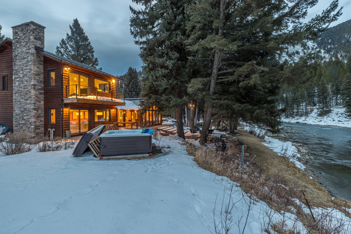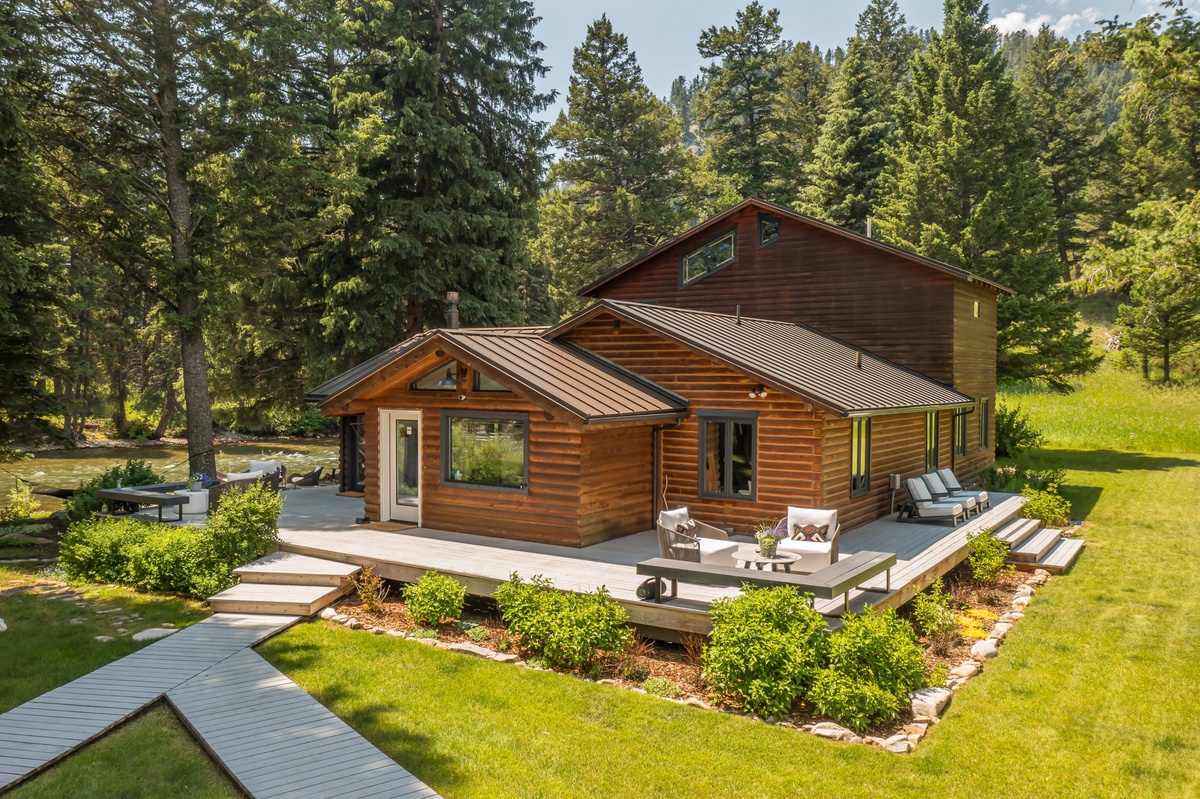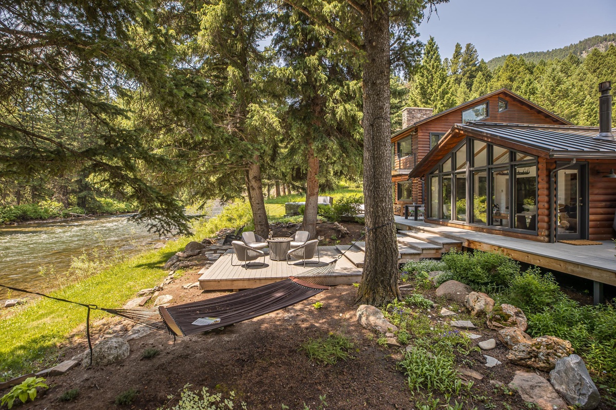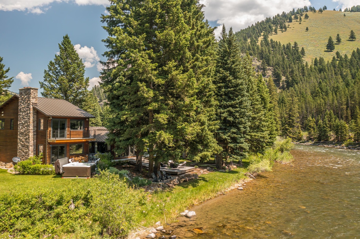Sink into serenity at Riverbend Haven, a custom built riverfront estate on the Gallatin River in Big Sky. Spanning over seven acres, this expansive property boasts the Main House featuring three bedrooms and is complemented by a Guest House hosting two more bedrooms, sleeping 11 total guests throughout both houses. This unique property showcases sweeping mountain views and unbeatable riverfront access while also featuring luxe and thoughtful interior design and can host year-round fun for your group. In the warmer months, enjoy easy fishing access on the Gallatin River, nearby hiking & mountain biking, and proximity to Yellowstone National Park. In winter, Riverbend Haven is just a short drive to Big Sky Resort, offering world class skiing, snowboarding, and other winter activities.