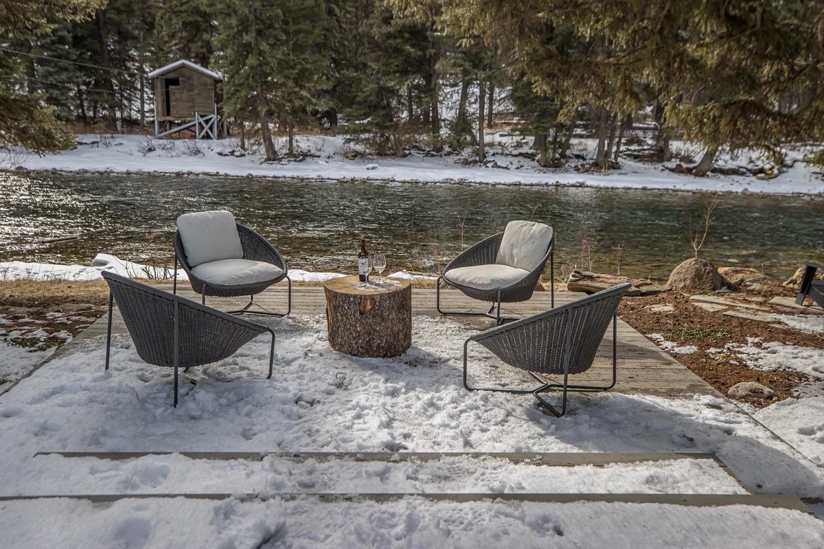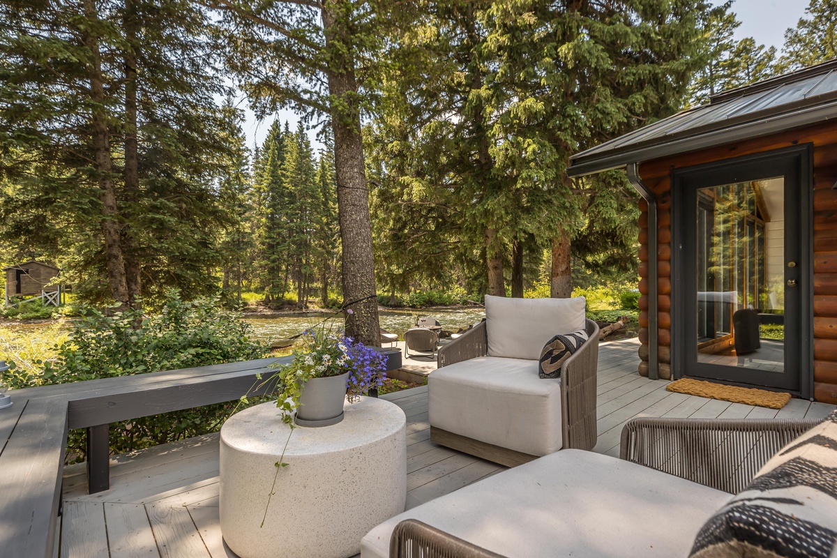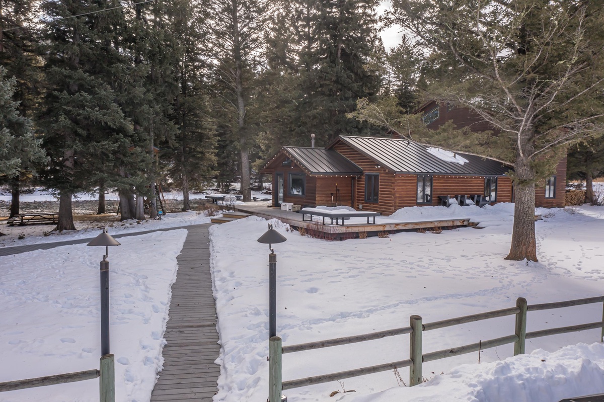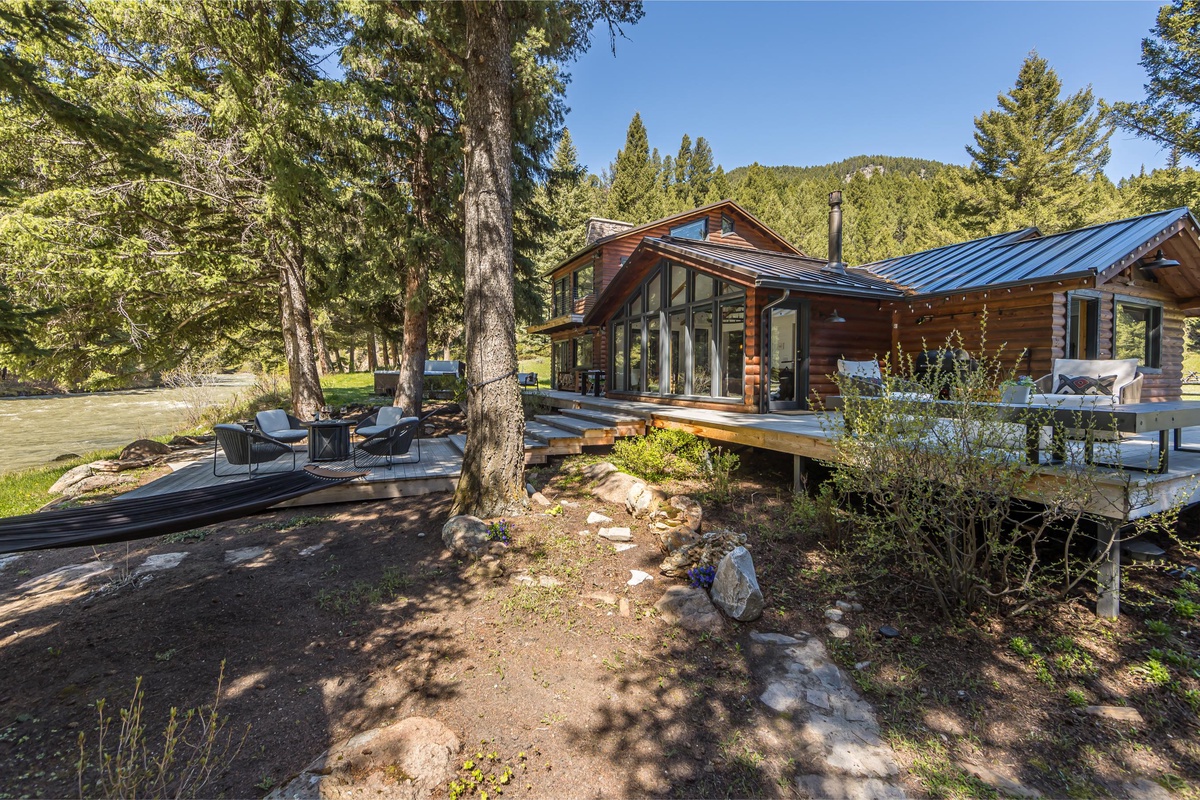 Sink into serenity at Riverbend Haven, a custom built riverfront estate on the Gallatin River in Big Sky. Spanning over seven acres, this expansive property boasts the Main House featuring three bedrooms and is complemented by a Guest House hosting two more bedrooms, sleeping 11 total guests throughout both houses. This unique property showcases sweeping mountain views and unbeatable riverfront access while also featuring luxe and thoughtful interior design and can host year-round fun for your group. In the warmer months, enjoy easy fishing access on the Gallatin River, nearby hiking & mountain biking, and proximity to Yellowstone National Park. In winter, Riverbend Haven is just a short drive to Big Sky Resort, offering world class skiing, snowboarding, and other winter activities.